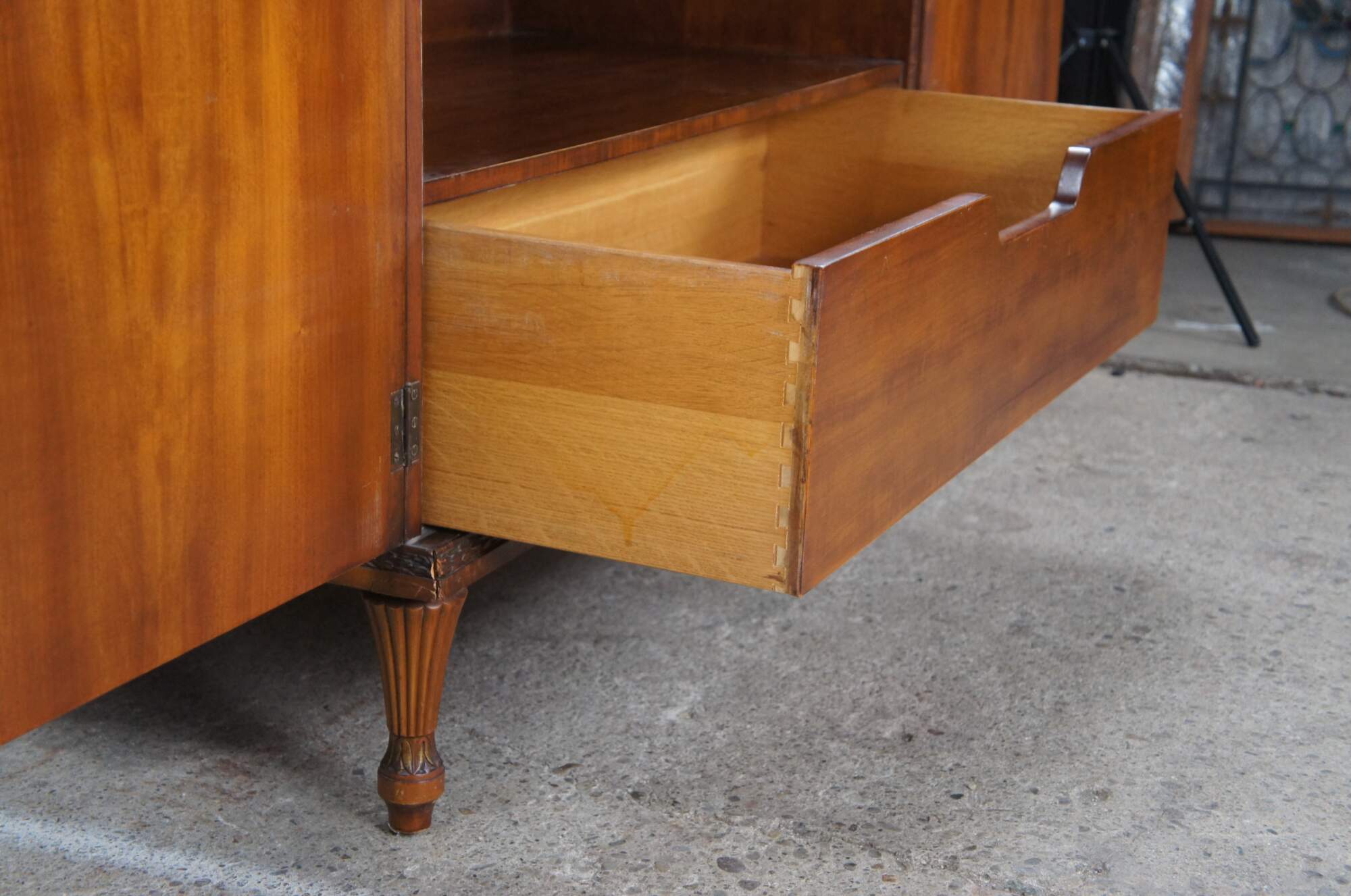 Antique satinwood buffet / cabinet / sideboard / console / Credenza / Huntboard featuring Italian Neoclassical and Art Deco styling with inlaid sunburst / starburst veneer surrounded by hand painted floral wreath with ribbons, bows and pinwheels. Marked Aspen 6276 along backside. The case is supported be reeded and tapered feet beneath a sheath apron. Include glass top with polished edge.