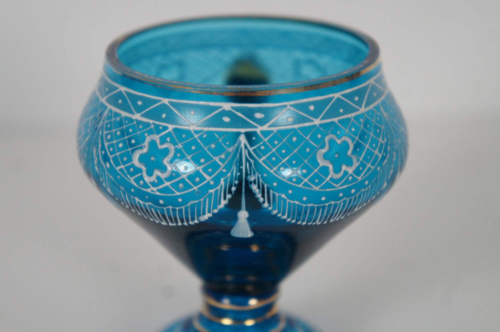 Vintage Moser Bohemian blue glass demitasse teacup and saucer featuring gold and white painted details.