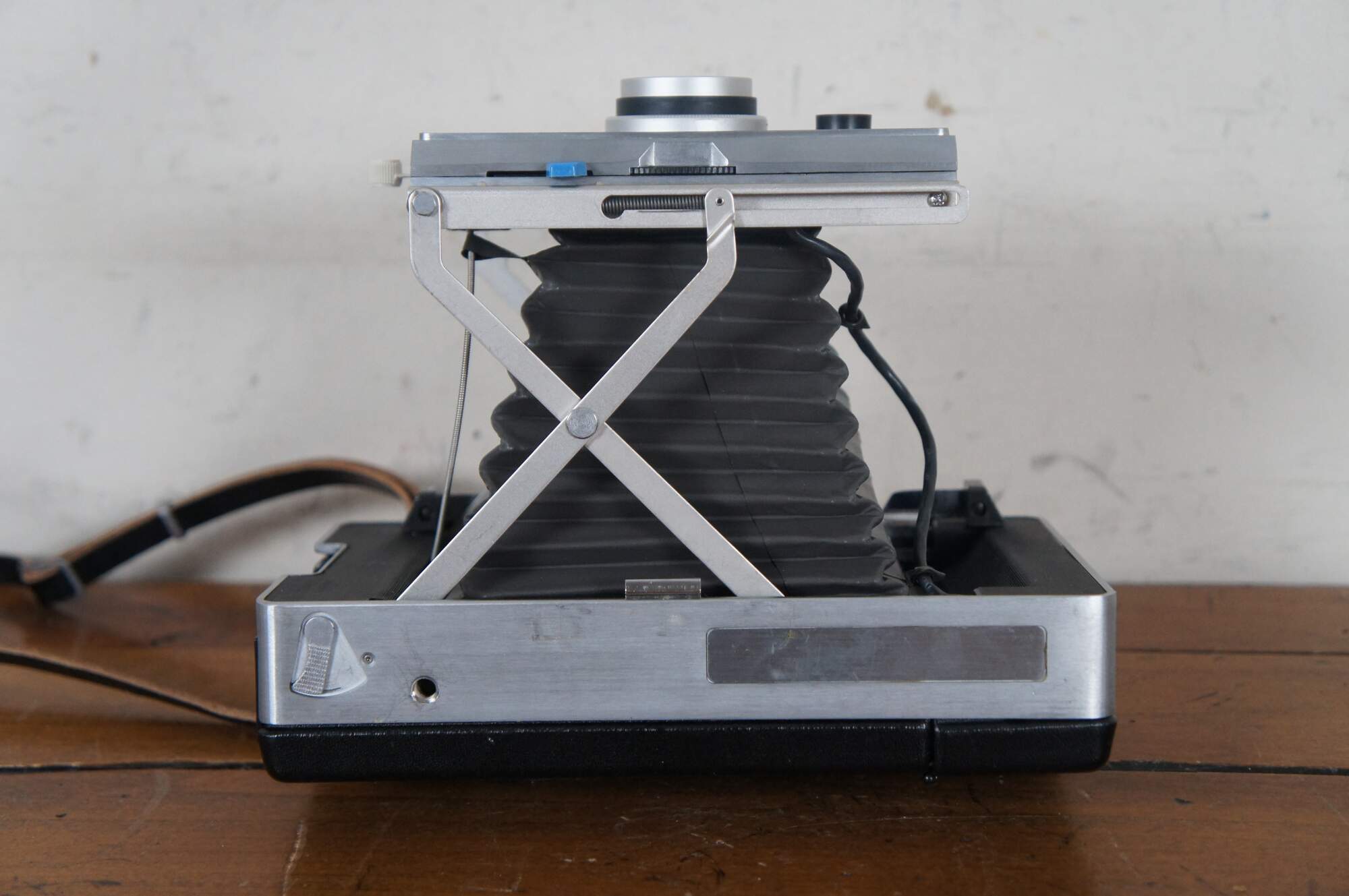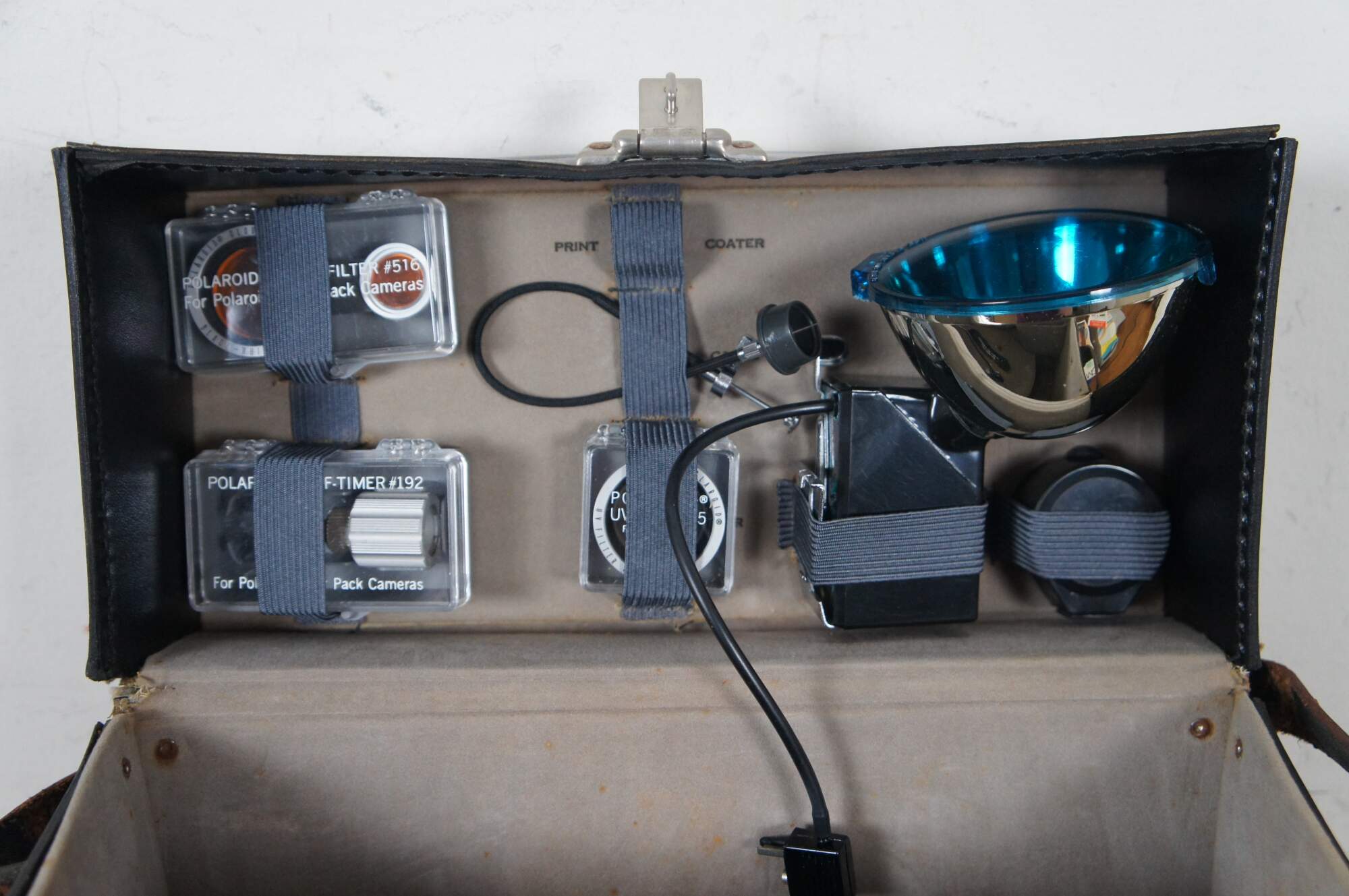 Circa 1960s Polaroid Auto 100 land camera. Comes with locking Fitted Compartment Case 324 and key, instruction booklets, Cold Clip #193, Portait Attachment #581, Self Timer #192, UV Filter #585, Cloud Filter #516, remote shutter cable, #128 Development Timer, flash attachment, un-opened pack Polacolor Instant Pack Film 108, un-opened pack GE M3 Flashbulbs, one un-opened and one opened pack Sylania Blue Dot Flashbulbs.