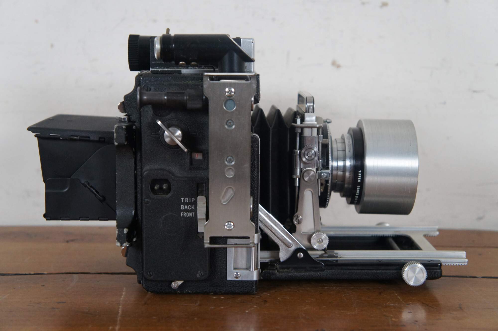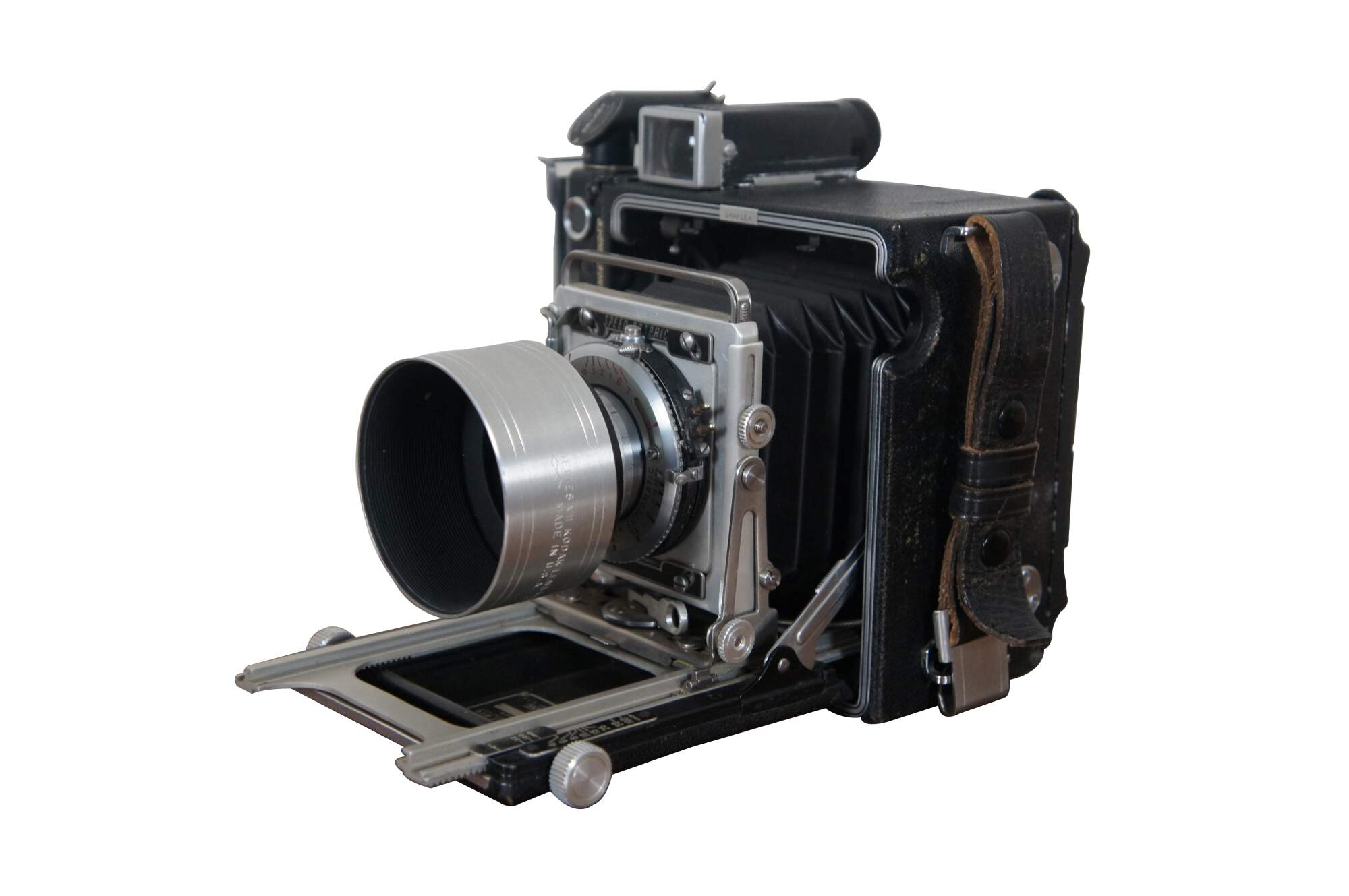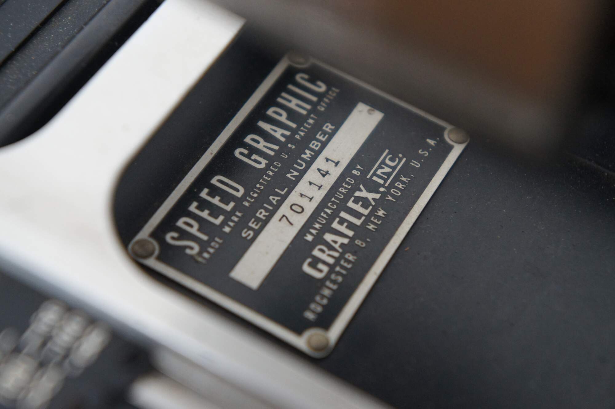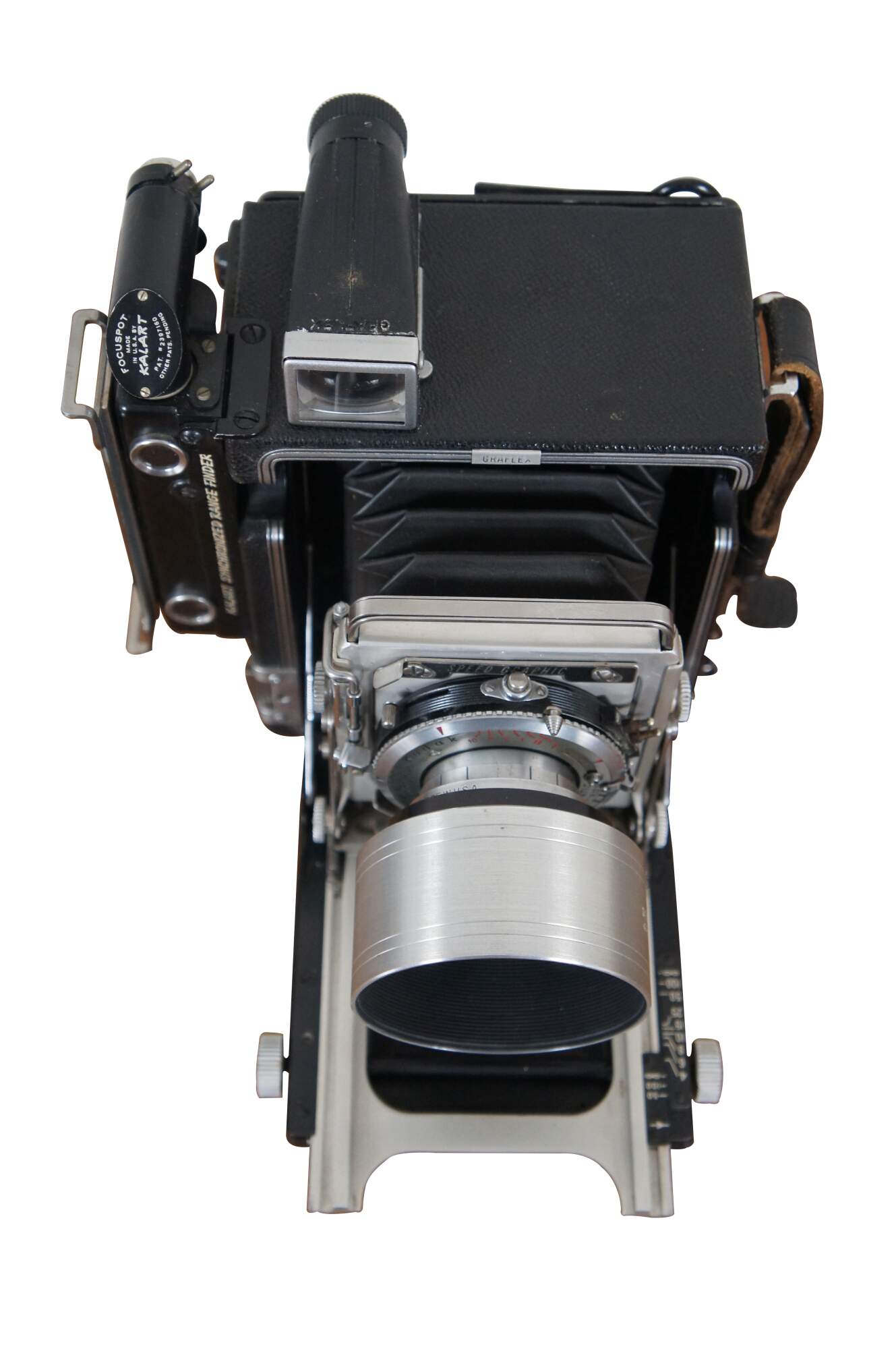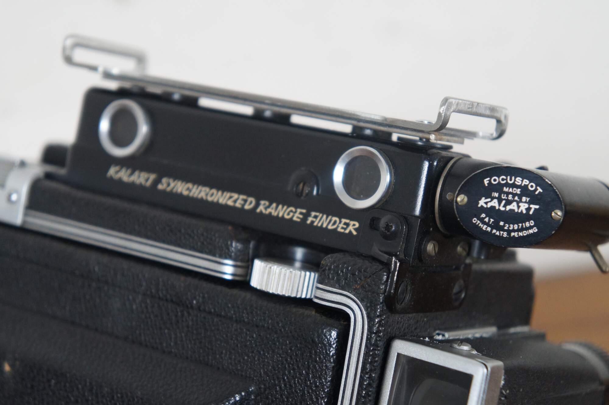 Vintage Graflex Speed Graphic camera with Kodak Ektar 3.7 105mm lens. Comes with Kalart Focuspot sychronized range finder. Contemporary case with 2 new straps/key sets; 14 Lisco Regal 2 1/4 x 3 1/4 Cut Film Holders; 2 Graflex "23" Graphic Roll Film Holders Cat. No. 1246; un-opened Kodak Tri-X Pan Professional 5 Rolls TXP 120 black and white film; un-opened Kodak Tmax 400 TMY 120 black and white negative film; Series VII Kodak Lens Hood; Tiffen Series #6 to 7 Step-Up Ring; Kodak Series VI Adapter Ring 1 1/2 in - 38mm; Kodak Ektar f:3.7 105mm ES 2504 lens; Kodak Wratten Filter Series 7 K2-#8; Weston Master III Universal Exposure Meter Model 737 Serial #1236449 & Case; Weston Master V Universal Exposure Meter Model 748 Serial #HB773