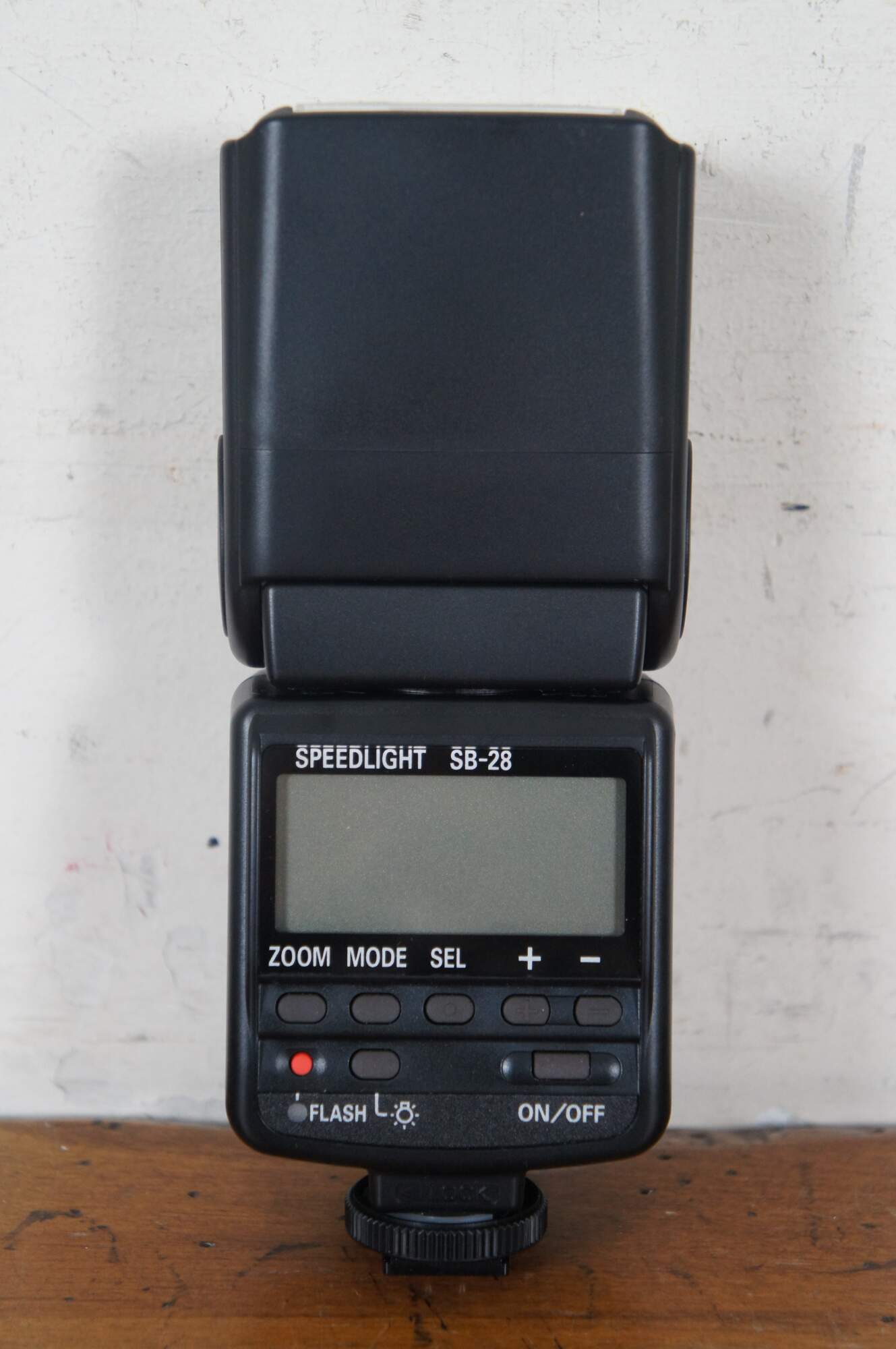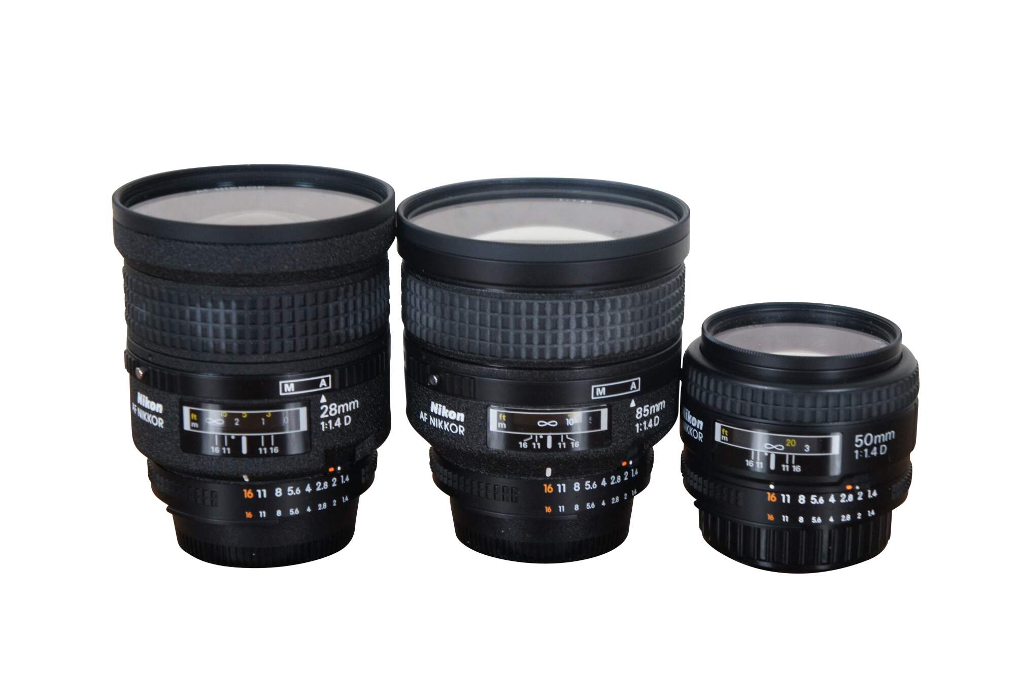 Vintage Nikon camera lens lot. Comes with Lightware case, 3 Nikon AF Nikkor 1:1.4D lenses (28mm, 85mm, and 50mm), Nikon Speedlight SB-28 flash, 4 Nikon lens hoods (HN-31, HK-&, HN-1, and HR-2 55/1.2 R8), 3 Nikon L37c filters / diffusers (52mm, 72mm, and 77mm)