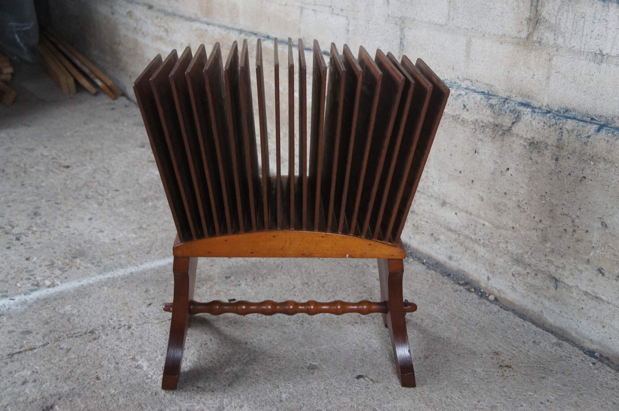 An intriguing vintage magazine / newspaper rack, circa 1970s. Handmade from oak with with 18 slots over and early america and craftsman style base. Features a turned trestle support.