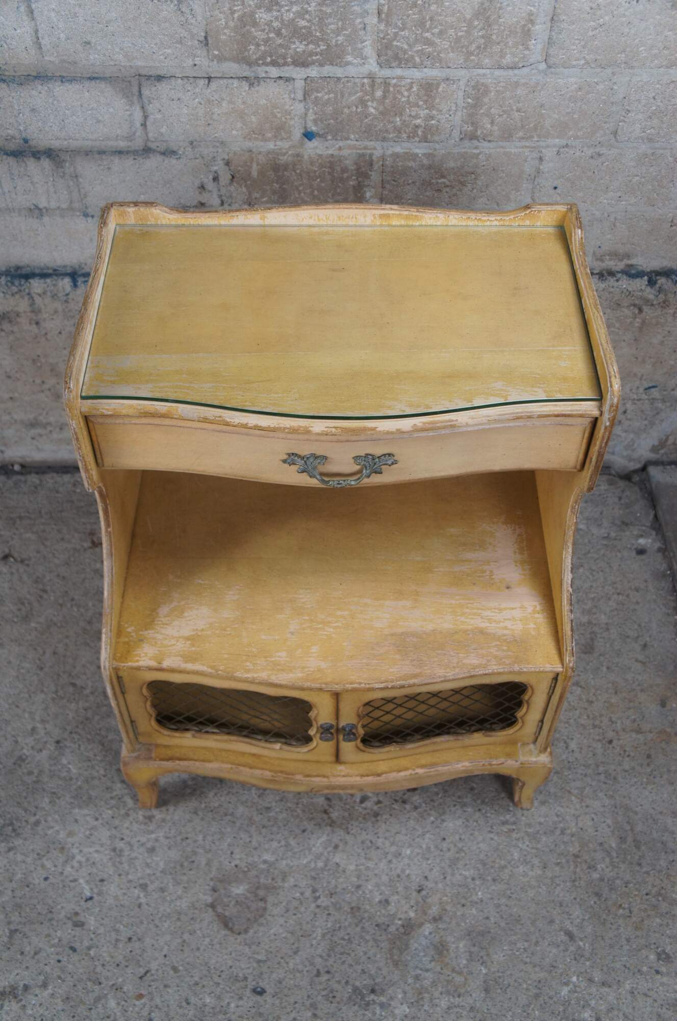 Two mid century French Provincial nightstands featuring lattice door cabinet, two tiers, drawers and upper gallery. Includes glass top. Attributed to Bethlehem Furniture Co. A great candidate for refinishing or painting.