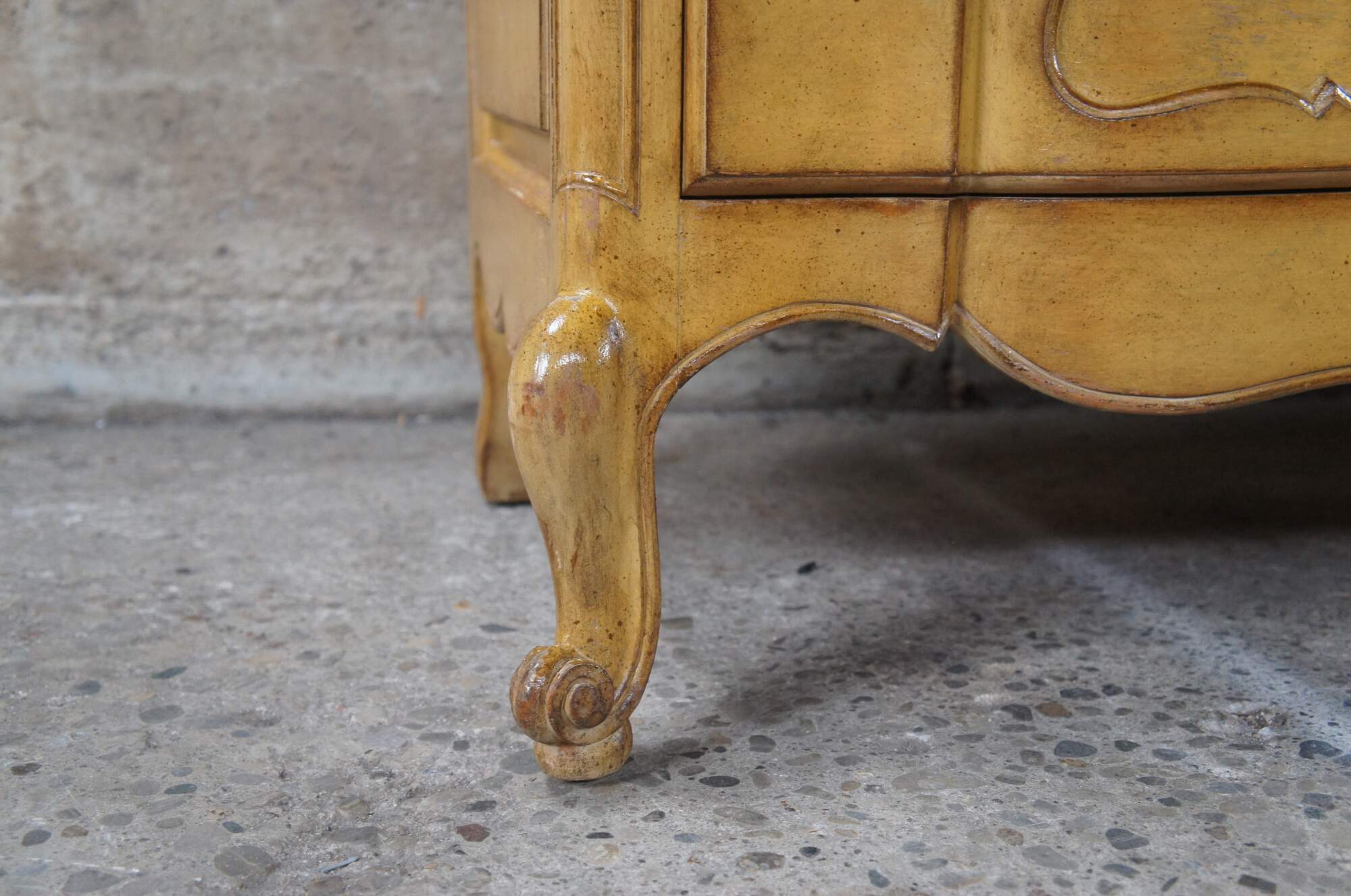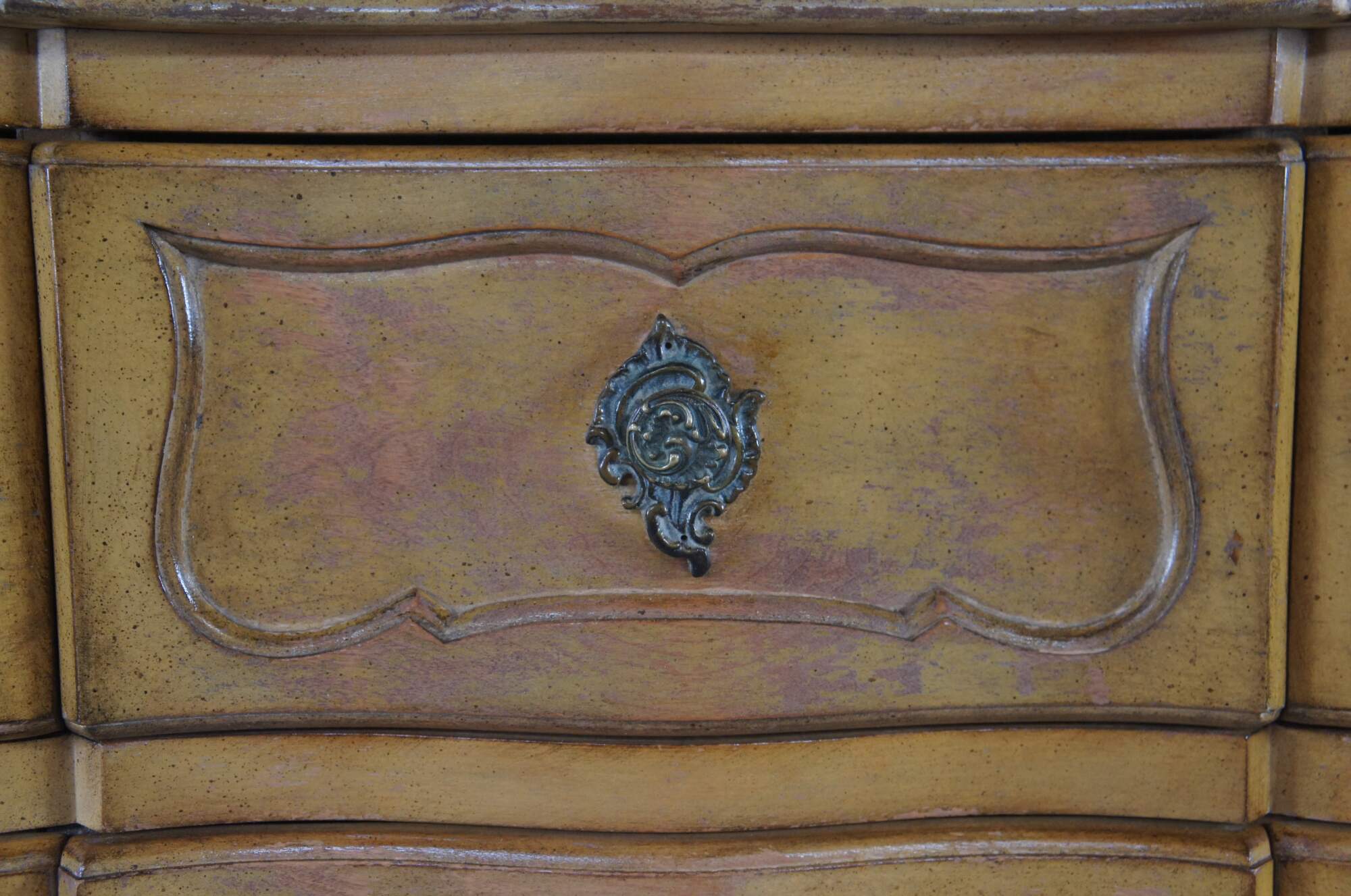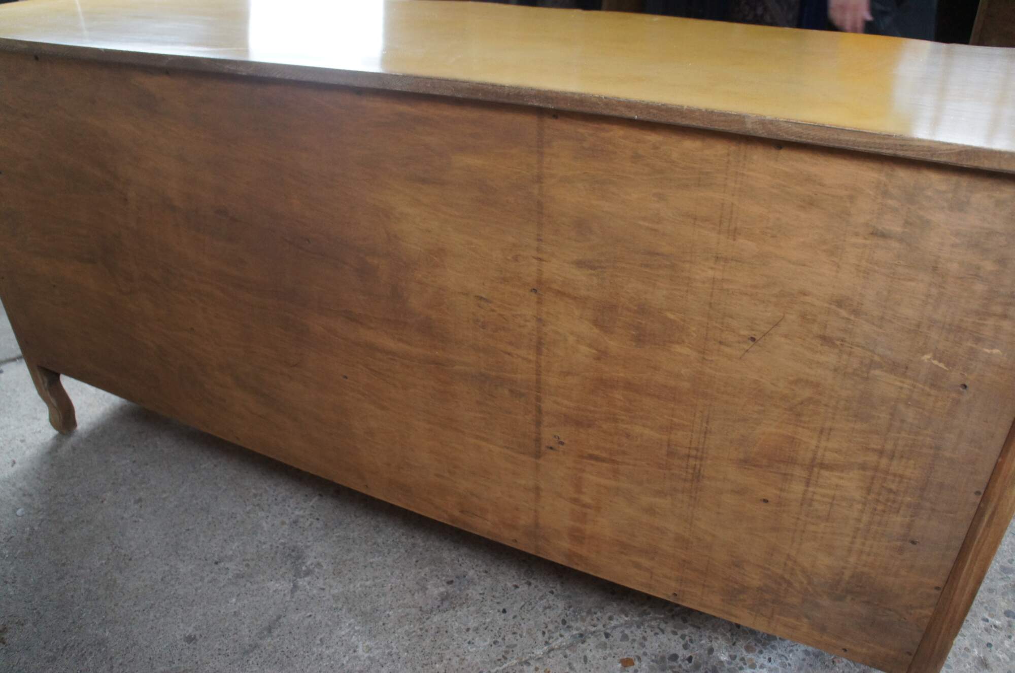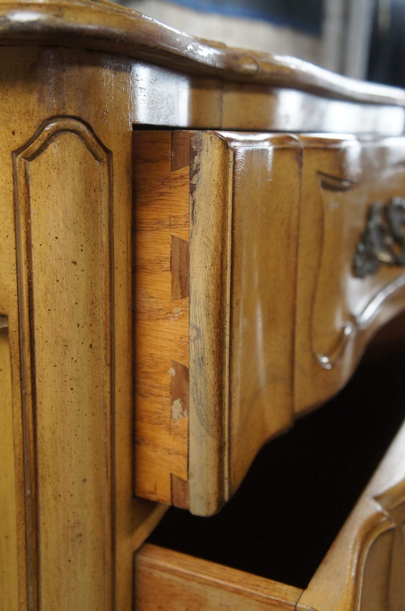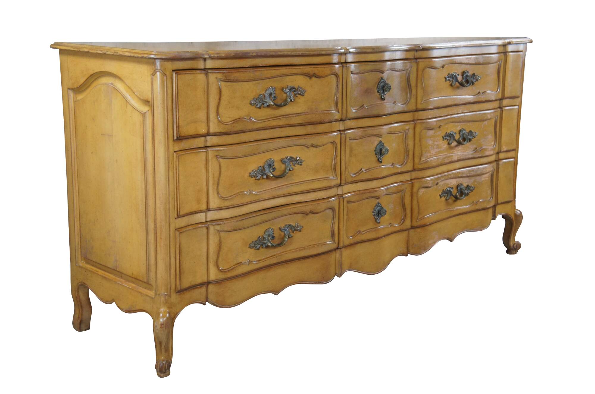 A stout mid century French Provincial dresser featuring serpentine form with nine dovetailed oakdrawers, paneled accents and cabriole legs. Attributed to Bethlehem Furniture Co.