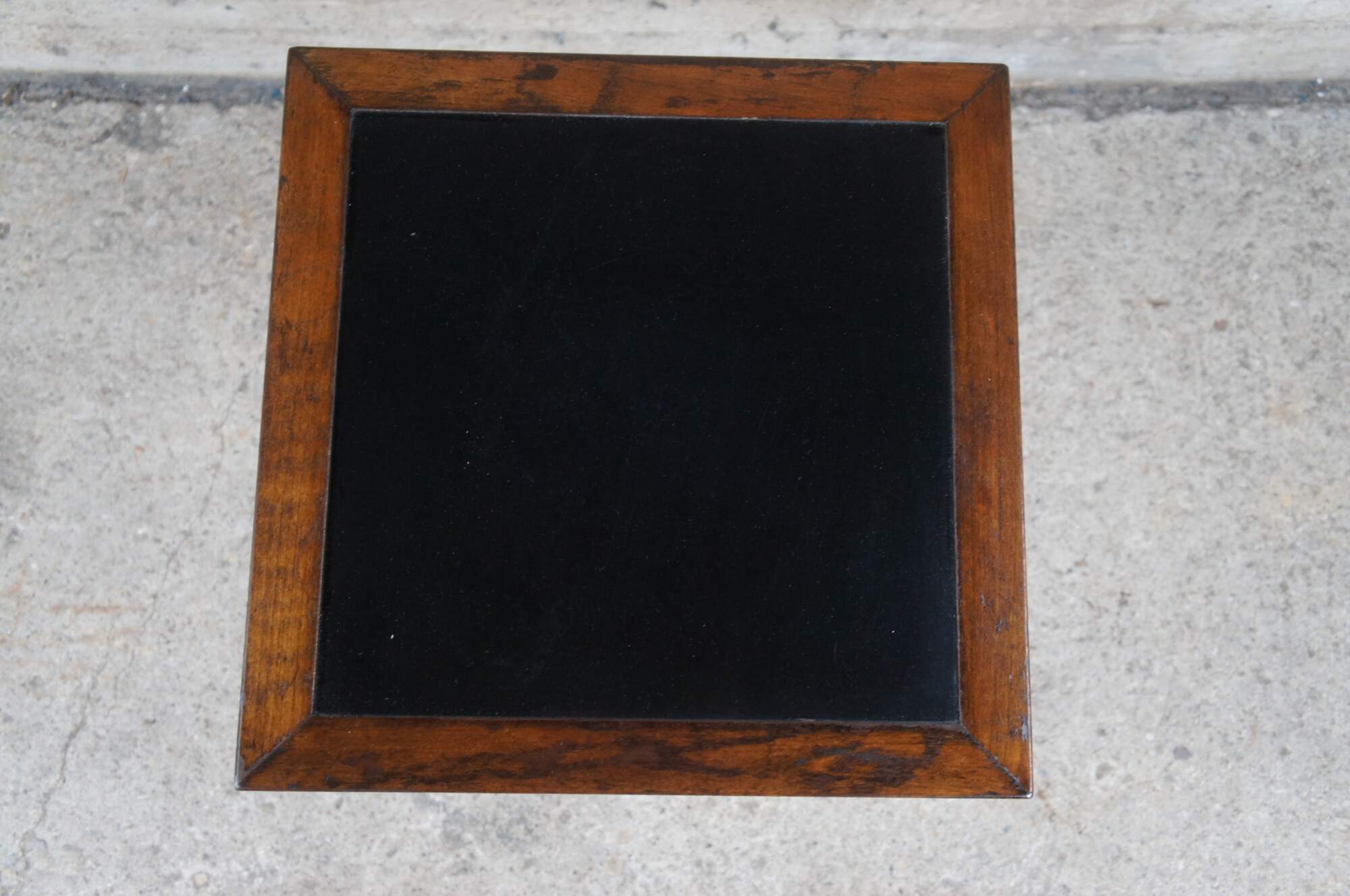 Vintage Statton Trutype Americana collection side table or plant stand. Made of oak featuring turned supports with a black formica inset top.