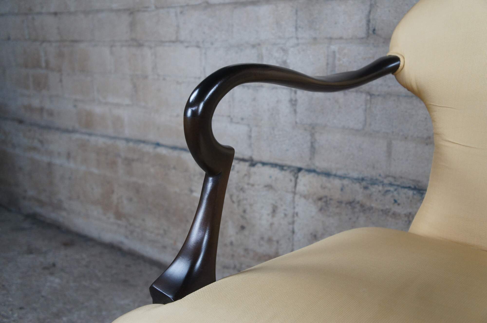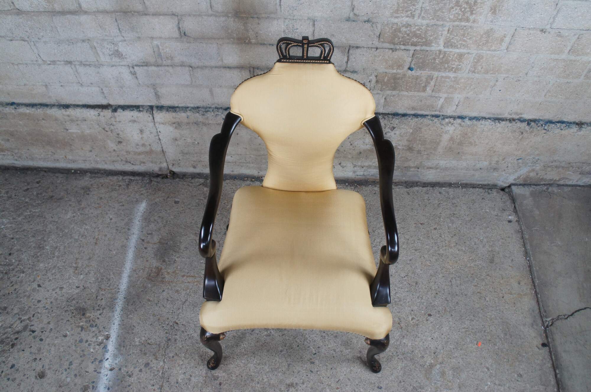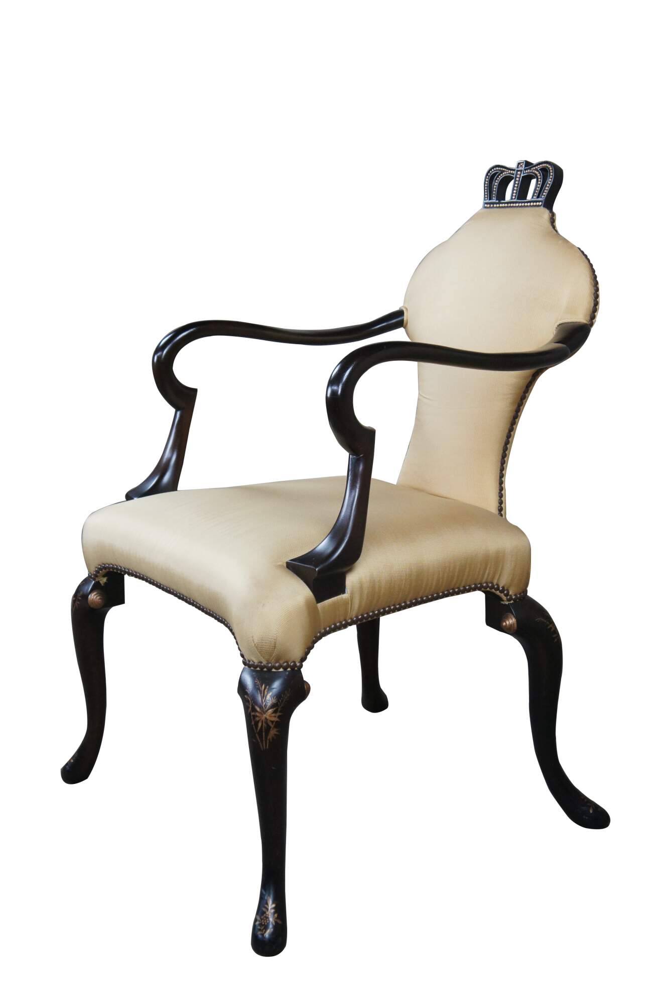 A Queen Anne Chair with an upholstered back in lieu of a splat. Elongated shepherd's crook (gooseneck) arm. Distinctive cabriole legs, with unusual splayed back legs. Nailhead trim. This chair owes to Lord Middleton and the family's home at Wollaton Hall - a Tudor palace filled with the work of Robert Adam, Thomas Chippendale and England's well - known portraitists. The crown suggests that it was made for the visit by the royal family. Ideal at a desk or positioned as a piece of sculpture. Gold decorated trim accents on crown and legs (5139D, inset). Circa 1710. No. BA5139