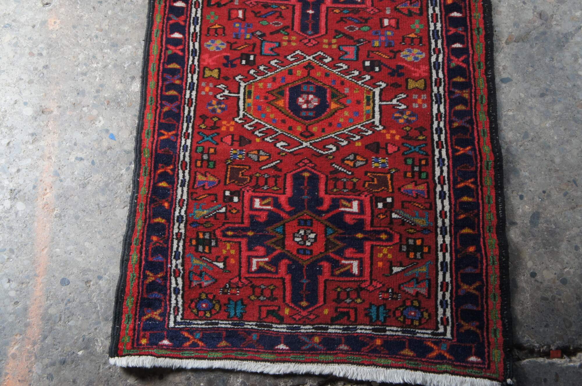 Post WWII NW Persian Vintage rug runner or mat from the Heriz-Karadja villages area, circa 1950-60s. Features 100% wool pile and geometric designs of blues, purples, orange, browns, grey, beige, green, gold and yellow over a field of red. Made with a depressed weave structure and synthetic dyes. A rug that was built to last. Made in Iran