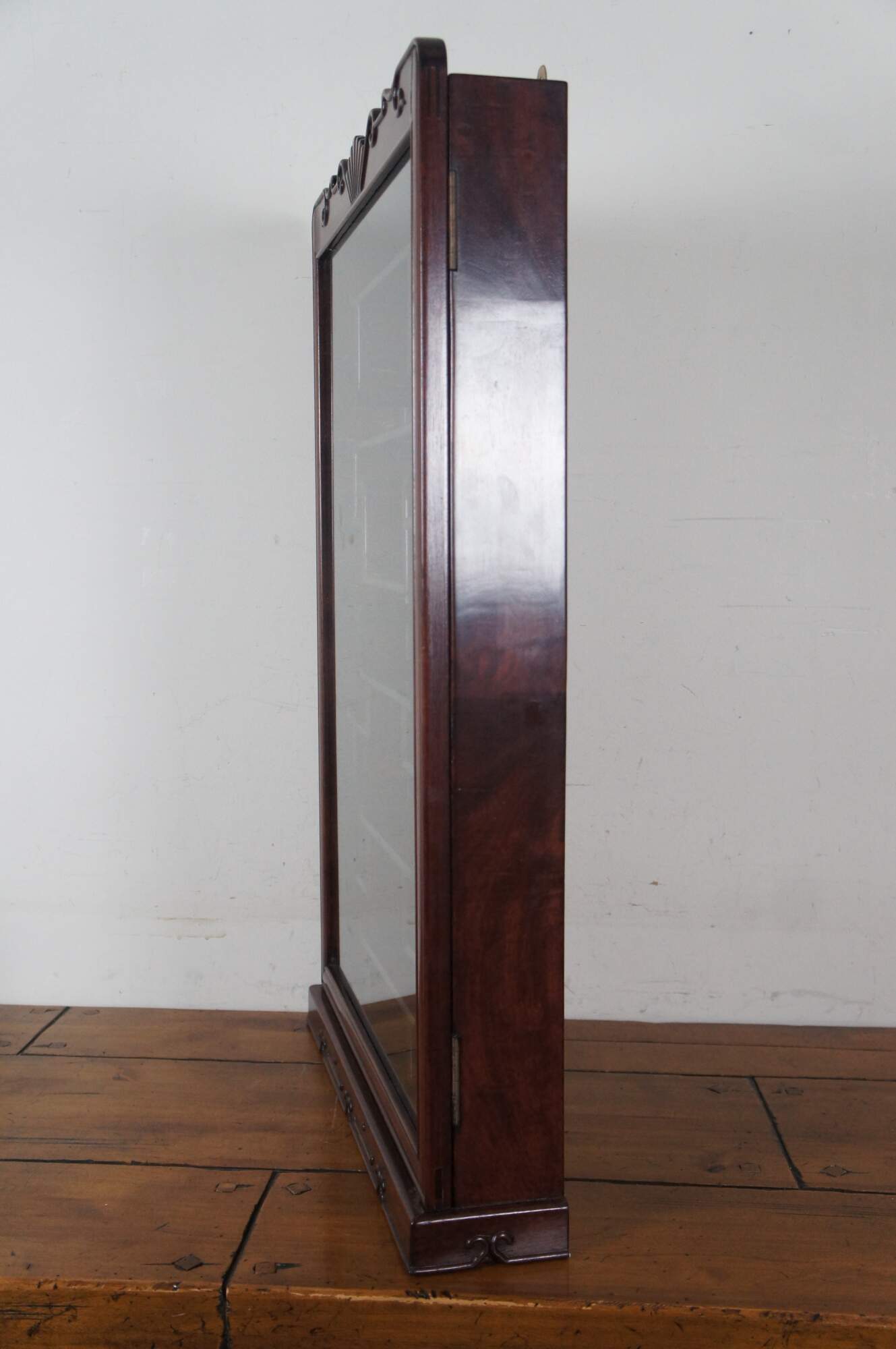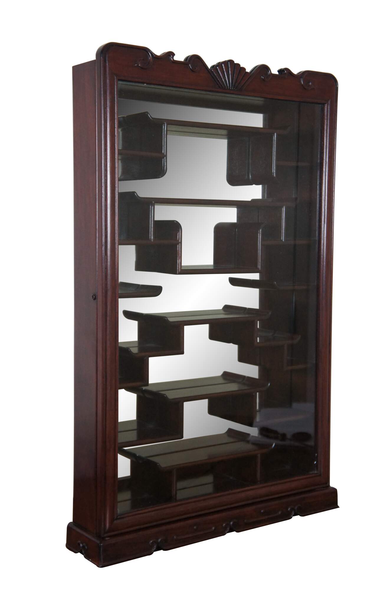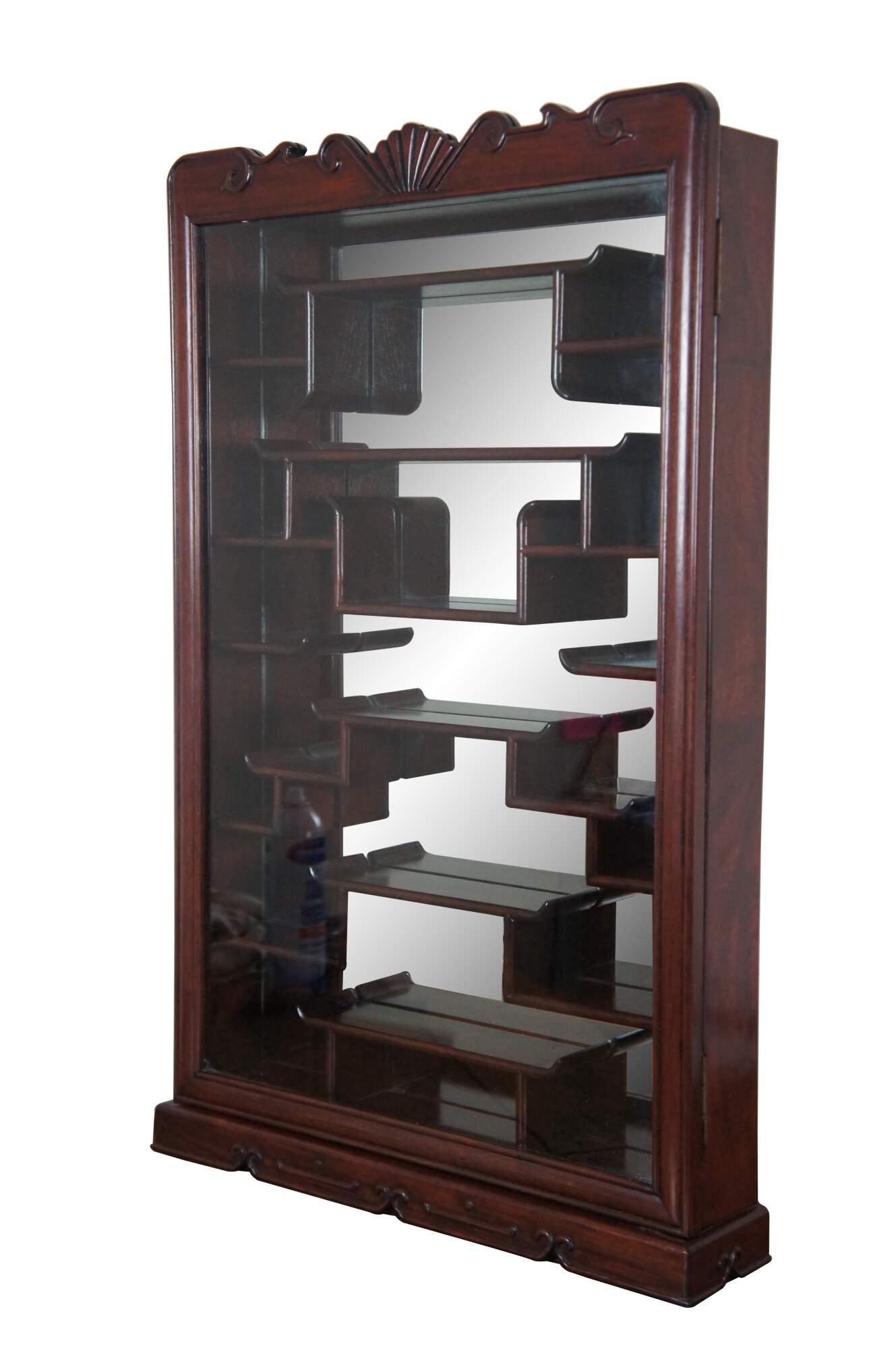 Vintage Chinese etagere wall shelf curio cabinet featuring Chippendale styling with mirrored back, carved shell top glass door and mutliple display shelves for Natsuke / trinkets / snuff bottles ect.