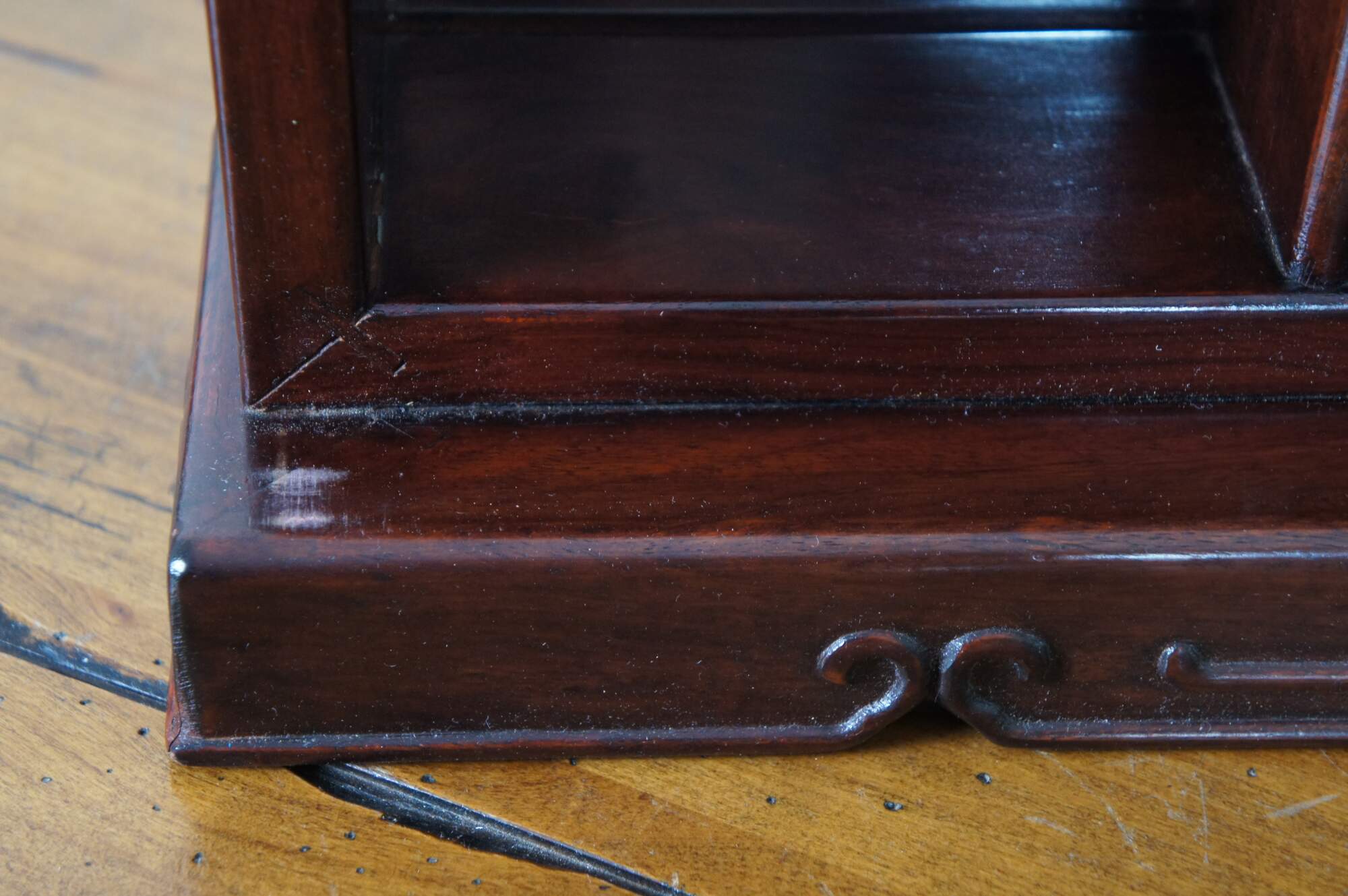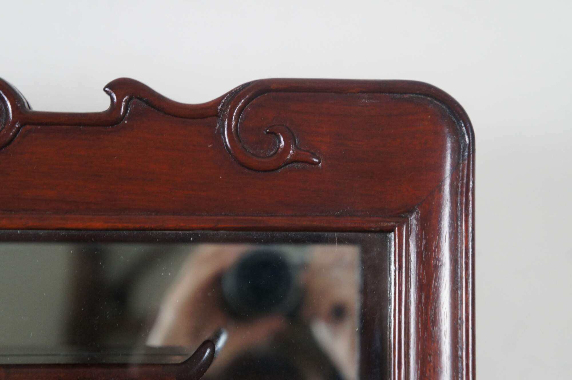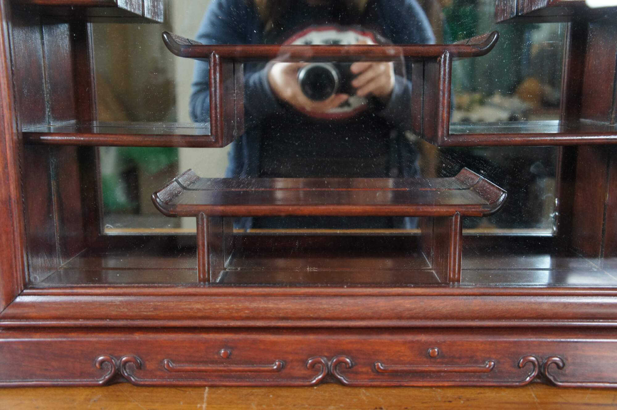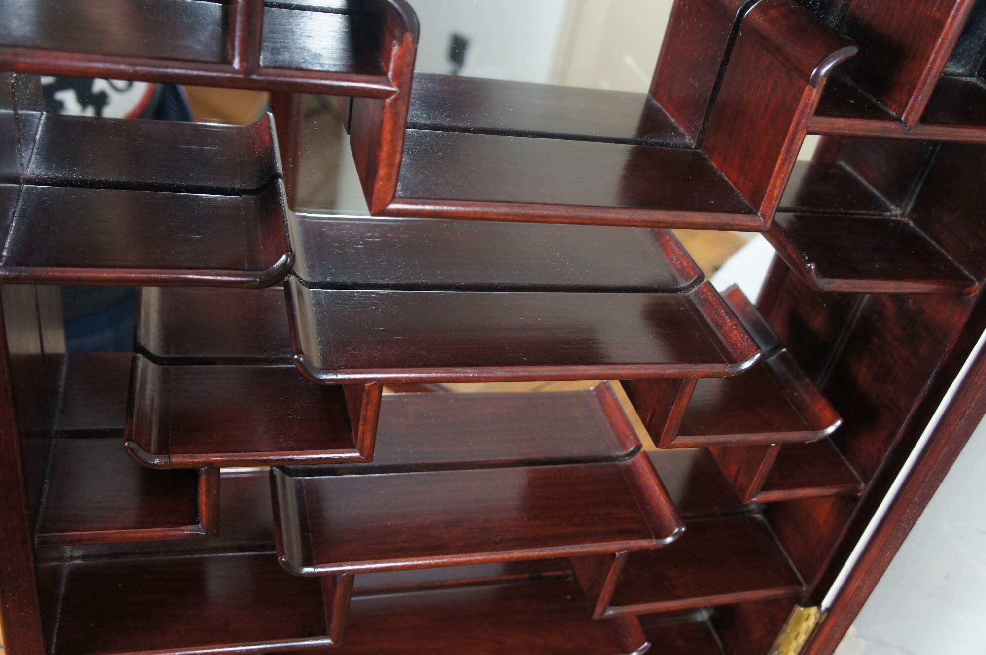 Vintage Chinese etagere wall shelf curio cabinet featuring Chippendale styling with mirrored back, carved shell top glass door and mutliple display shelves for Natsuke / trinkets / snuff bottles ect.