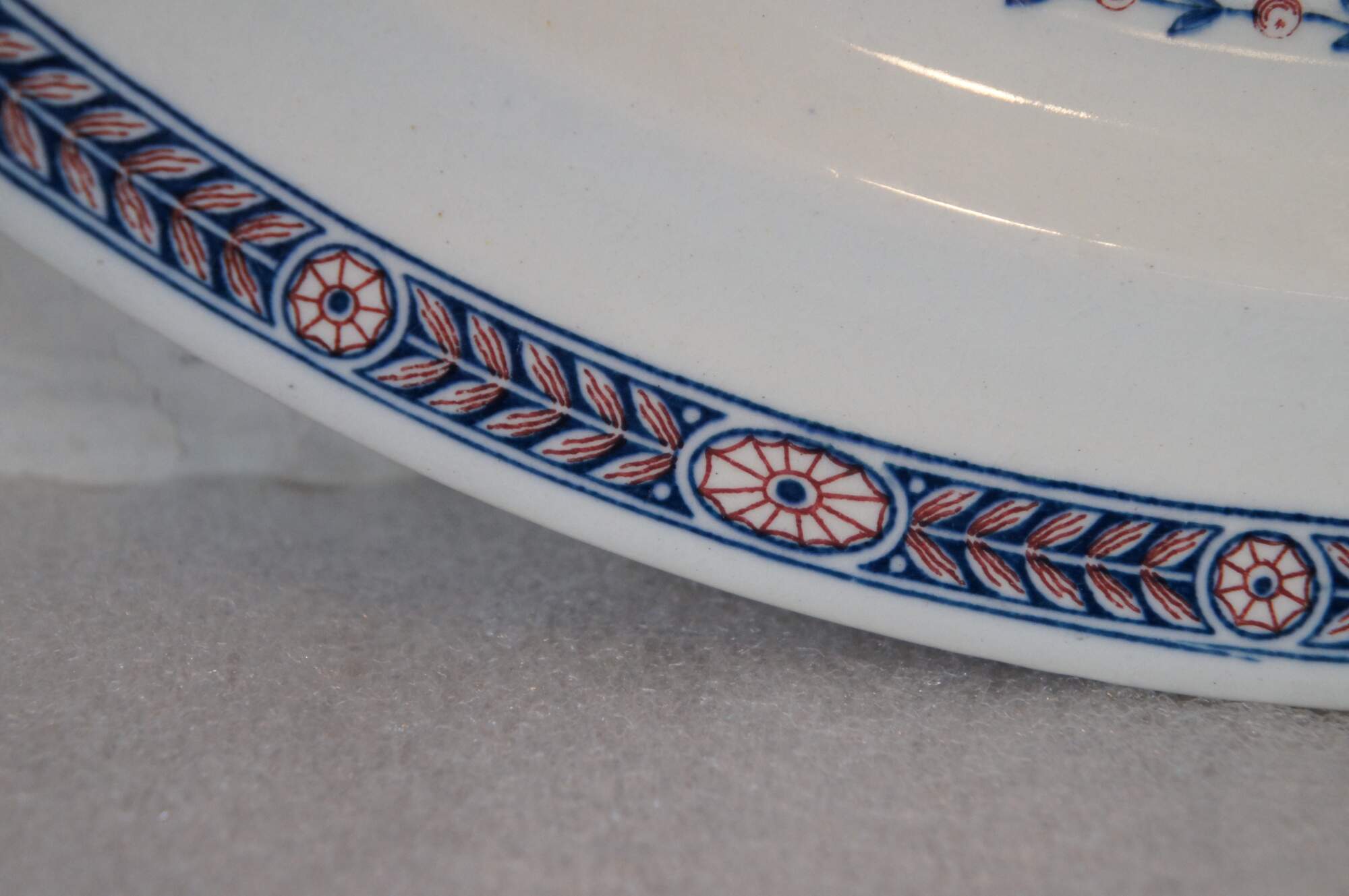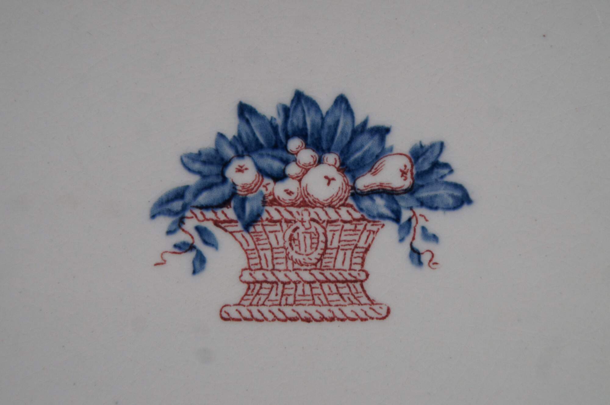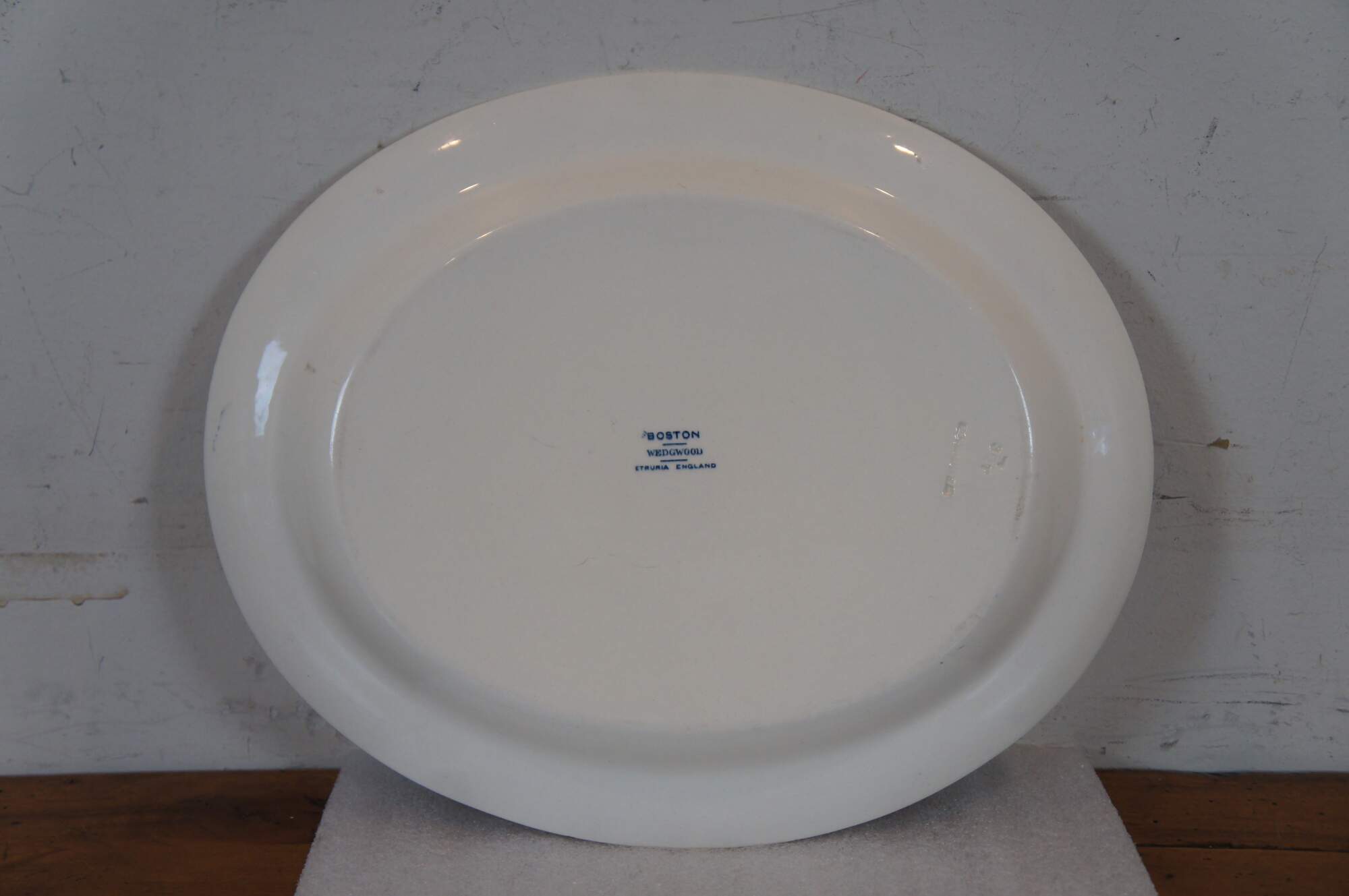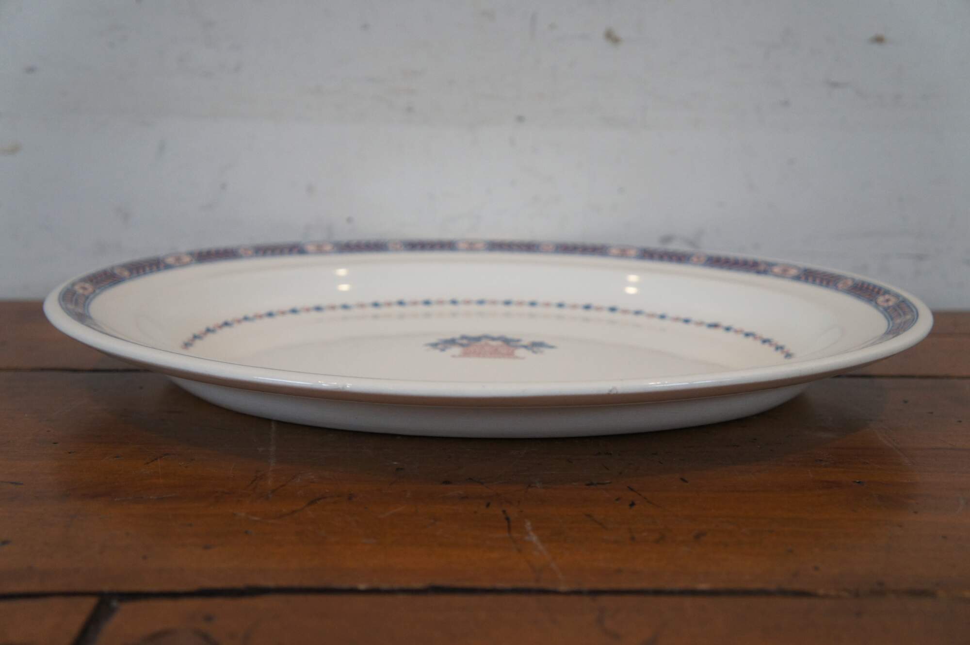 Vintage Wedgwood Boston Etruria, England oval platter in blue white and red featuring a floral motif with fruit / flower basket at the center.