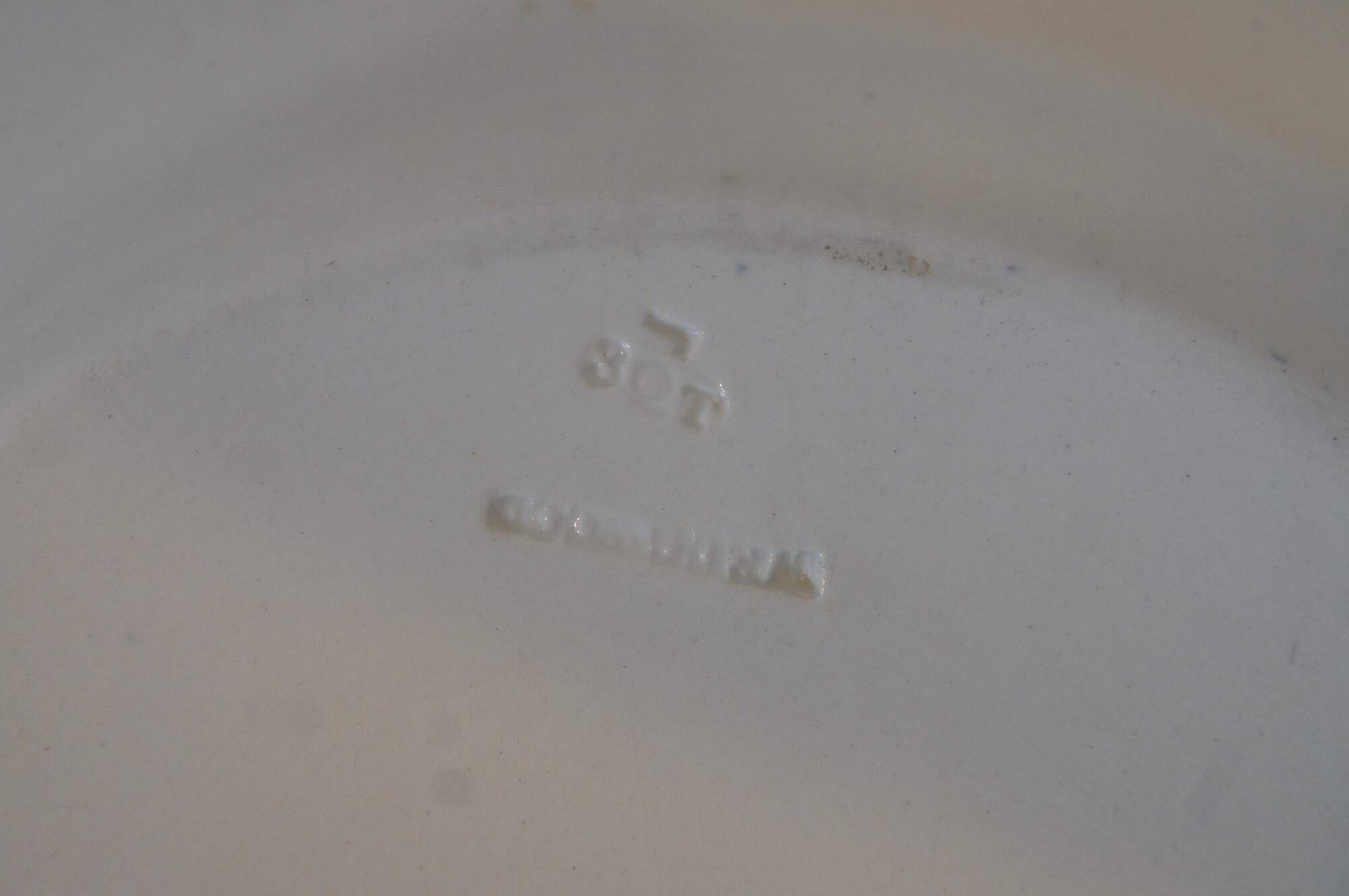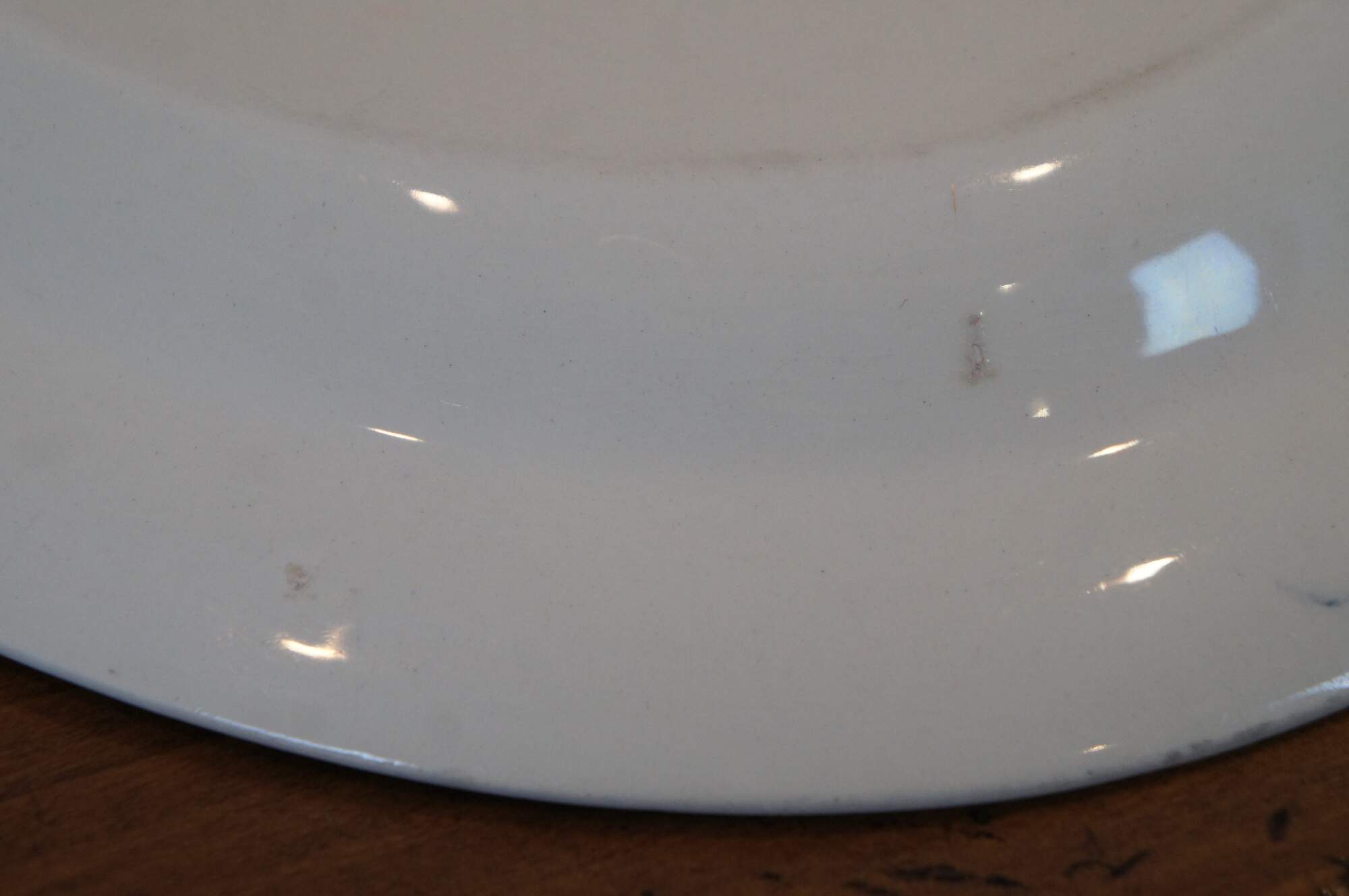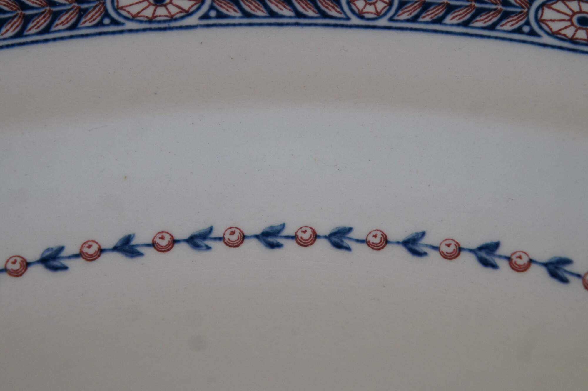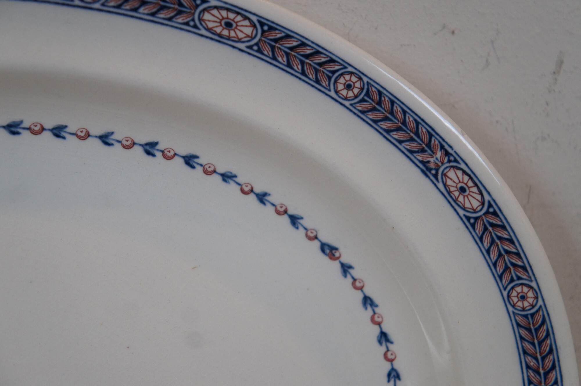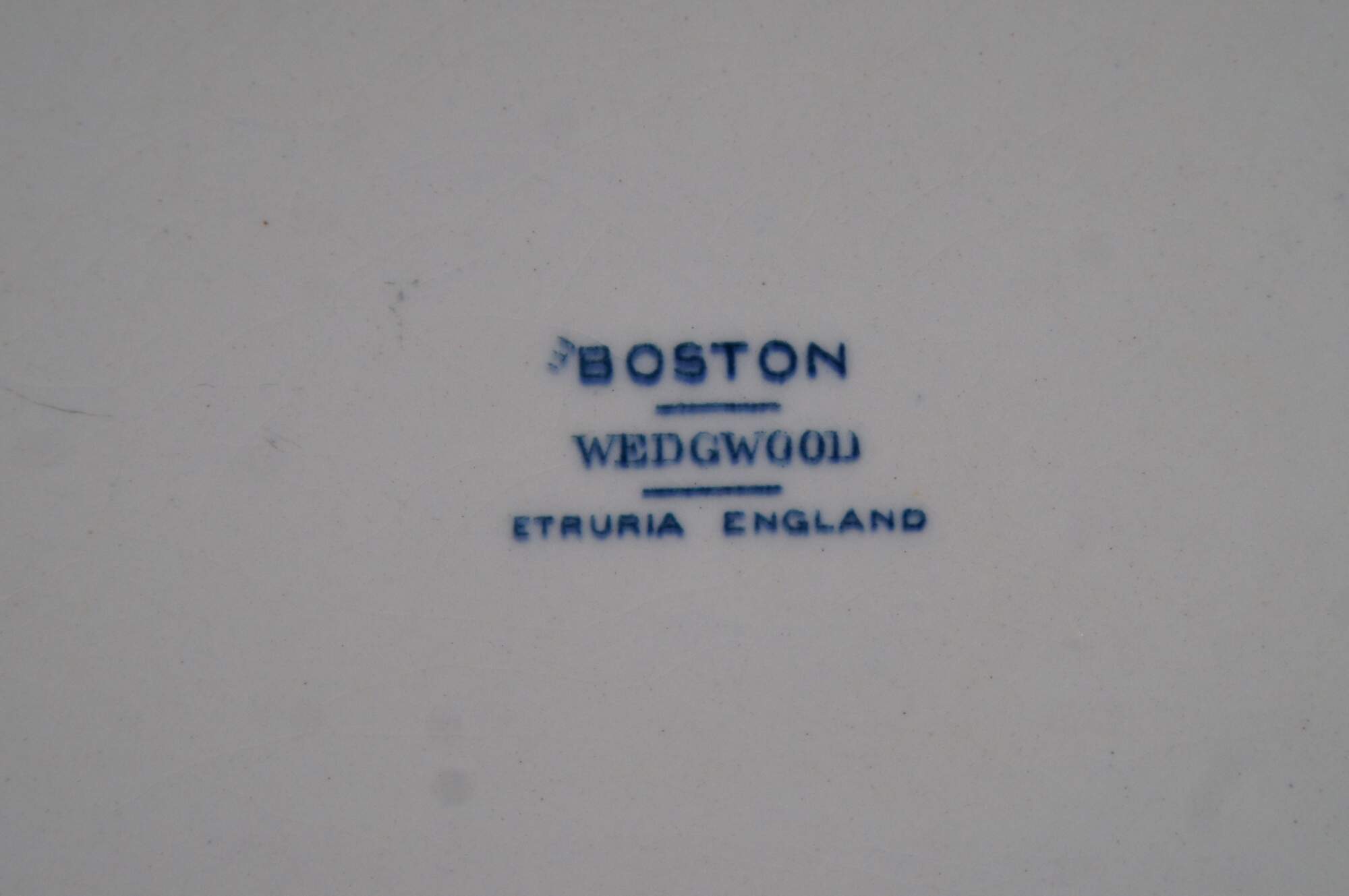 Vintage Wedgwood Boston Etruria, England oval platter in blue white and red featuring a floral motif with fruit / flower basket at the center.
