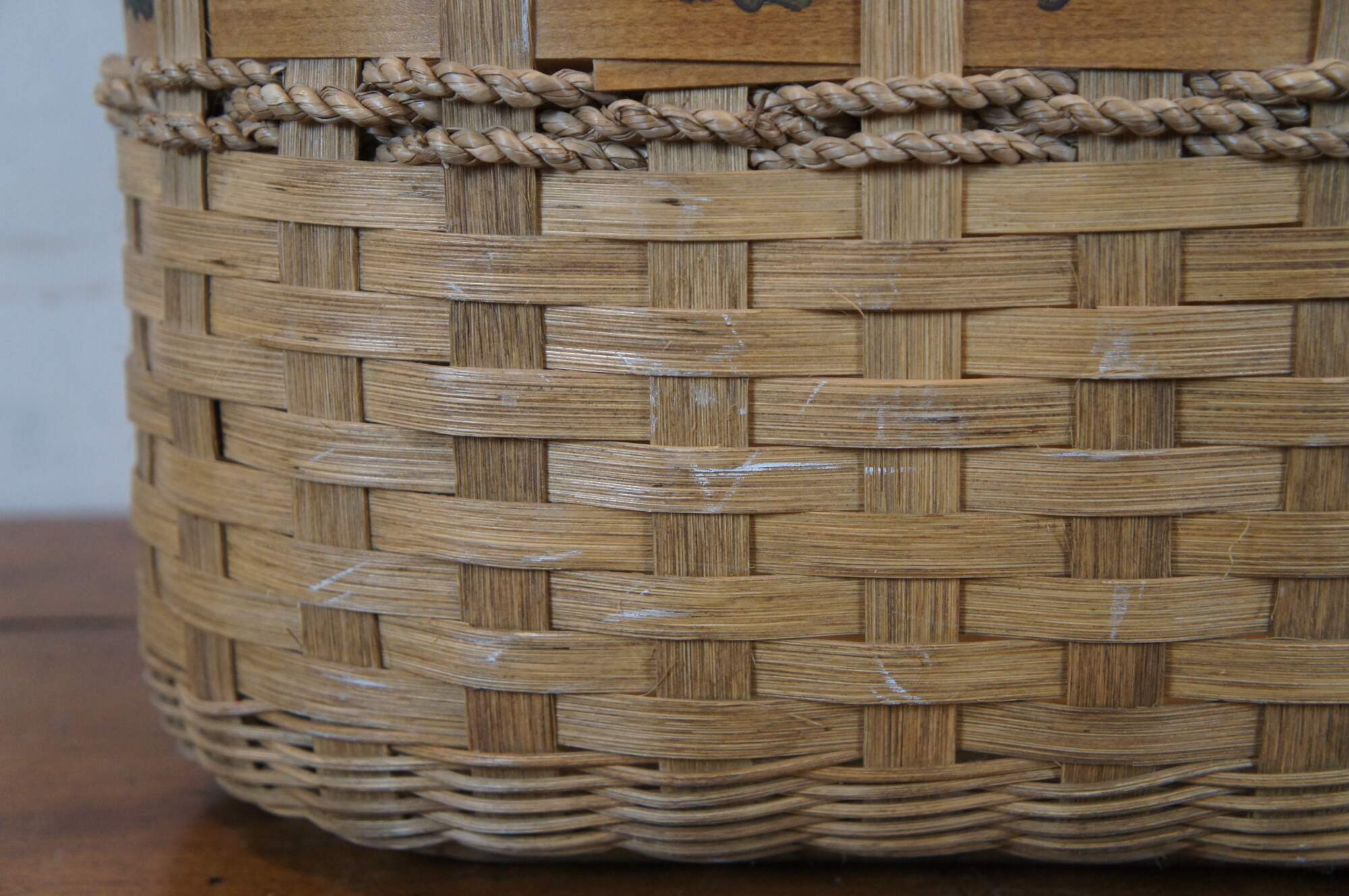 Large vintage wicker harvest basket featuring antler handle with acorn / leaf theme and rope twist accents.