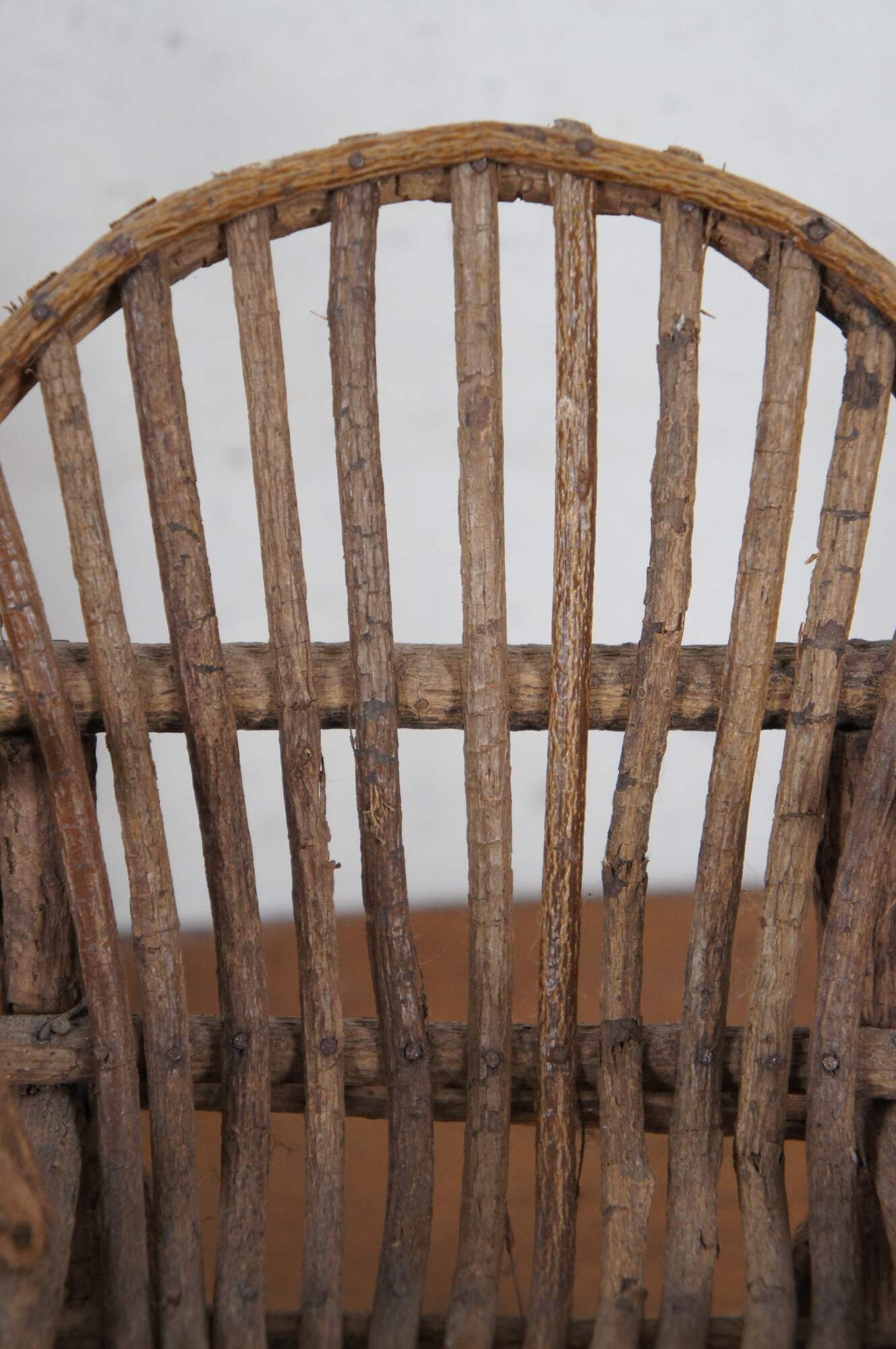 Two vintage folk art miniature salesman sample / doll / cabin decor Adirondak chairs featuring rustic bentwood / twig designs; one rocker and one armchair.
