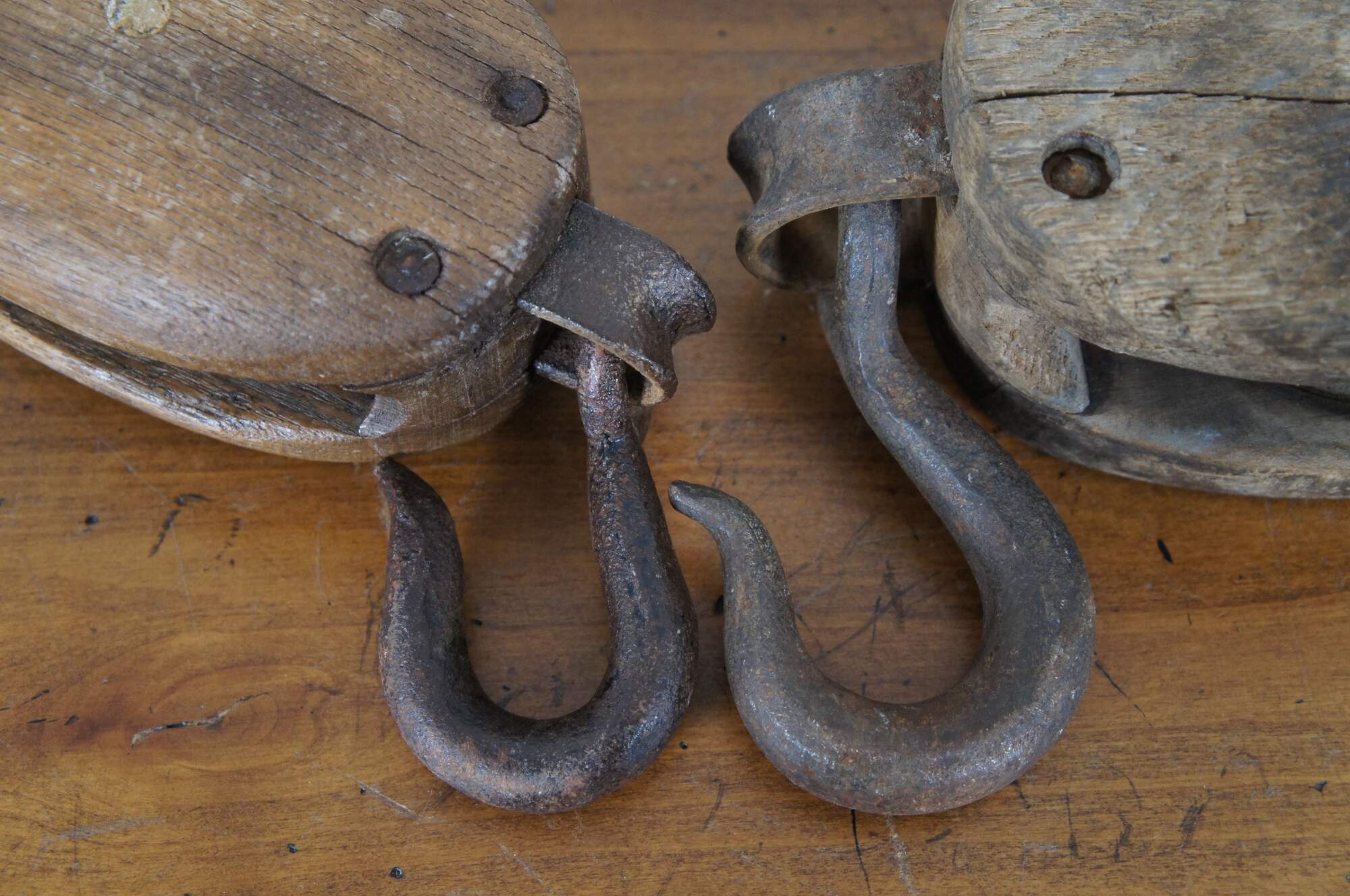 Two primitive antique iron and wood pulley hoist hooks, one by Starline. Rustic, nautical, industrial, farmhouse, cabin decor.