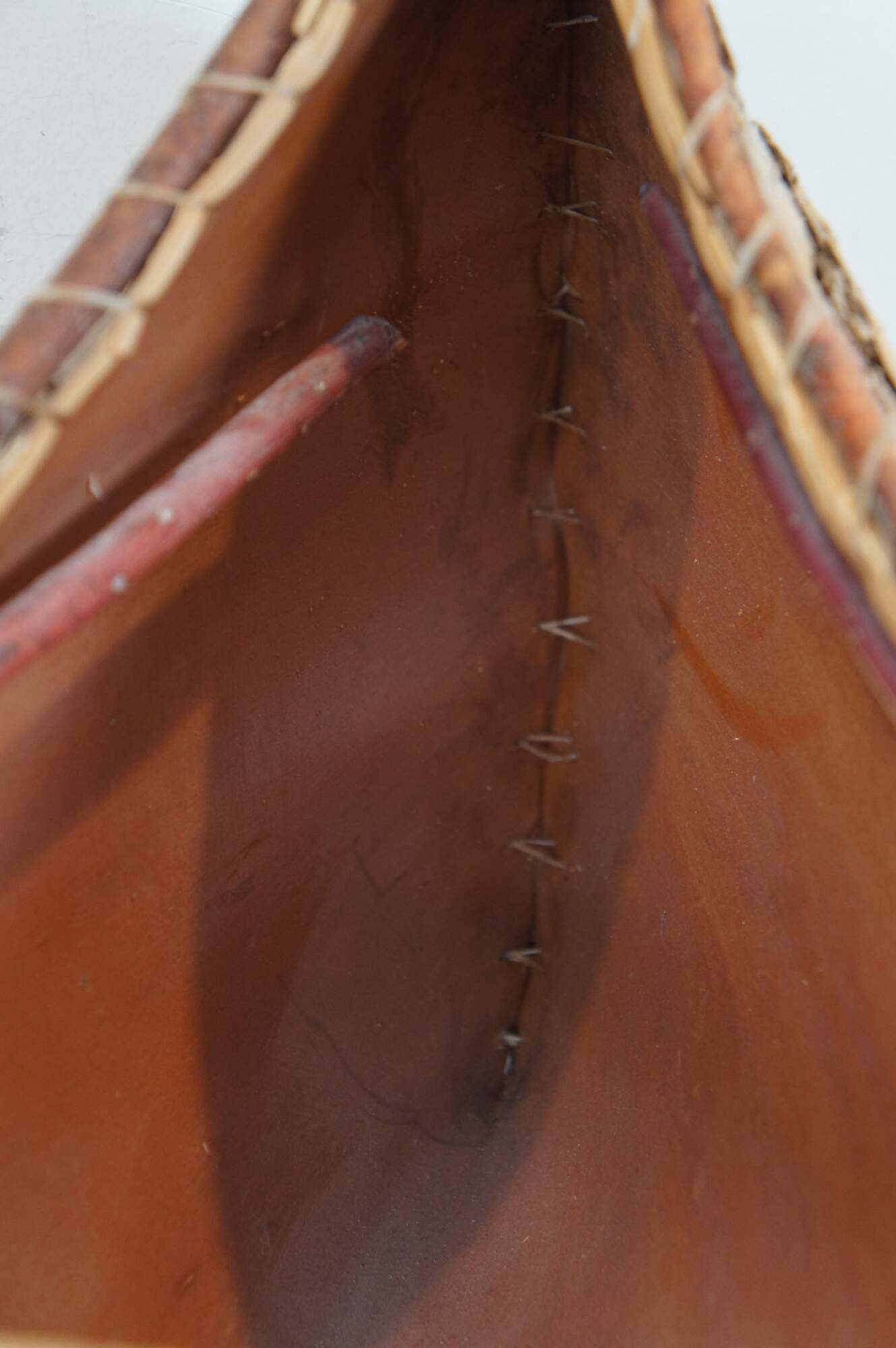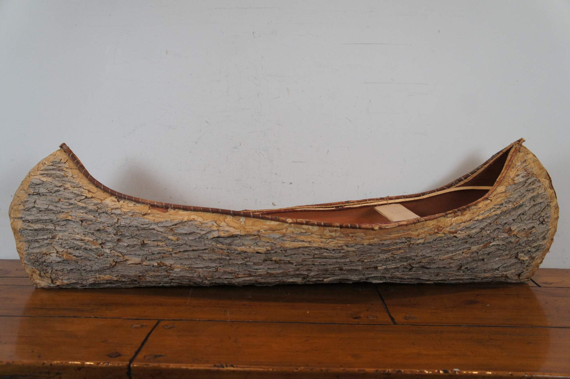 Vintage 1/3 scale folk art canoe model. Made of birch bark and bentwood featuring traditional primitive construction. Log cabin, lodge, store display.