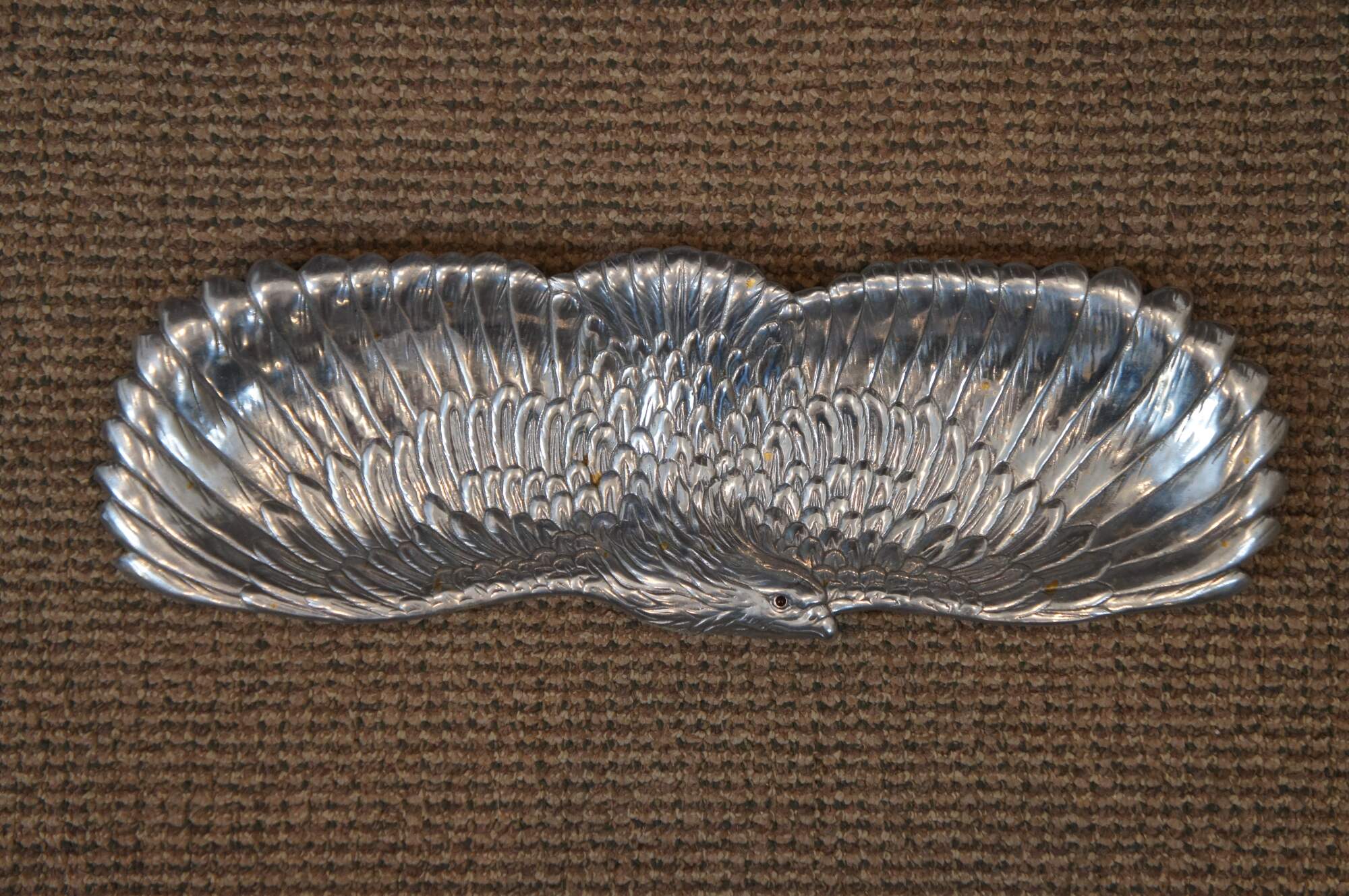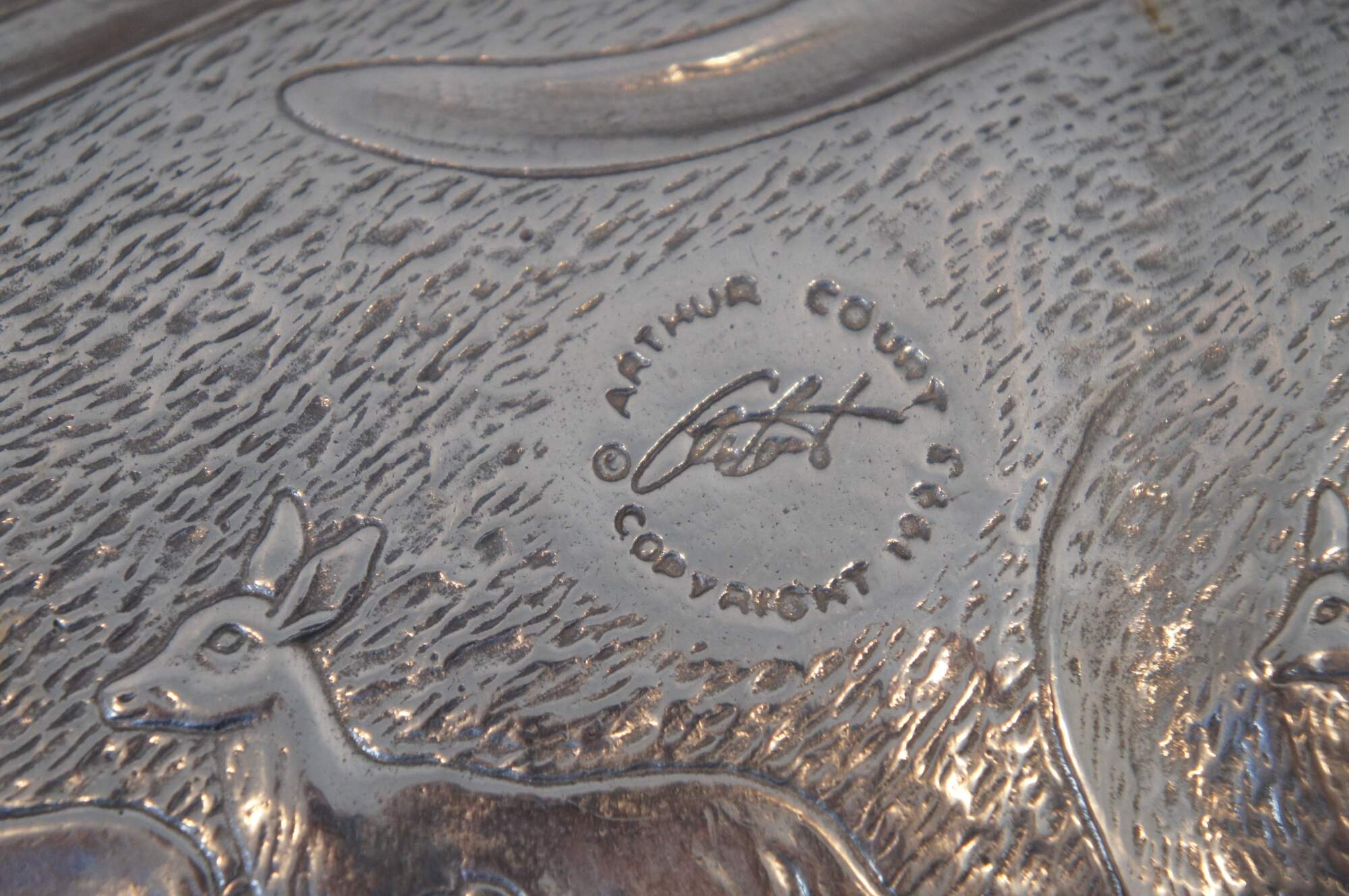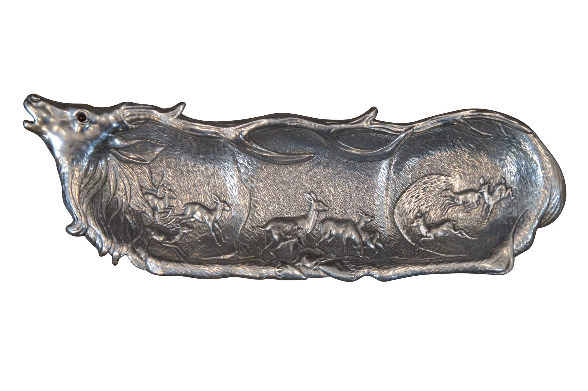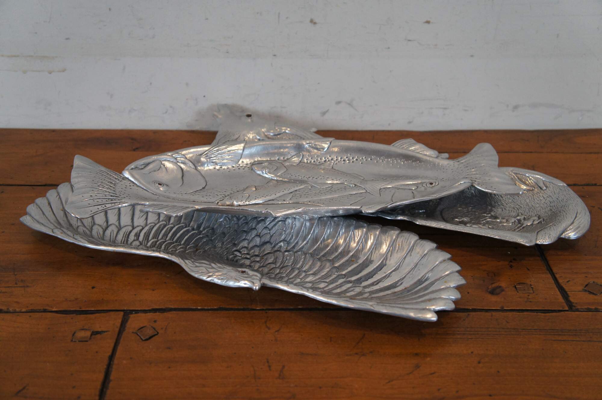 Three vintage Arthur Court animal / hunt theme serving trays or platters. Made of aluminum featuring Carnelian jeweled eyes. Includes 1991 Bald Eagle, 1993 School of Salmon / fish and 1993 Deer / Stag / Elk.