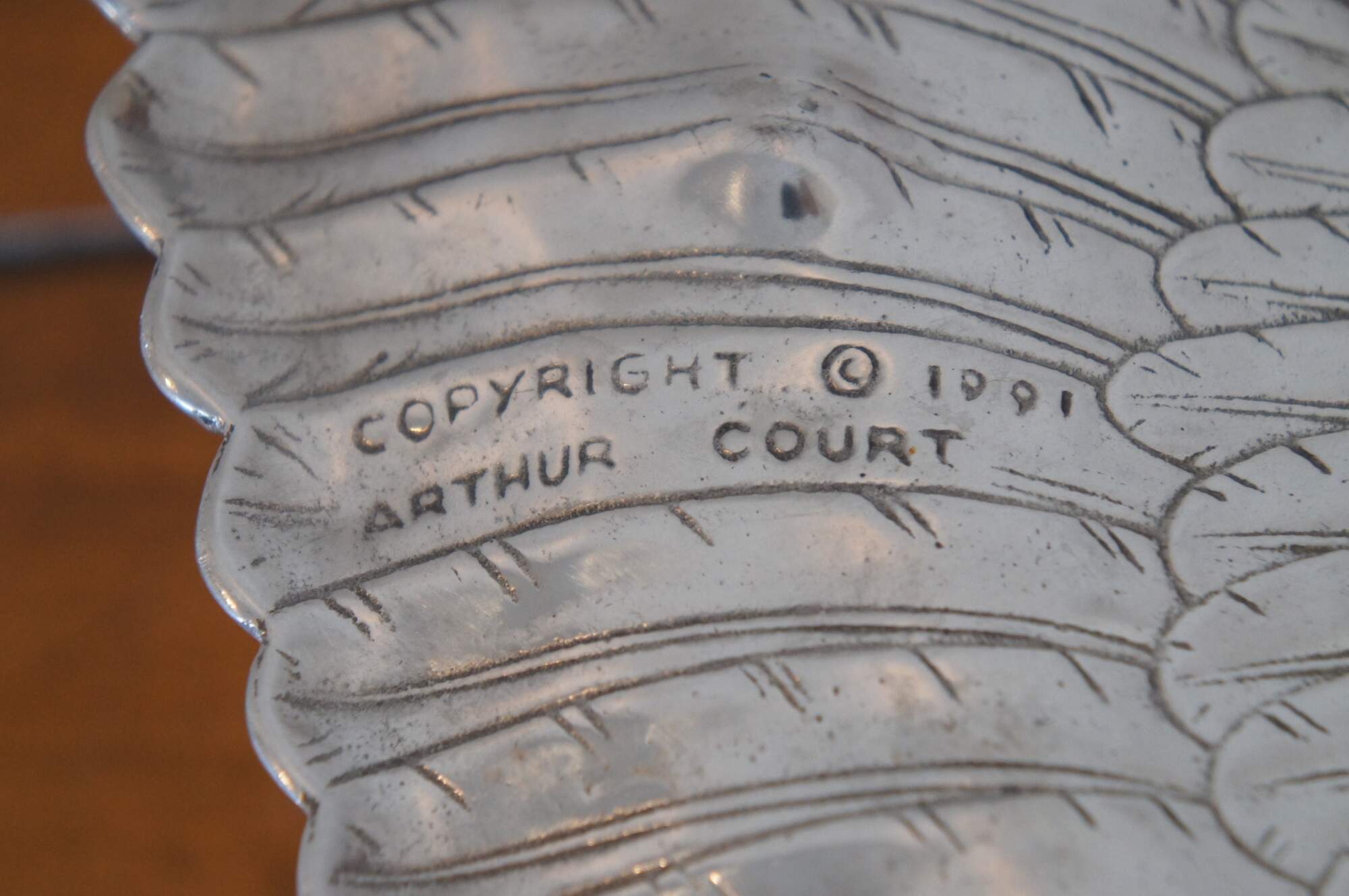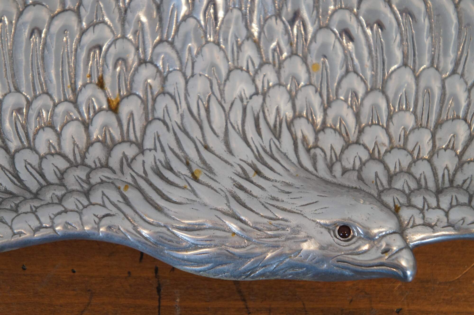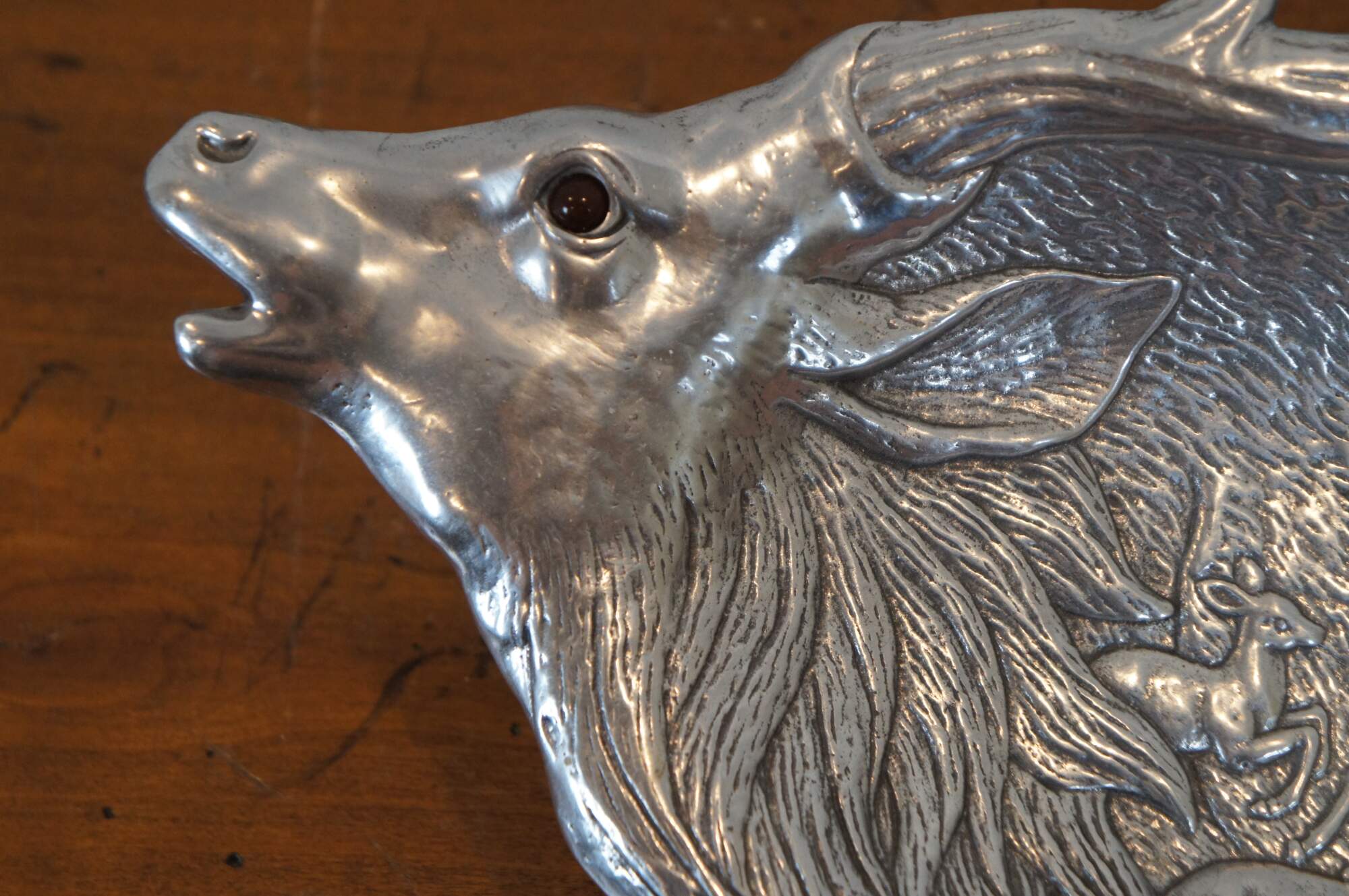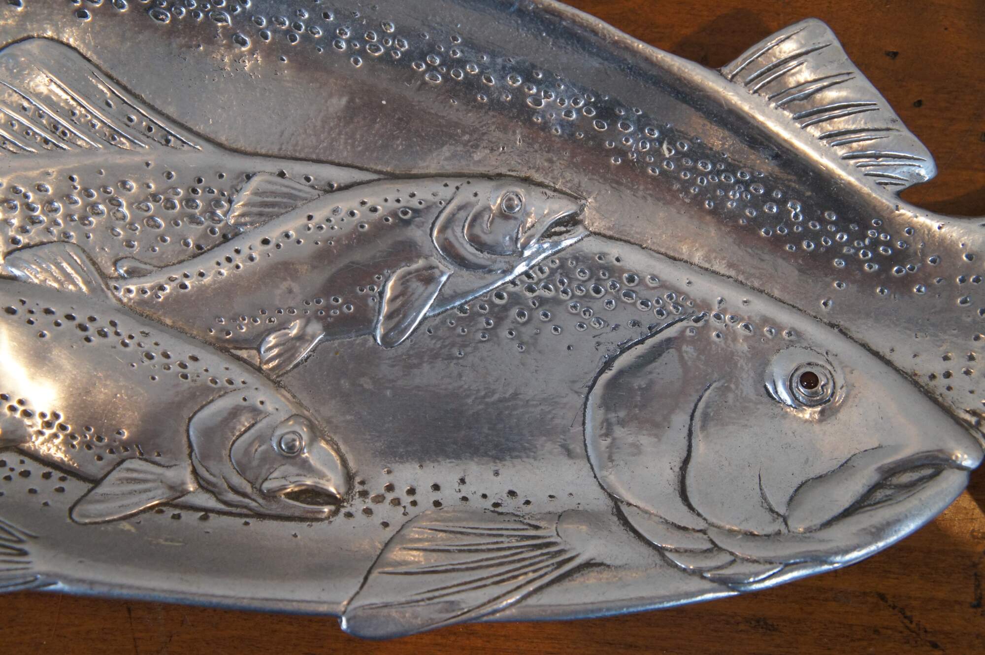 Three vintage Arthur Court animal / hunt theme serving trays or platters. Made of aluminum featuring Carnelian jeweled eyes. Includes 1991 Bald Eagle, 1993 School of Salmon / fish and 1993 Deer / Stag / Elk.