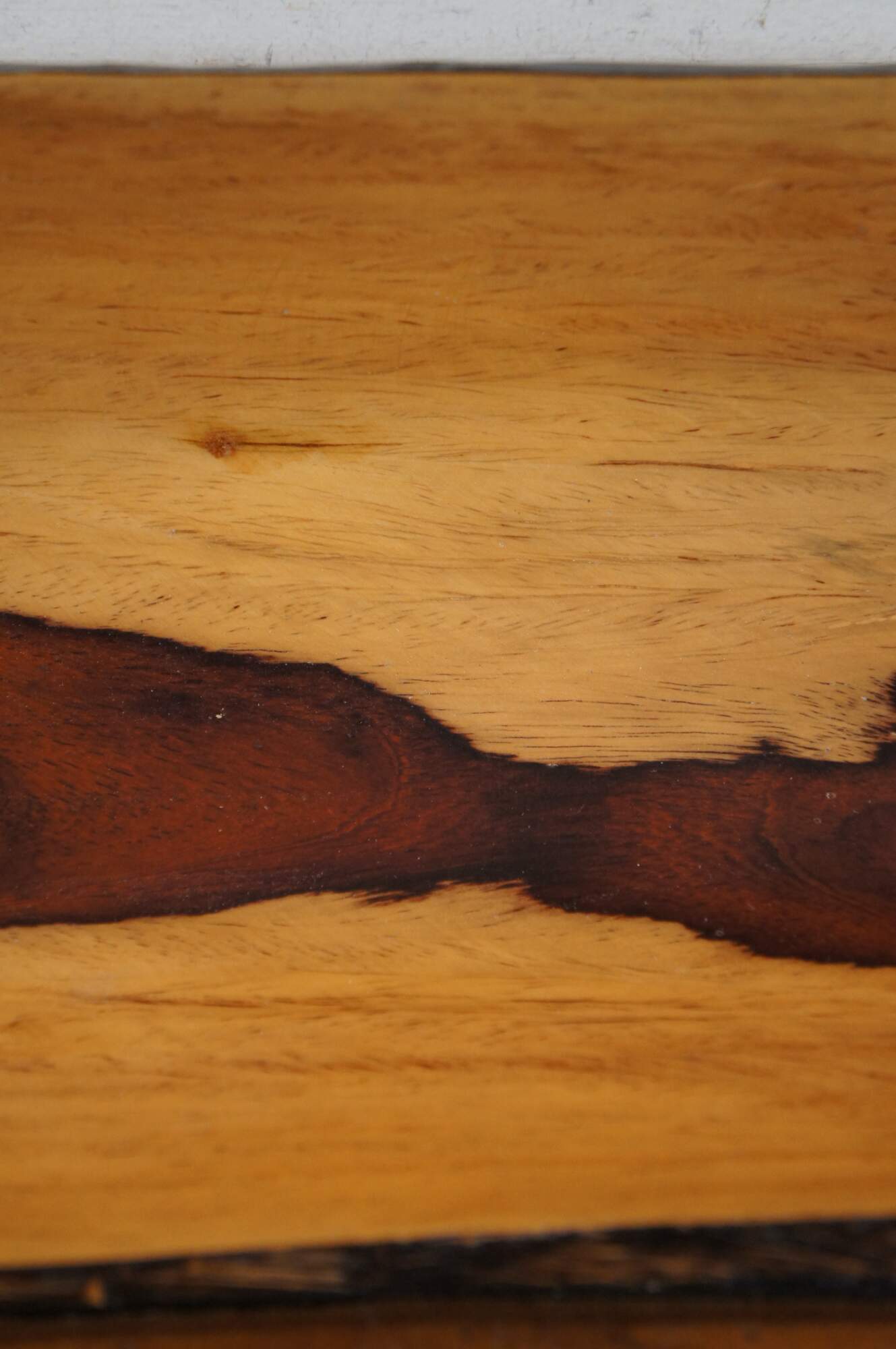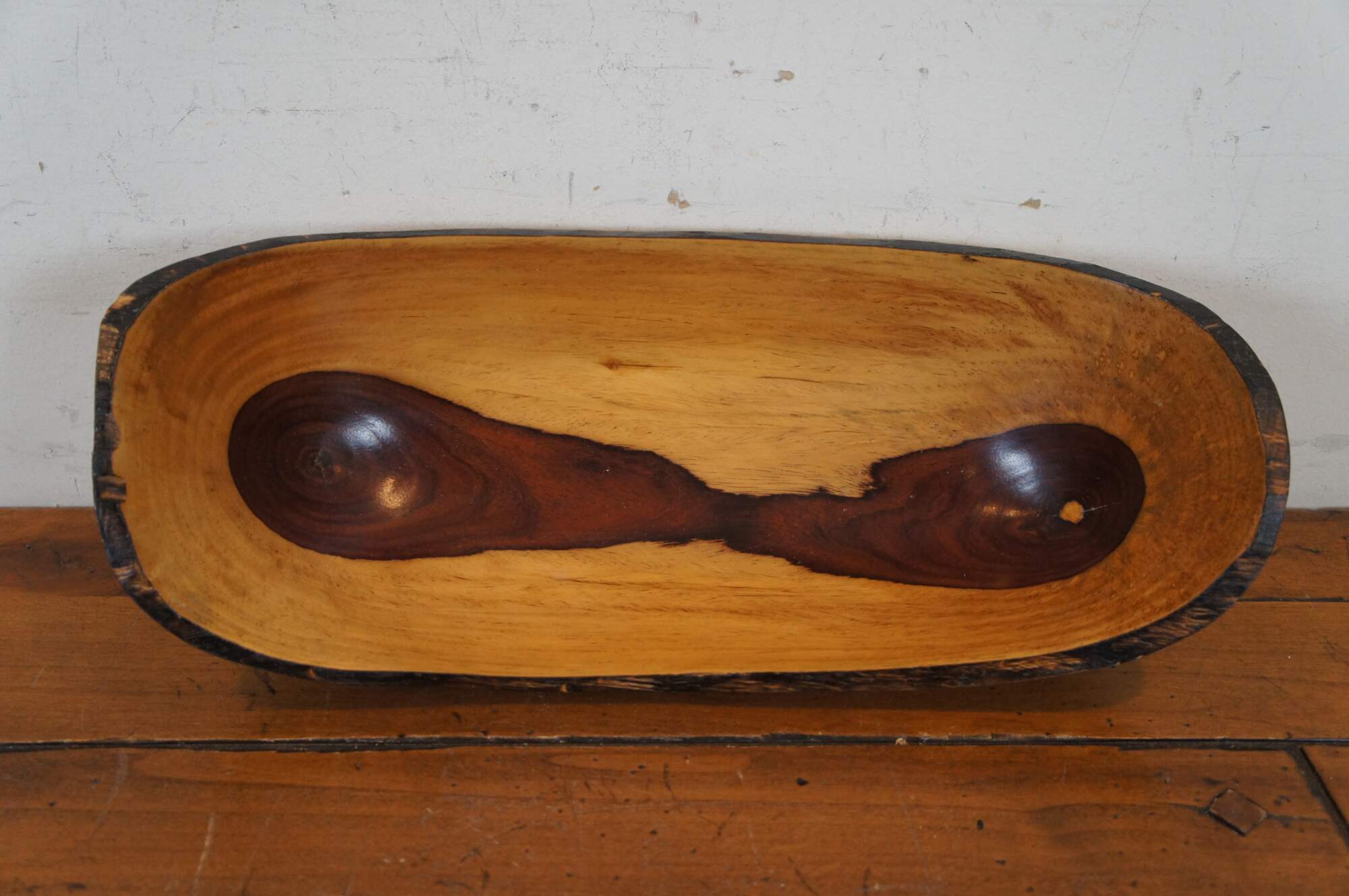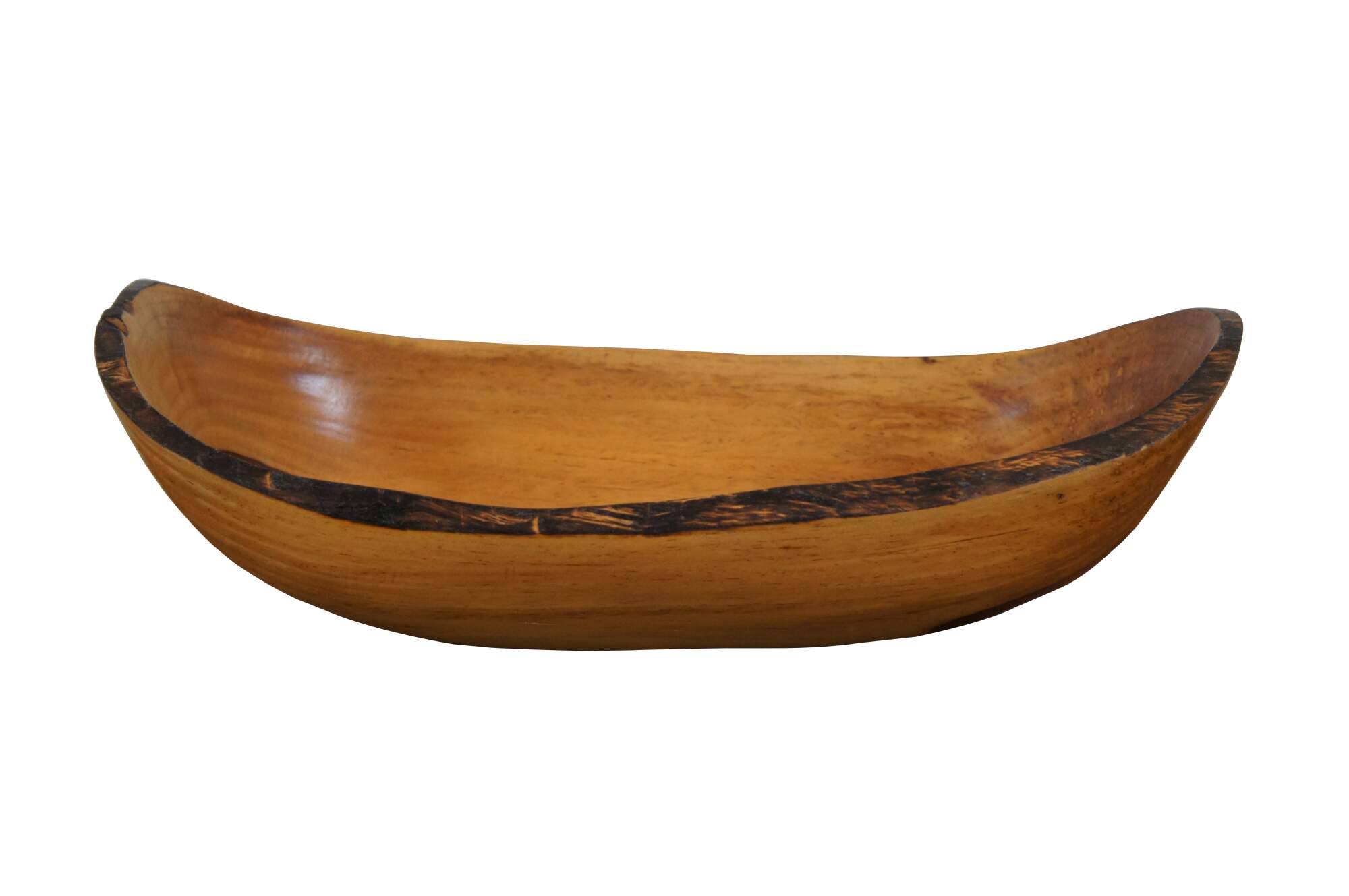 Vintage artisan carved fruit / bread / centerpiece serving bowl. Made of olivewood featuring oval form with live edge and natural tones.