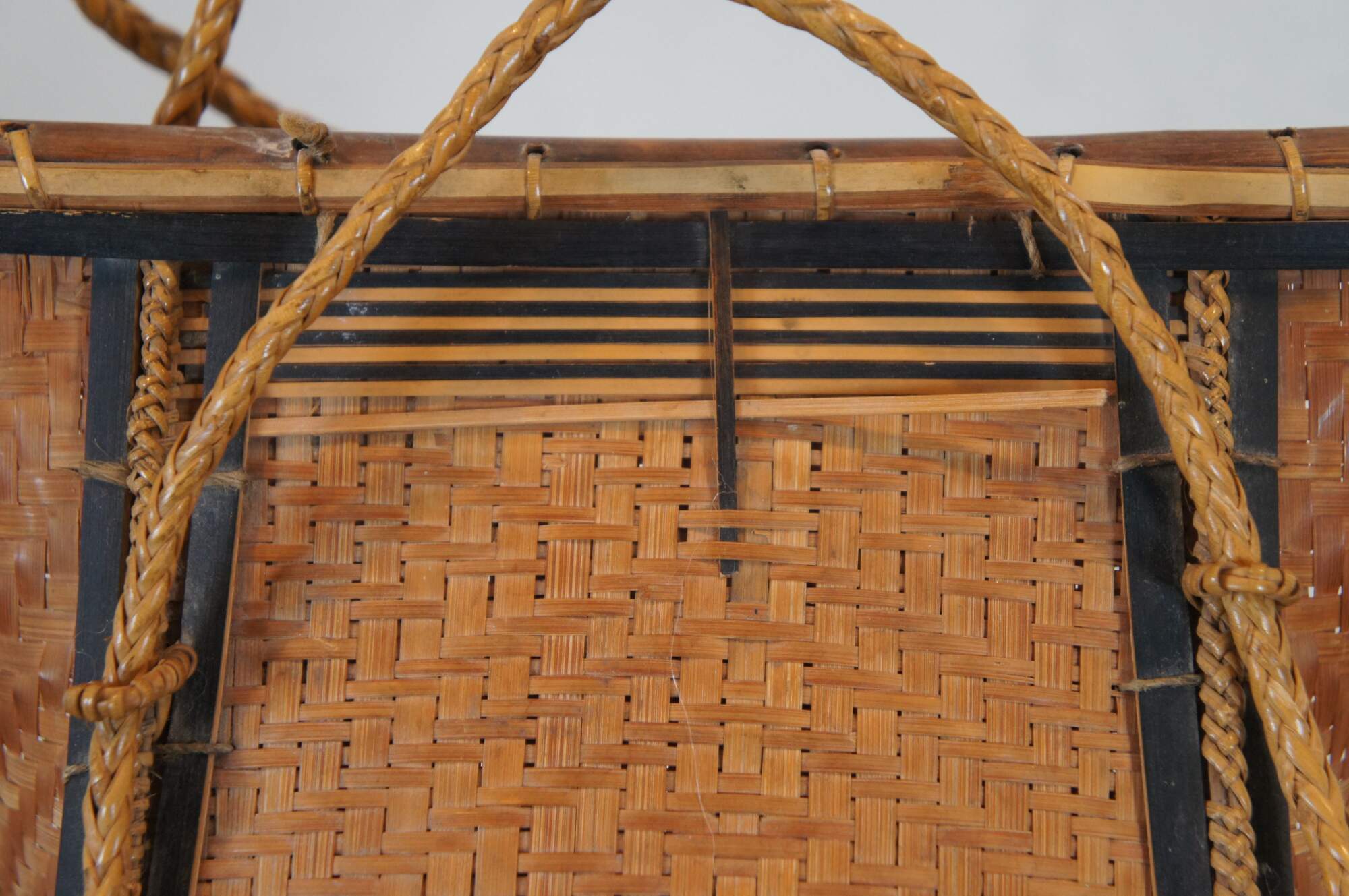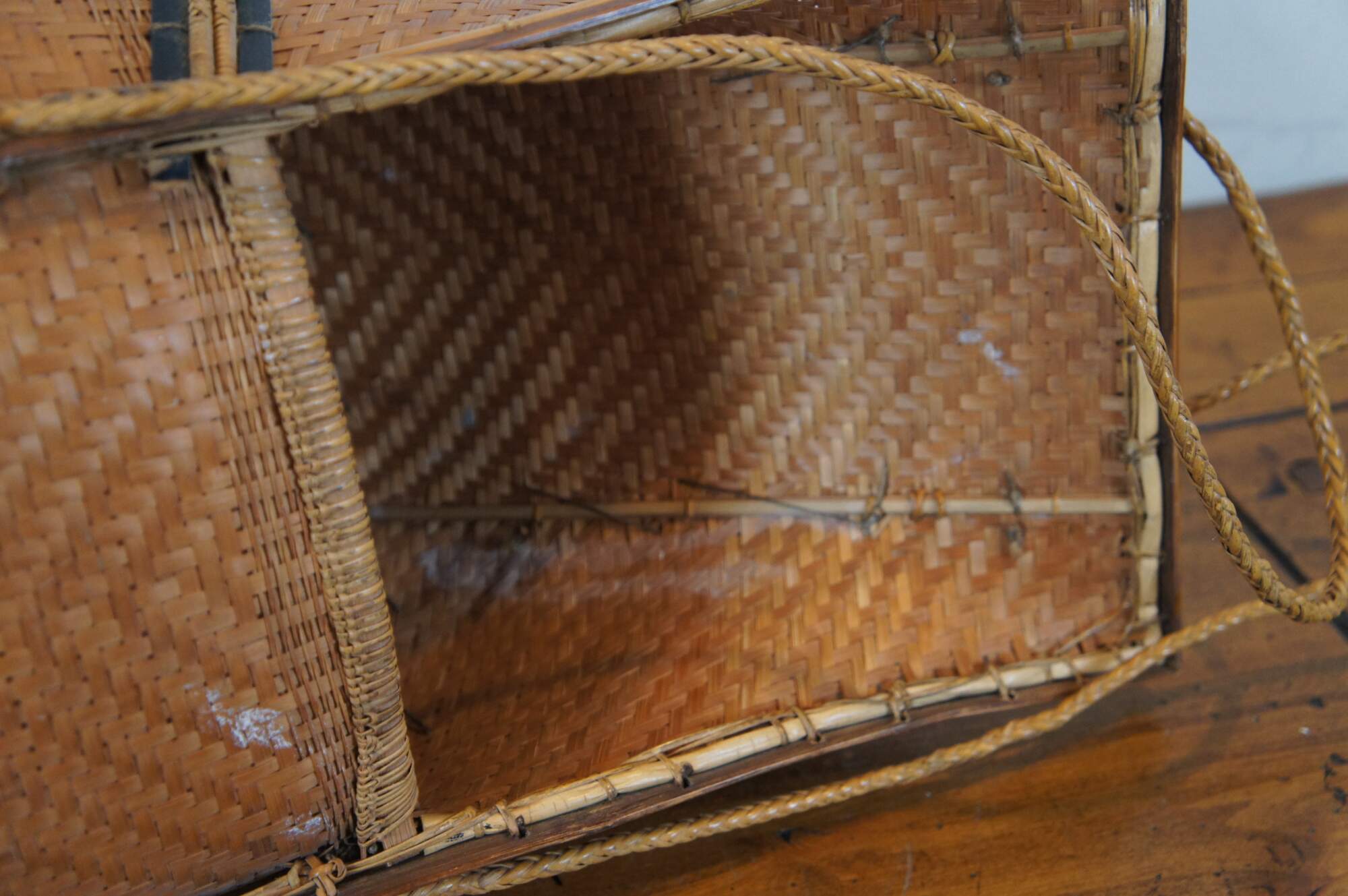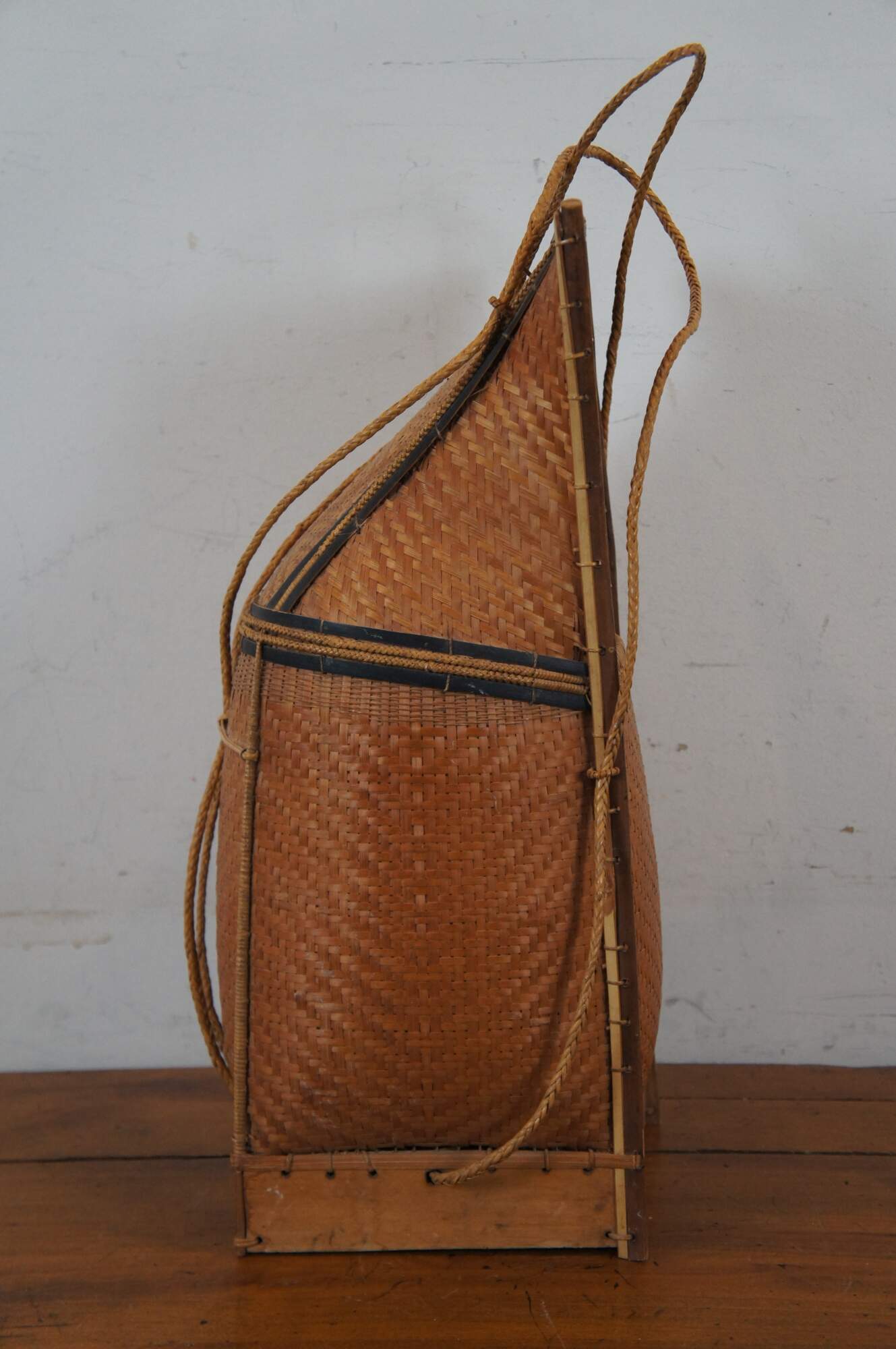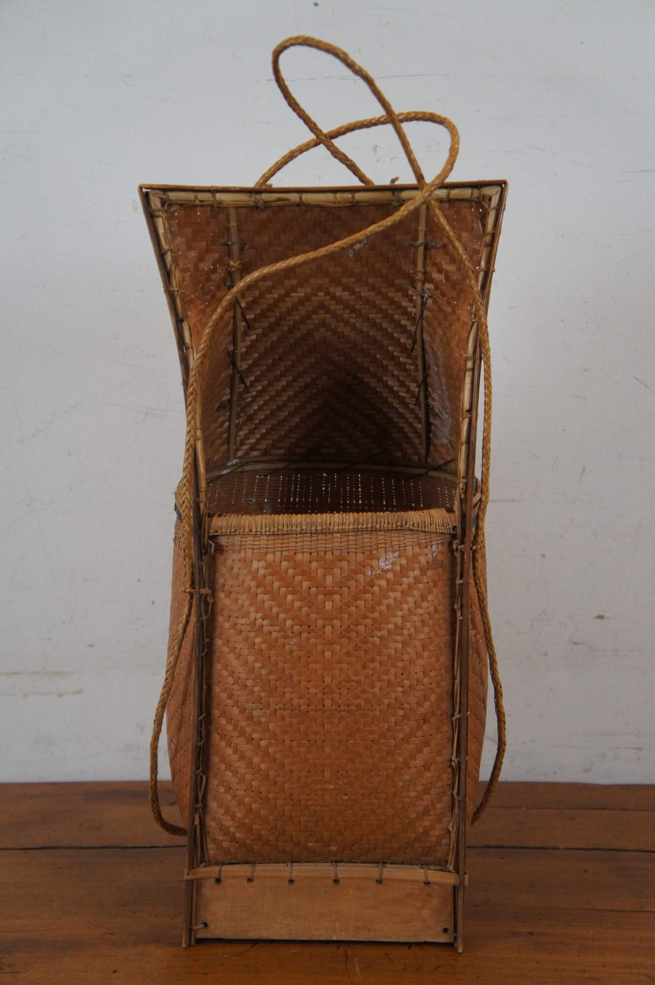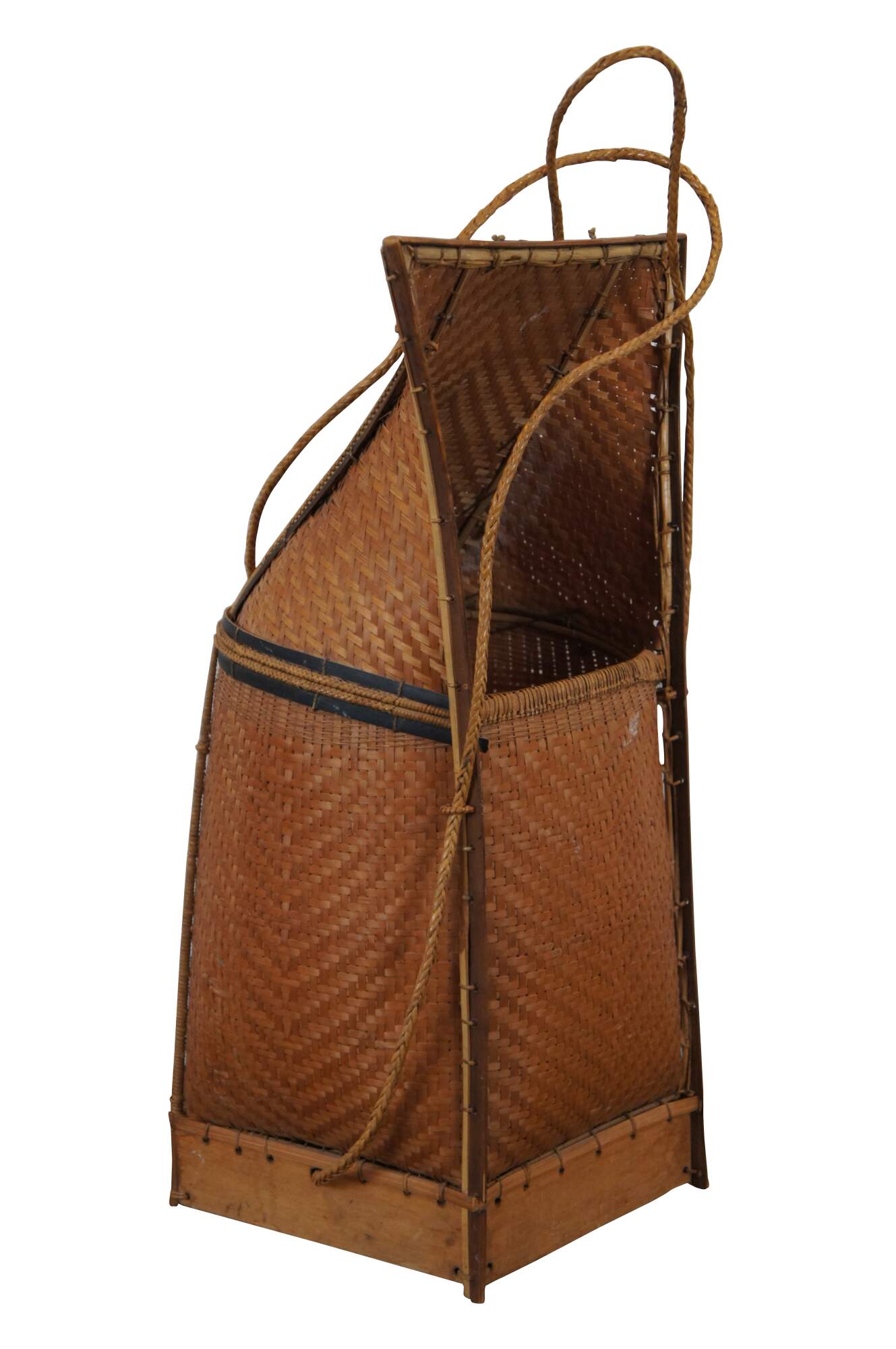 Antique folk art tribal woven wicker and bamboo baby carrying basket from Thailand.