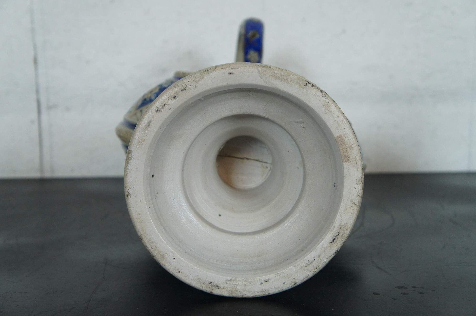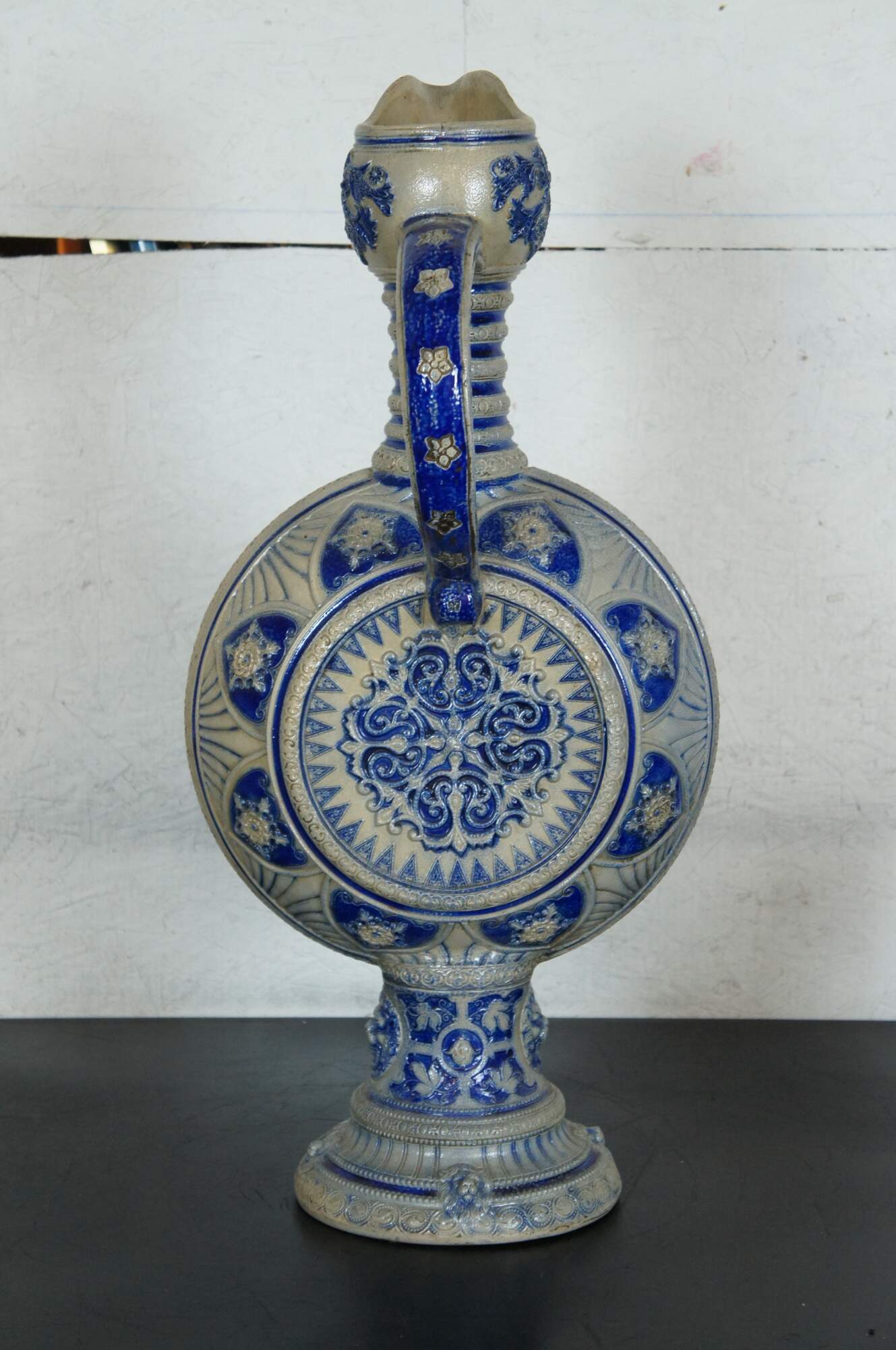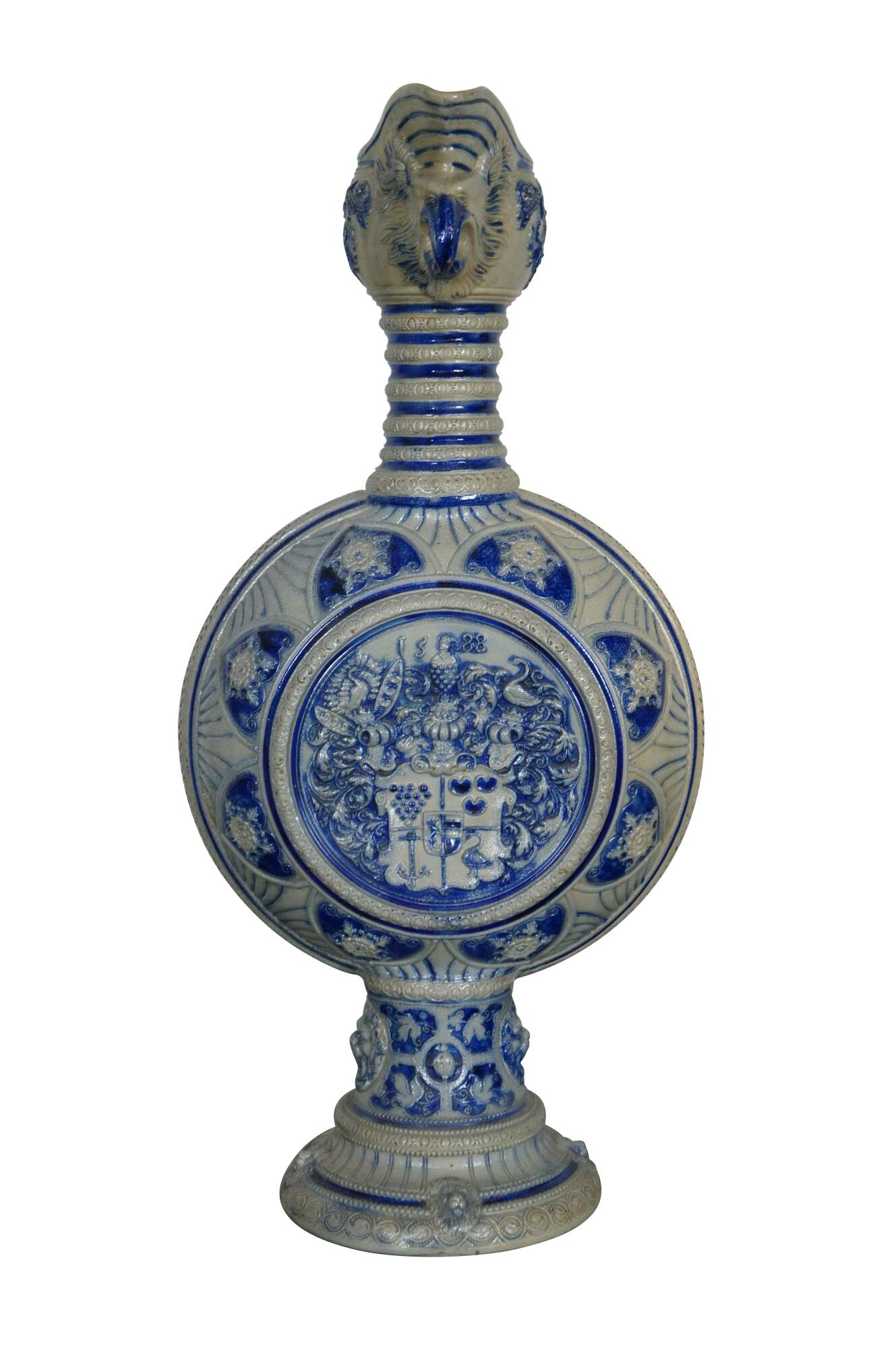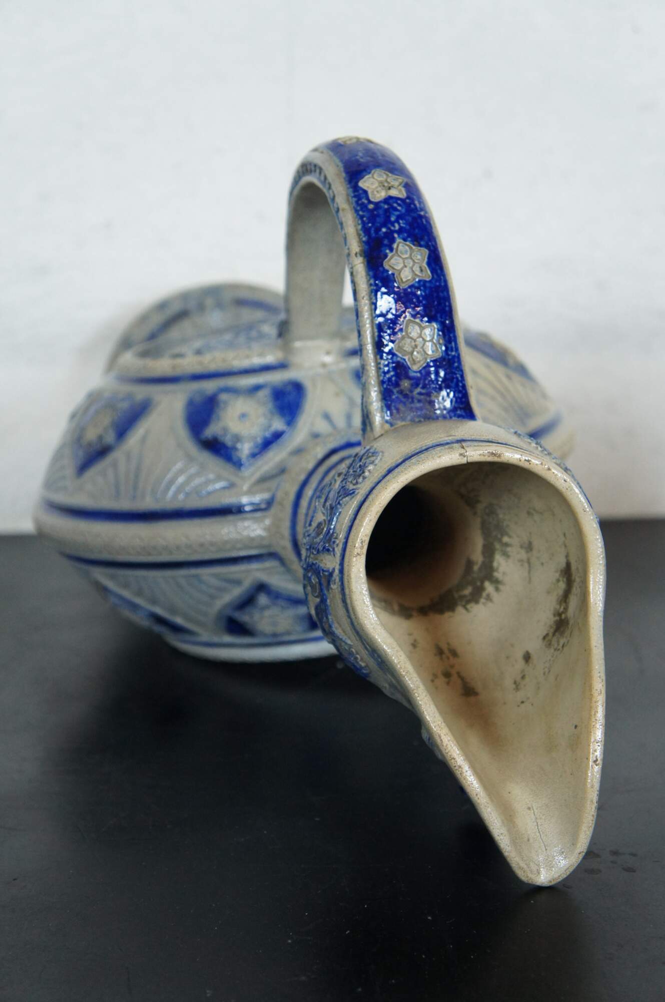 Antique German Westerwald stoneware pottery decanter jug, ewer or pitcher. Made of cobalt blue salt glaze stoneware featuring a mythical gryphon / griffon (cross between eagle / lion / elephant) spout, heraldic crest / shield, lion head and fleur de lis.