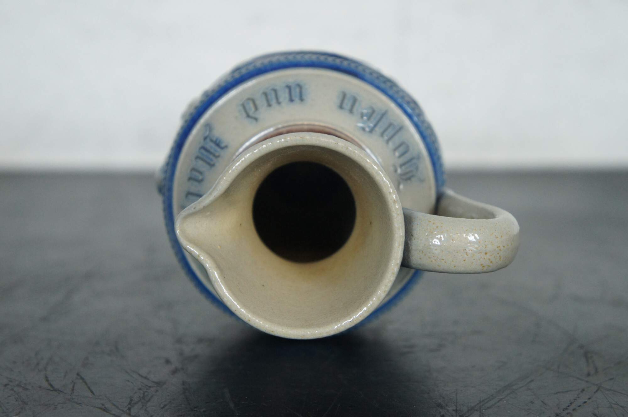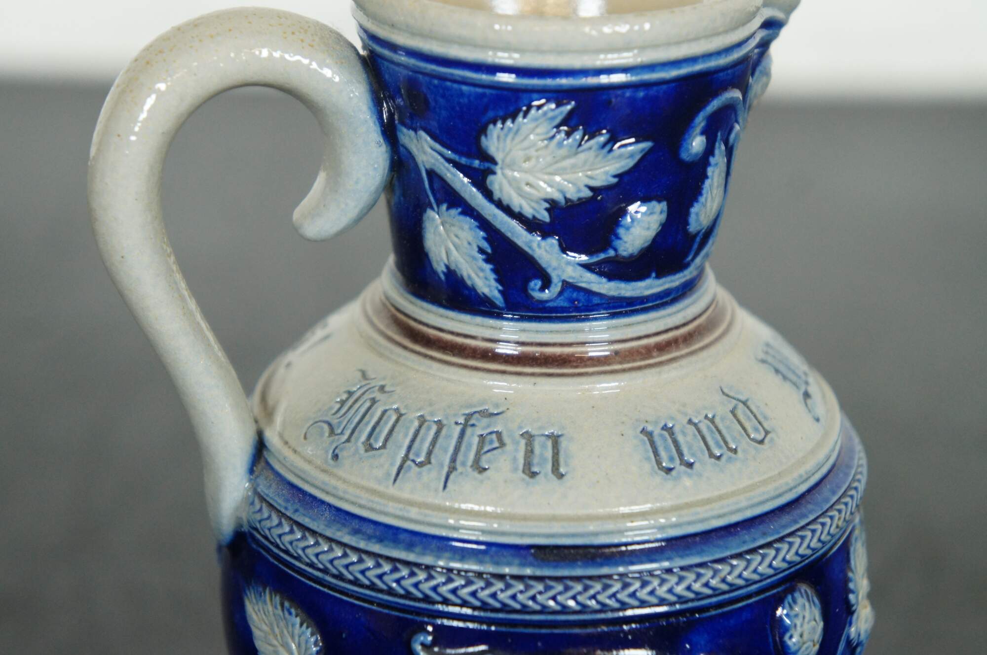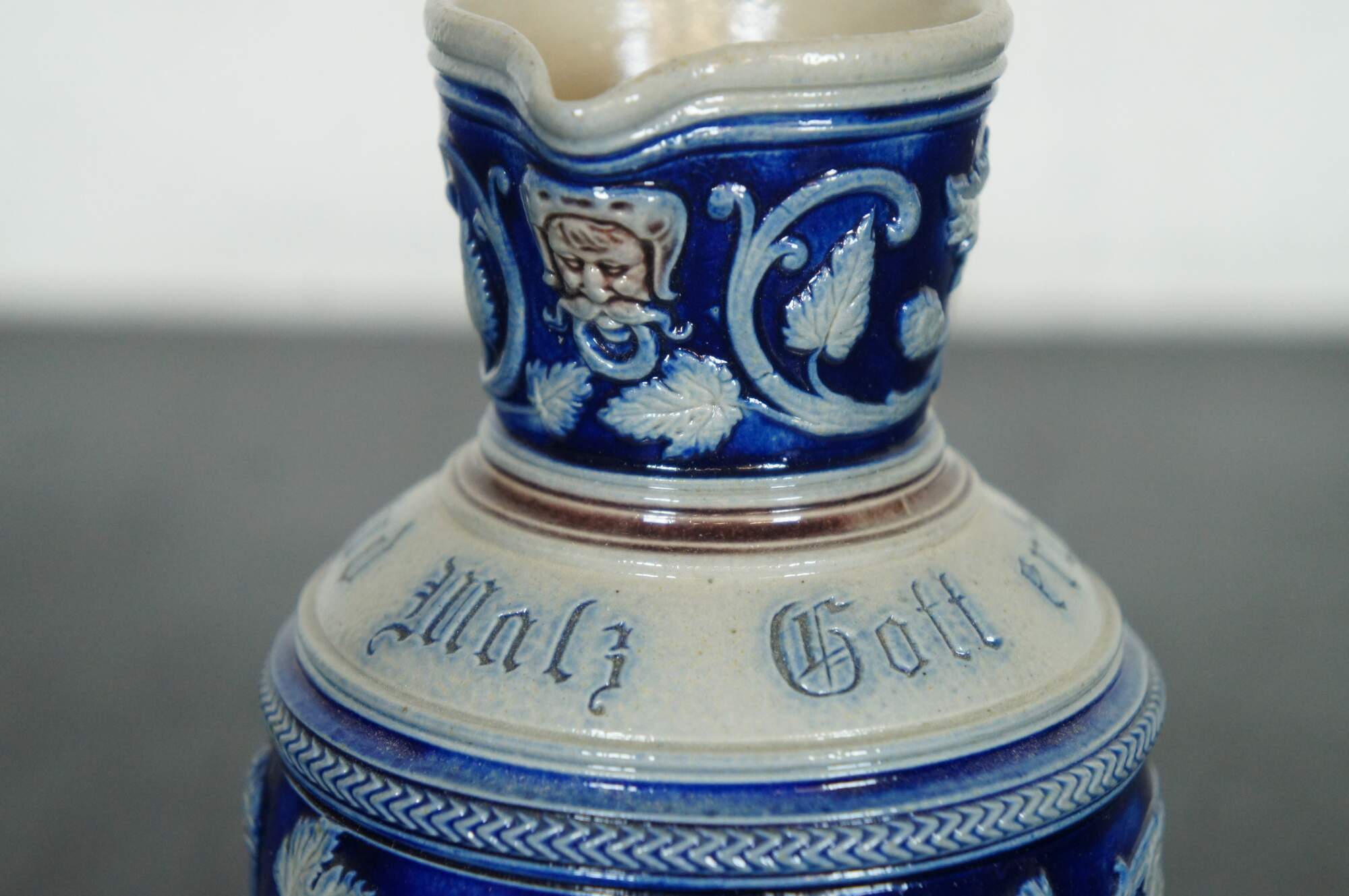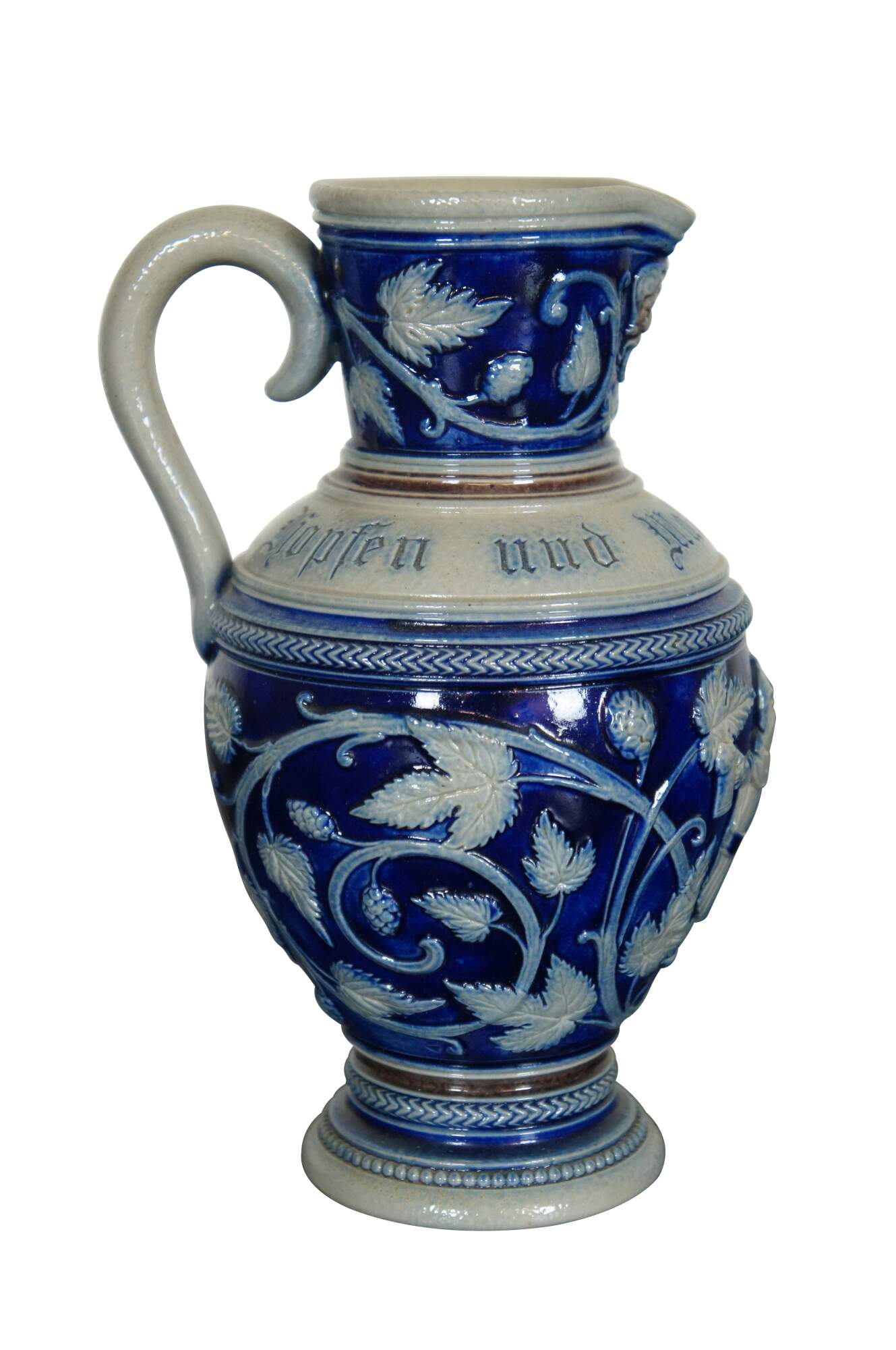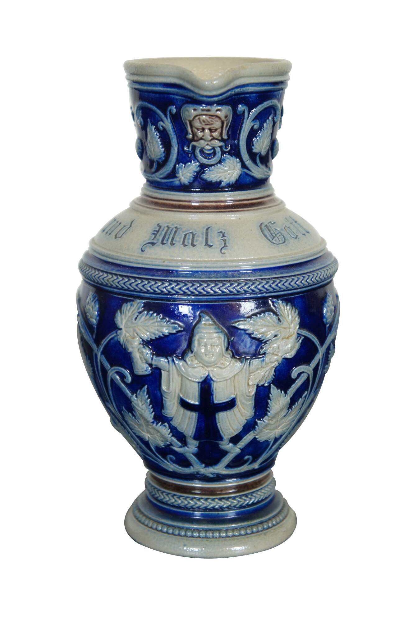 A lovely antique SImon Peter Gerz Stein / pitcher. Blue and white salt glaze with a monk at the center wrapped within scrolling hops and barley. Text reads: Hopfen und Malz Gott erhalt’s! Hops and malt, may the Lord preserve it. The pitcher has a vivid raised details and a face below the spout.