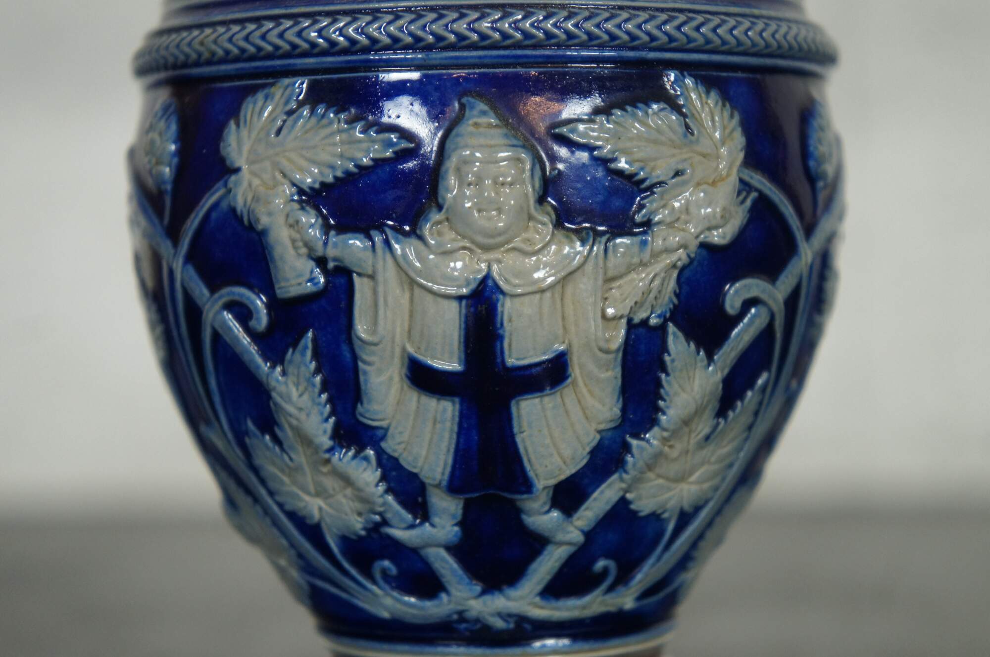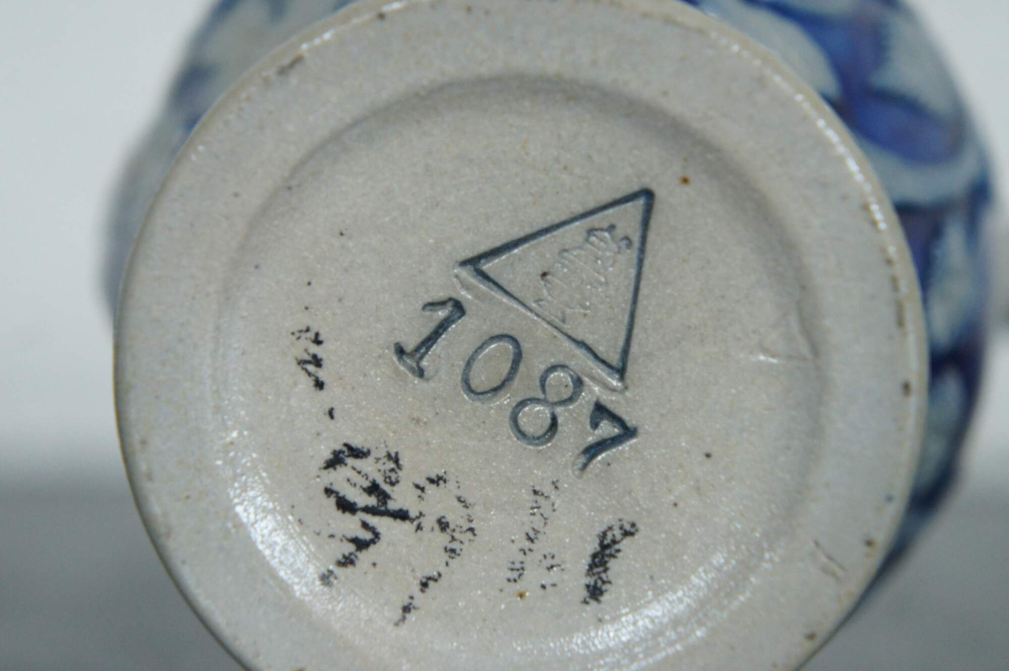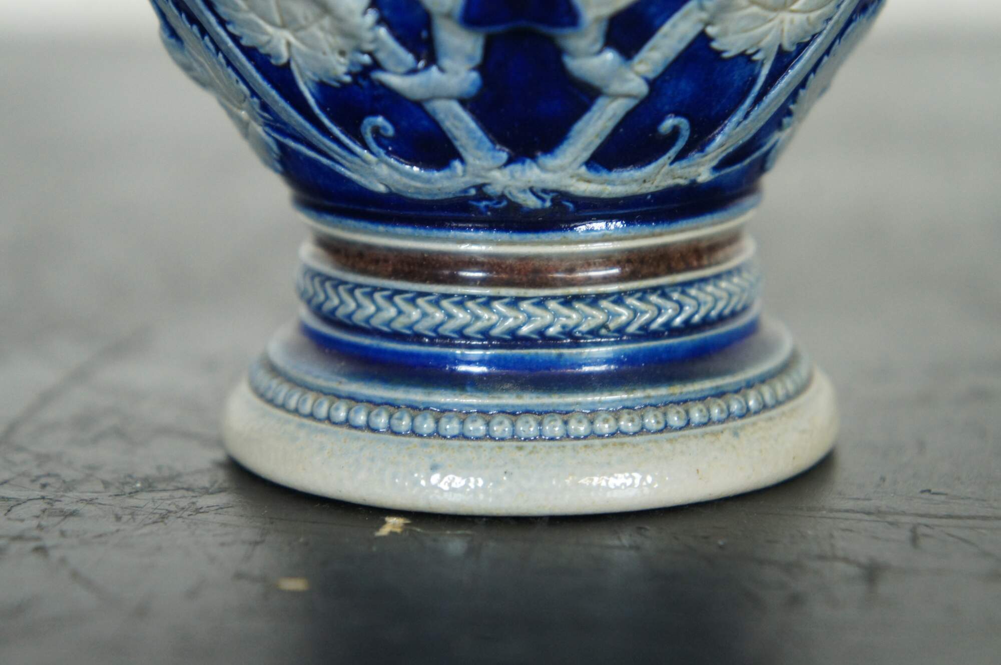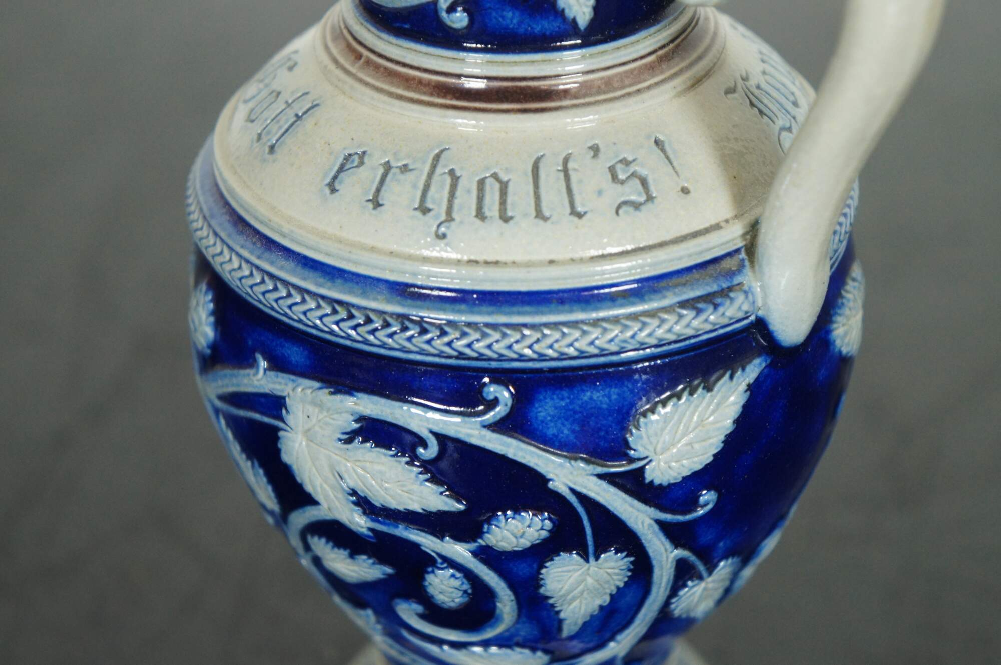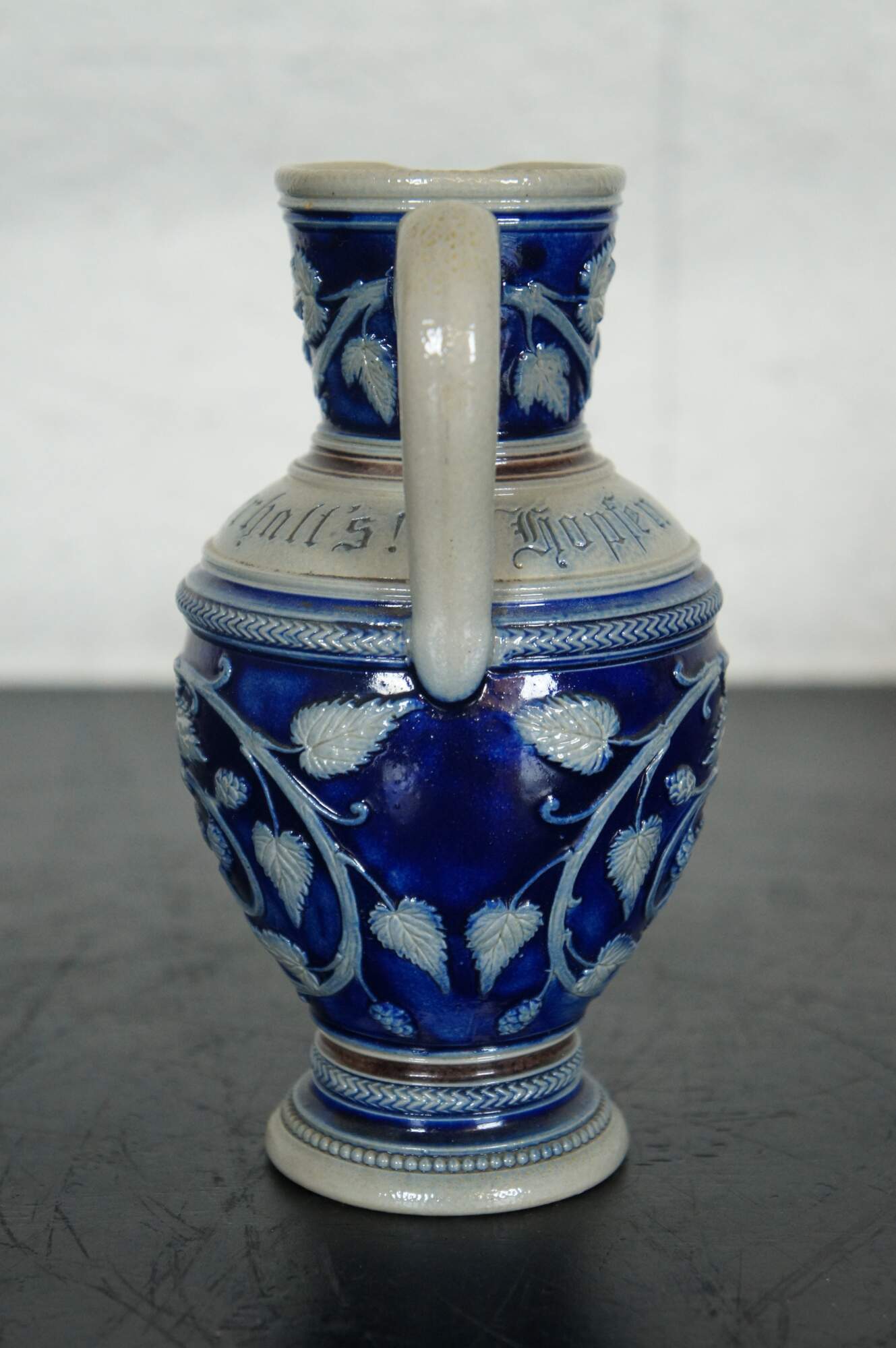 A lovely antique SImon Peter Gerz Stein / pitcher. Blue and white salt glaze with a monk at the center wrapped within scrolling hops and barley. Text reads: Hopfen und Malz Gott erhalt’s! Hops and malt, may the Lord preserve it. The pitcher has a vivid raised details and a face below the spout.
