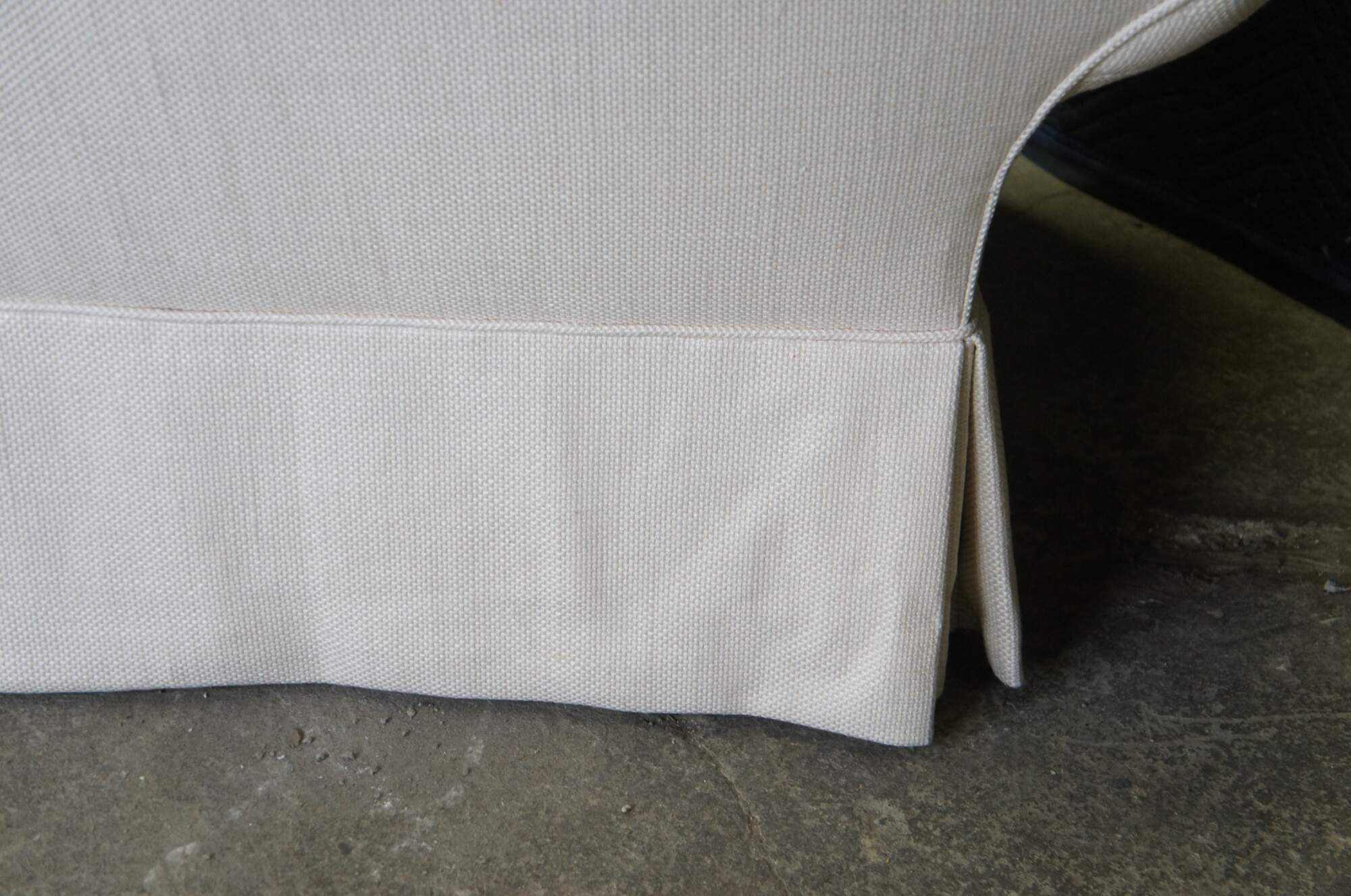 Vintage pair of two contemporary / modern lounge sofas featuring plush overstuffed rolled arm design with off white cotton fabric, skirted base and lumbar pillows. Attributed to Taylor King.