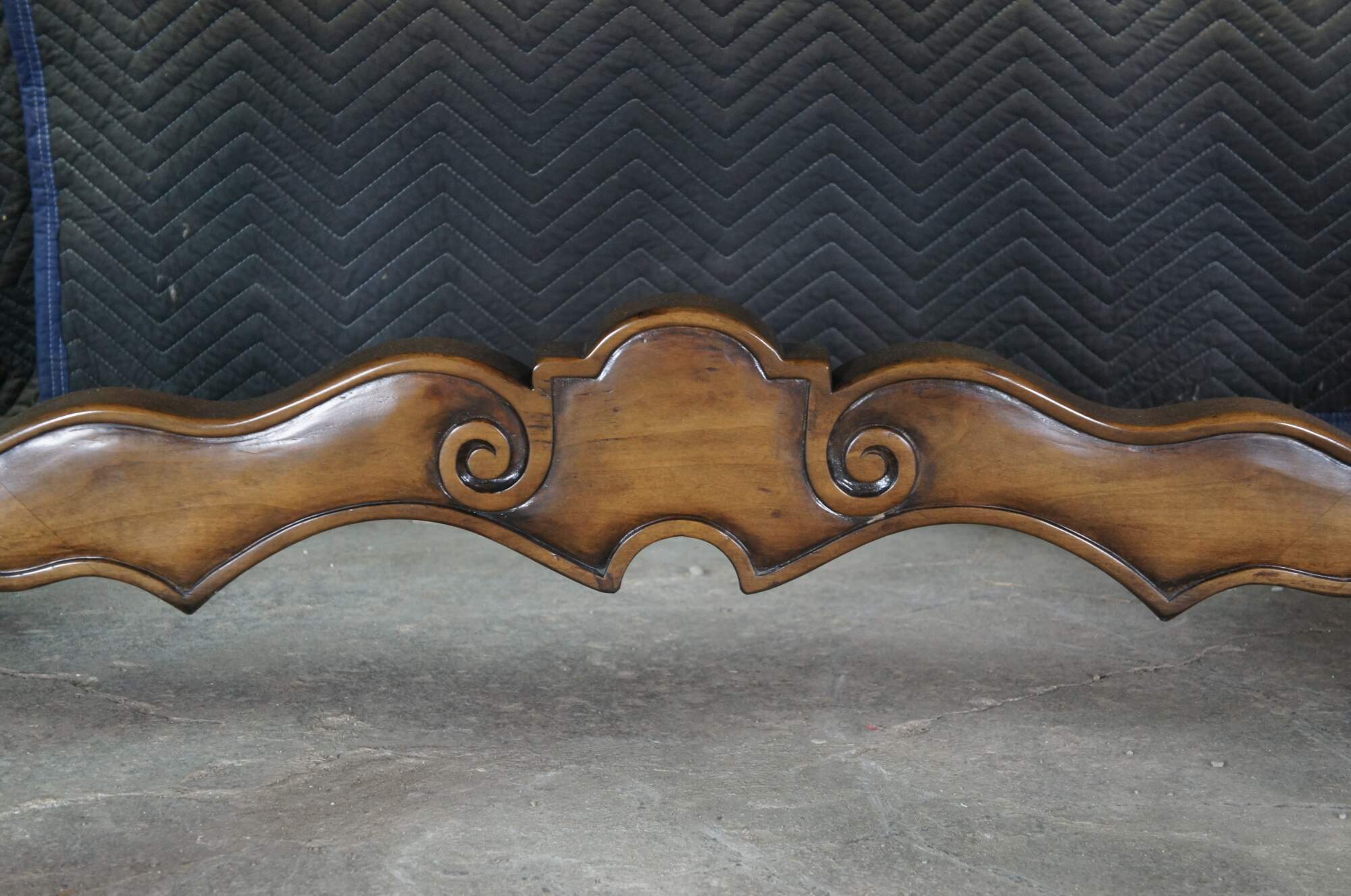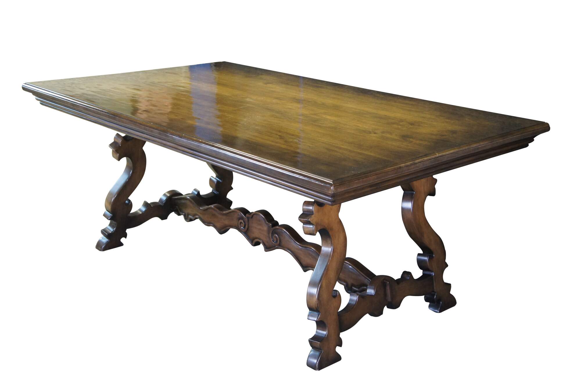 Vintage Spanish Revival / Tuscan / old world dining table. Made of walnut featuring rectangular form with carved baroque serpentine legs connected by a trestle.