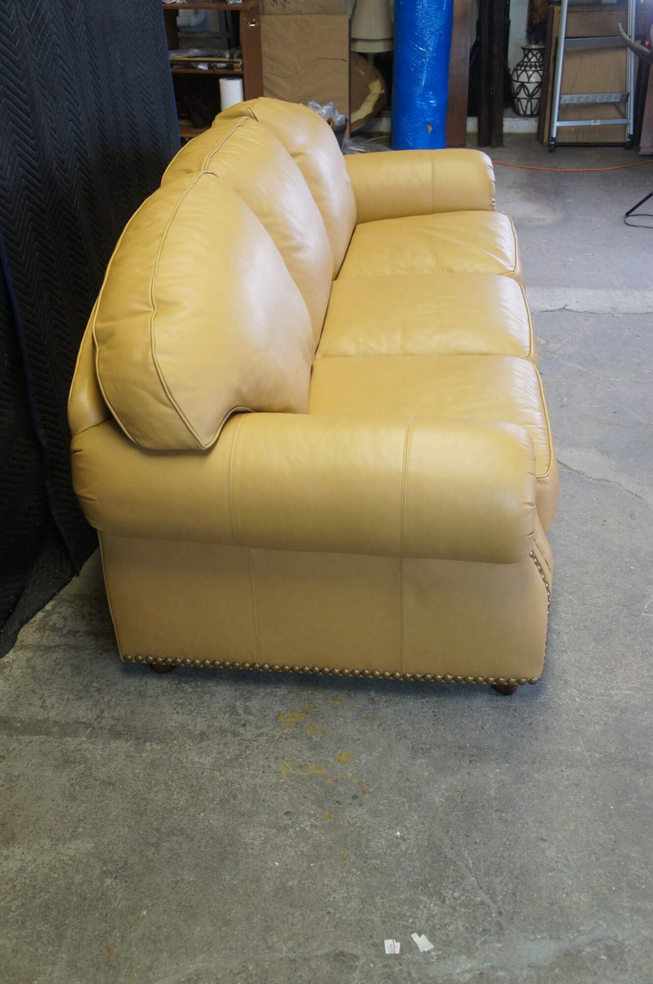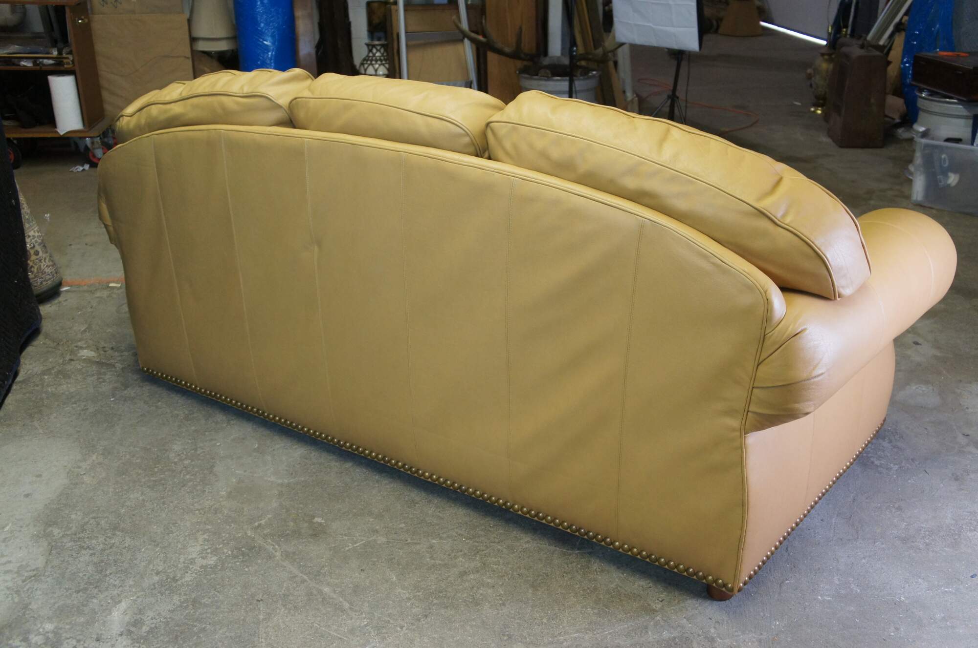 Vintage Taylor King three seat sofa or couch with pull out queen size sleeper bed. Features camel tan colored leather with rolled arms and oversized nailhead trim. Three seats remove to pull out sofa bed, which easily unfolds. Includes Spremiere Sleep in Sofa Mattress Featuring Dual Comfort by Kingsdown. Very heavy.
