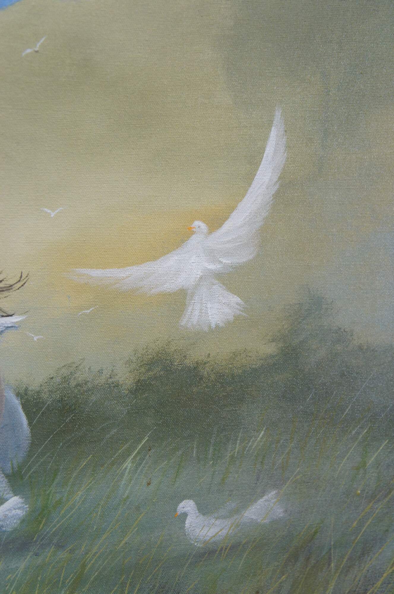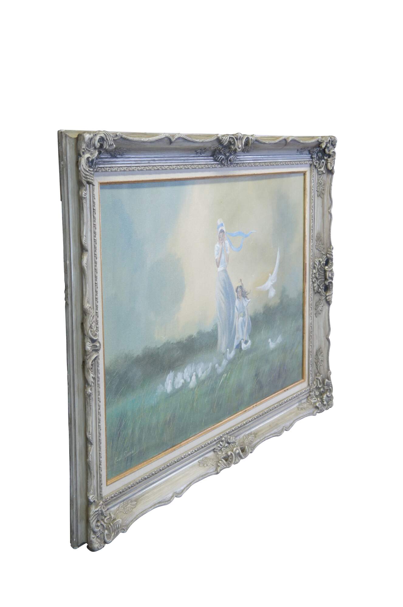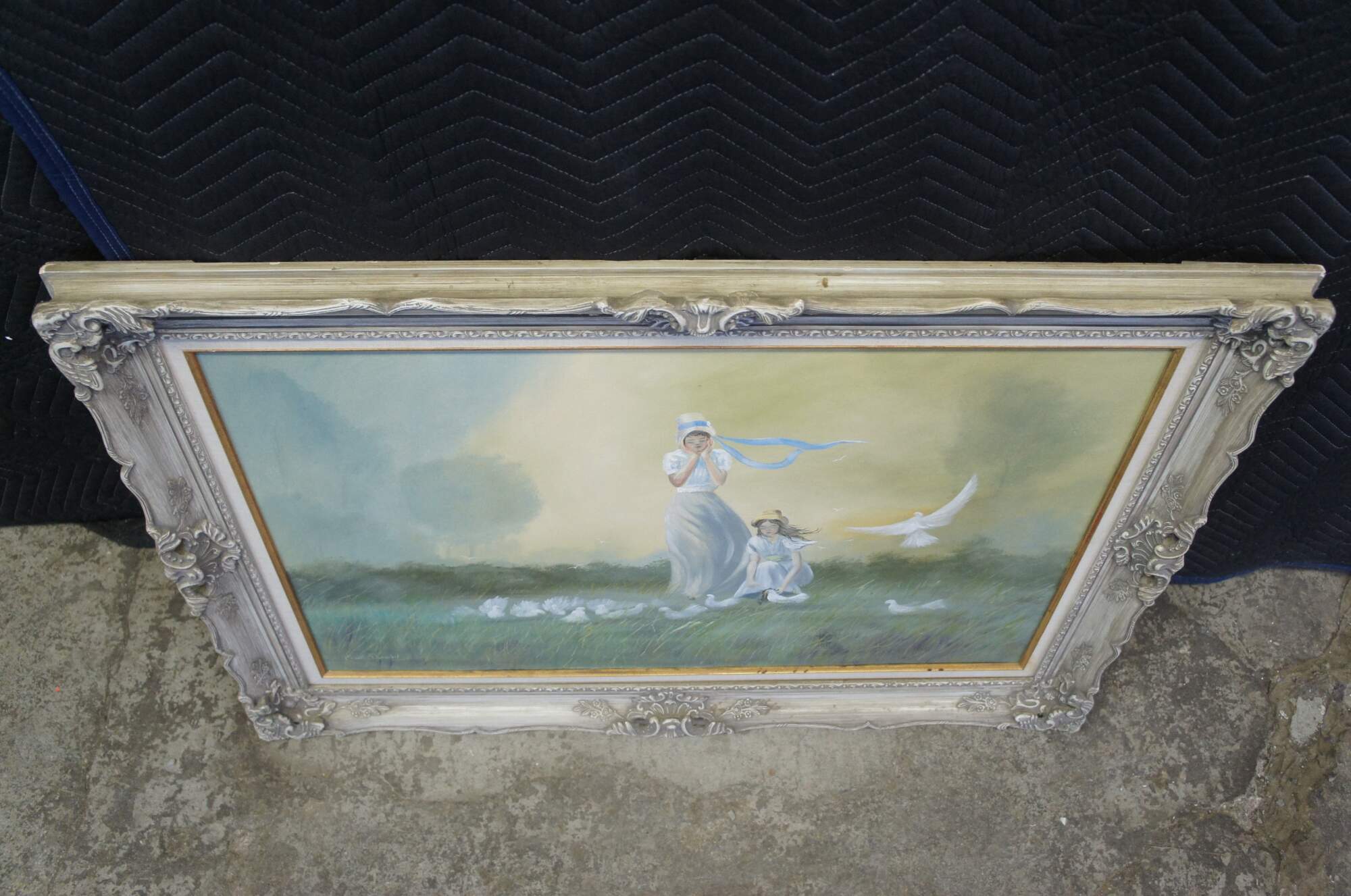 Vintage Erroll Dorschel original landscape oil painting on canvas. Featuring two girls walking through the prairie with birds / doves. Framed in scalloped baroque frame.