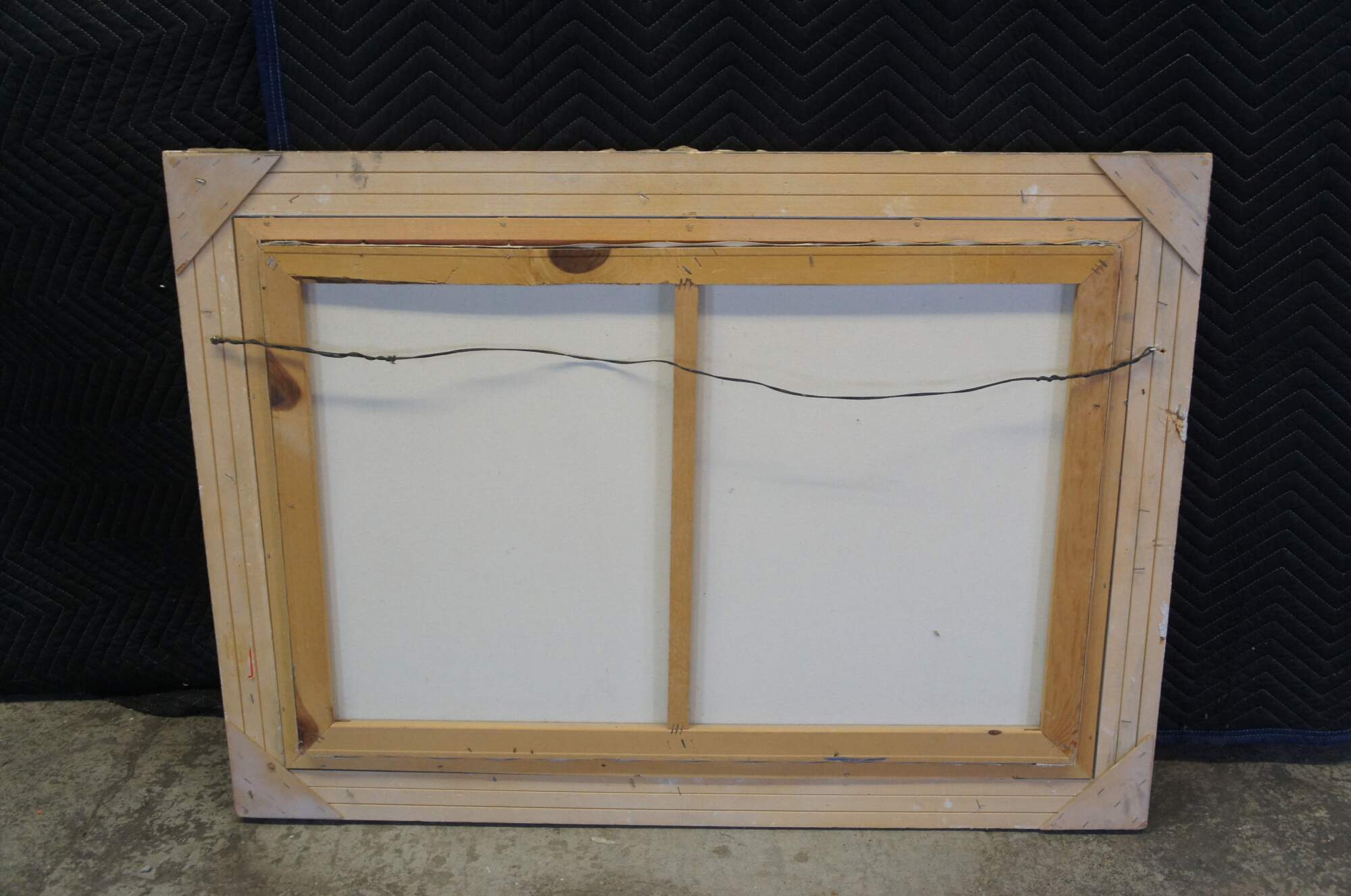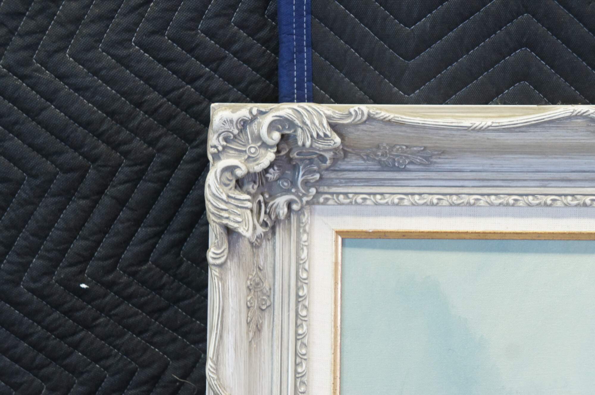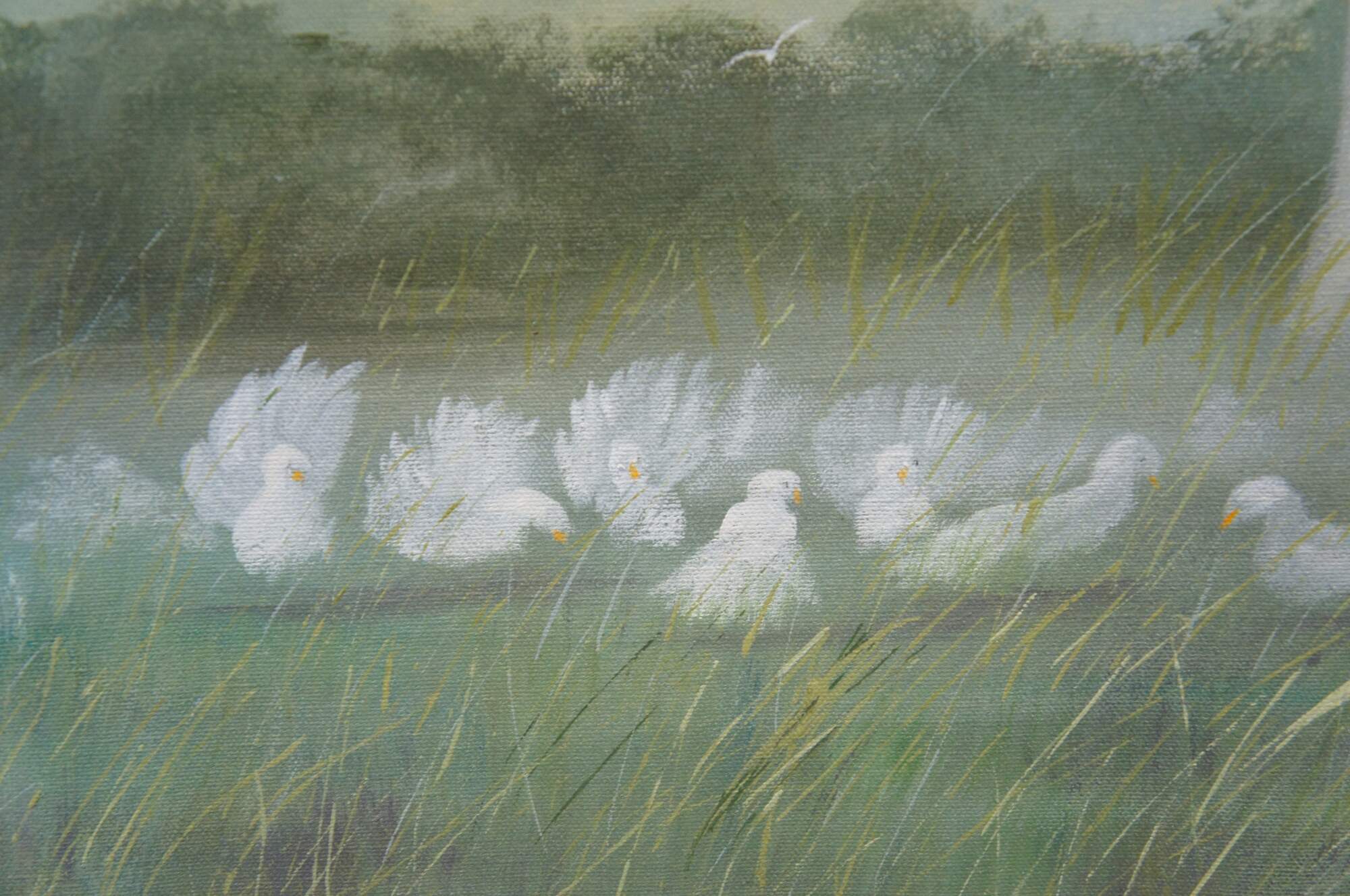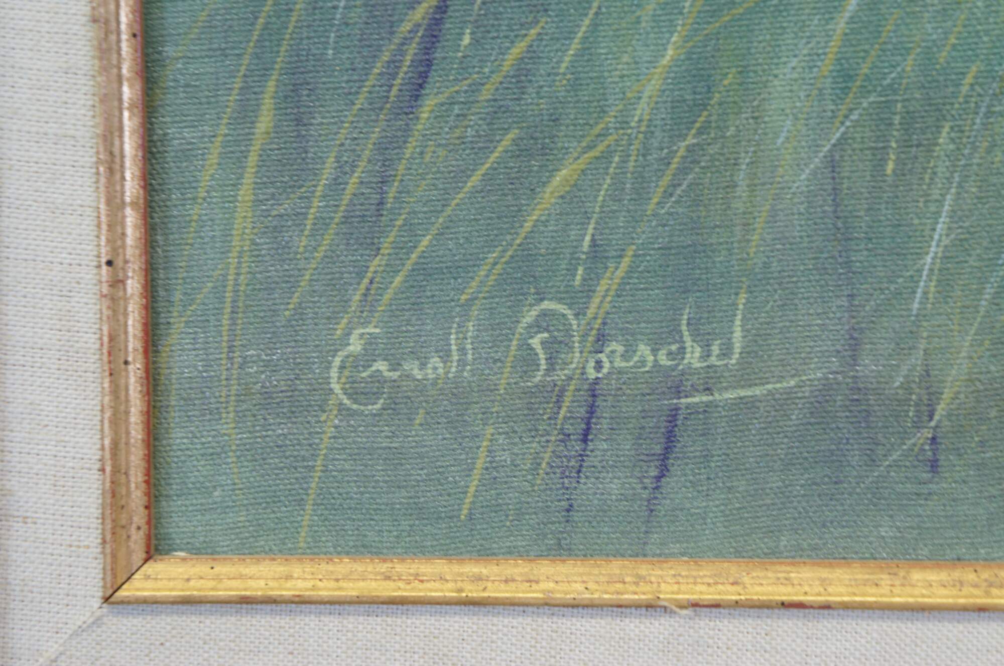 Vintage Erroll Dorschel original landscape oil painting on canvas. Featuring two girls walking through the prairie with birds / doves. Framed in scalloped baroque frame.