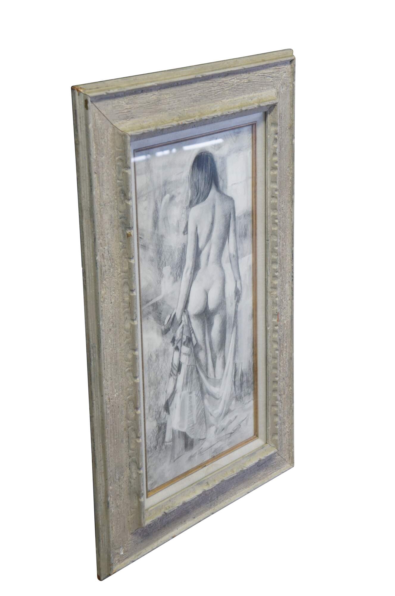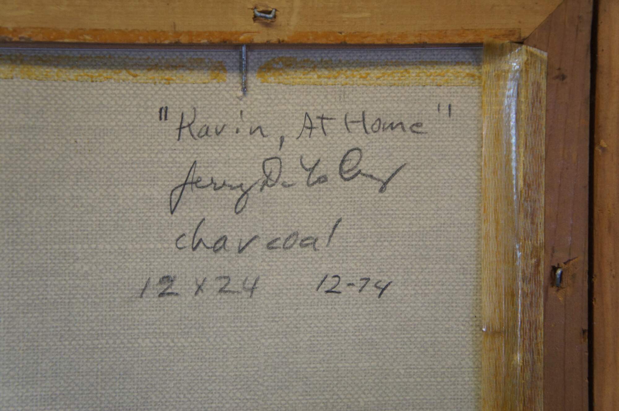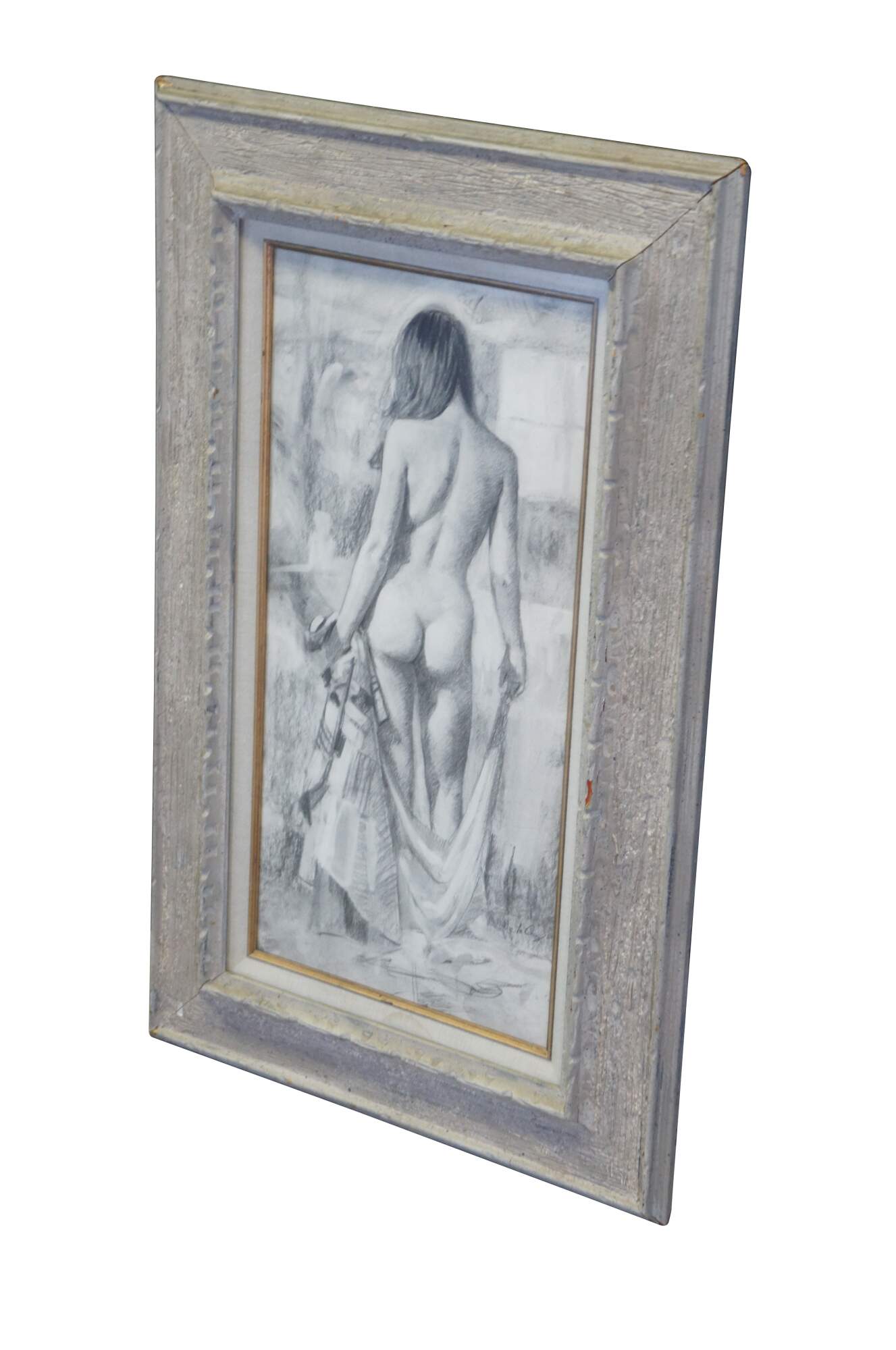 Vintage Jerry Del La Cruz original charcoal drawing on paper titled Kavin, At Home. Features a nude female figure undressing. Circa 1974.