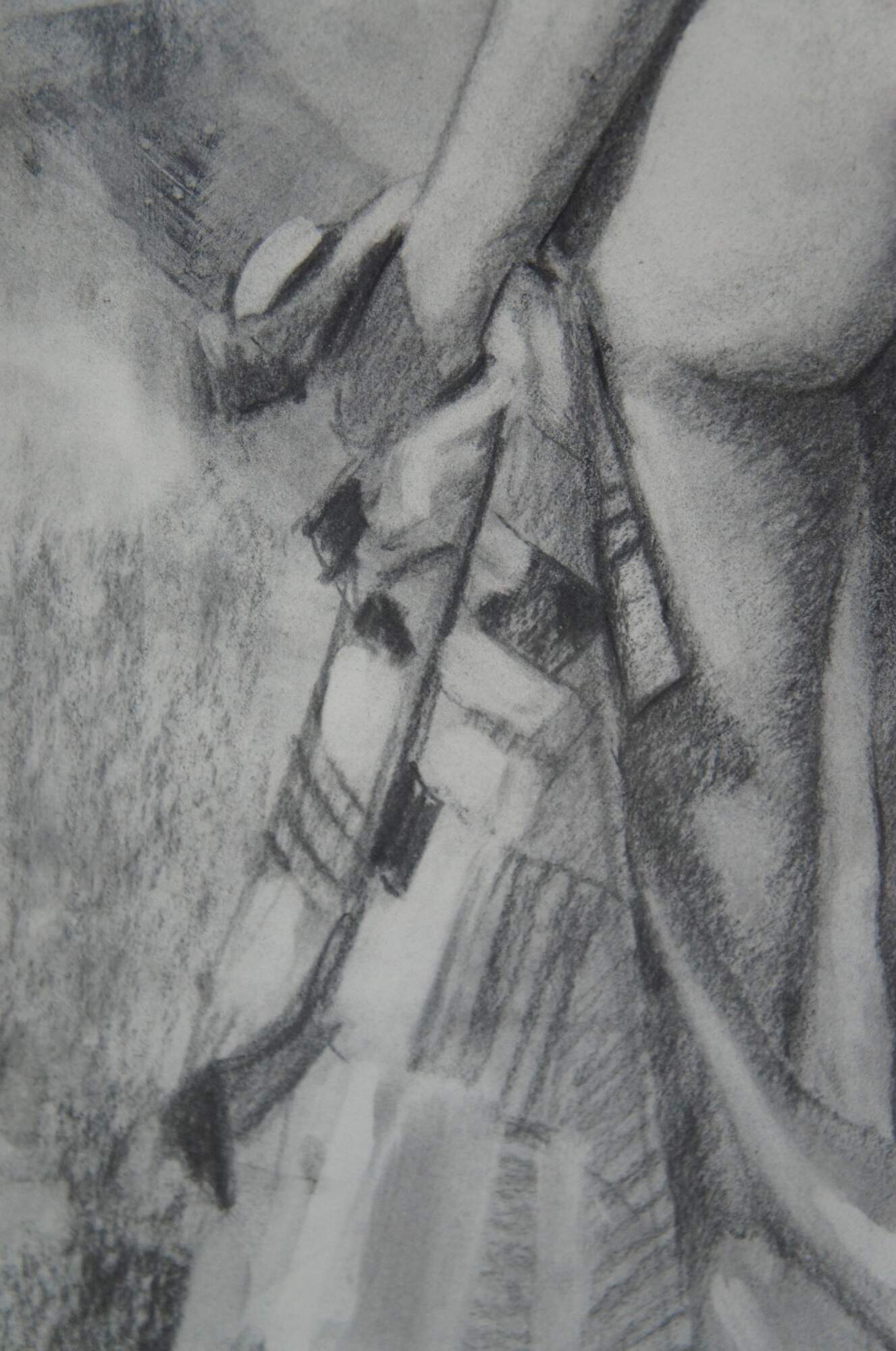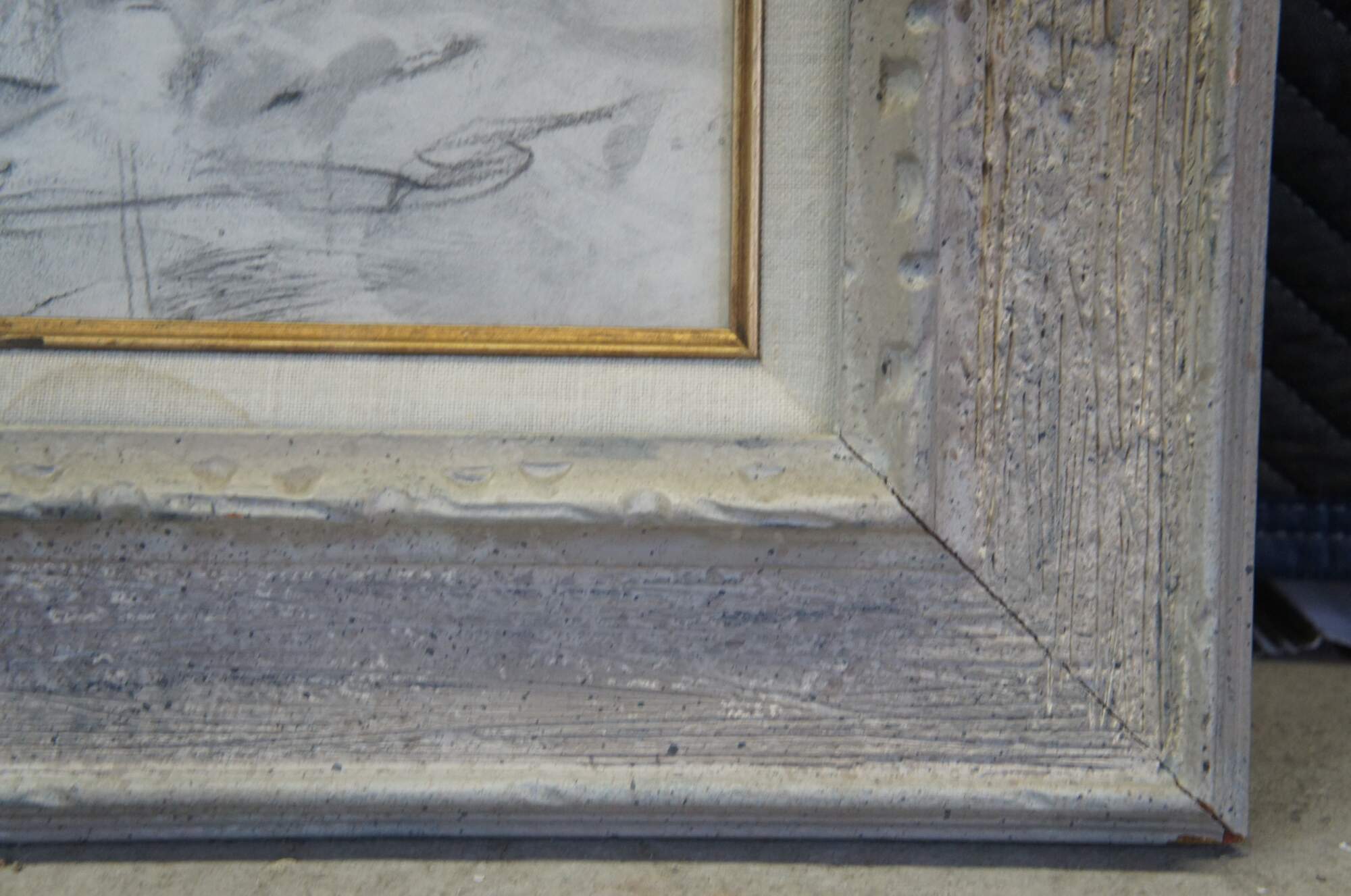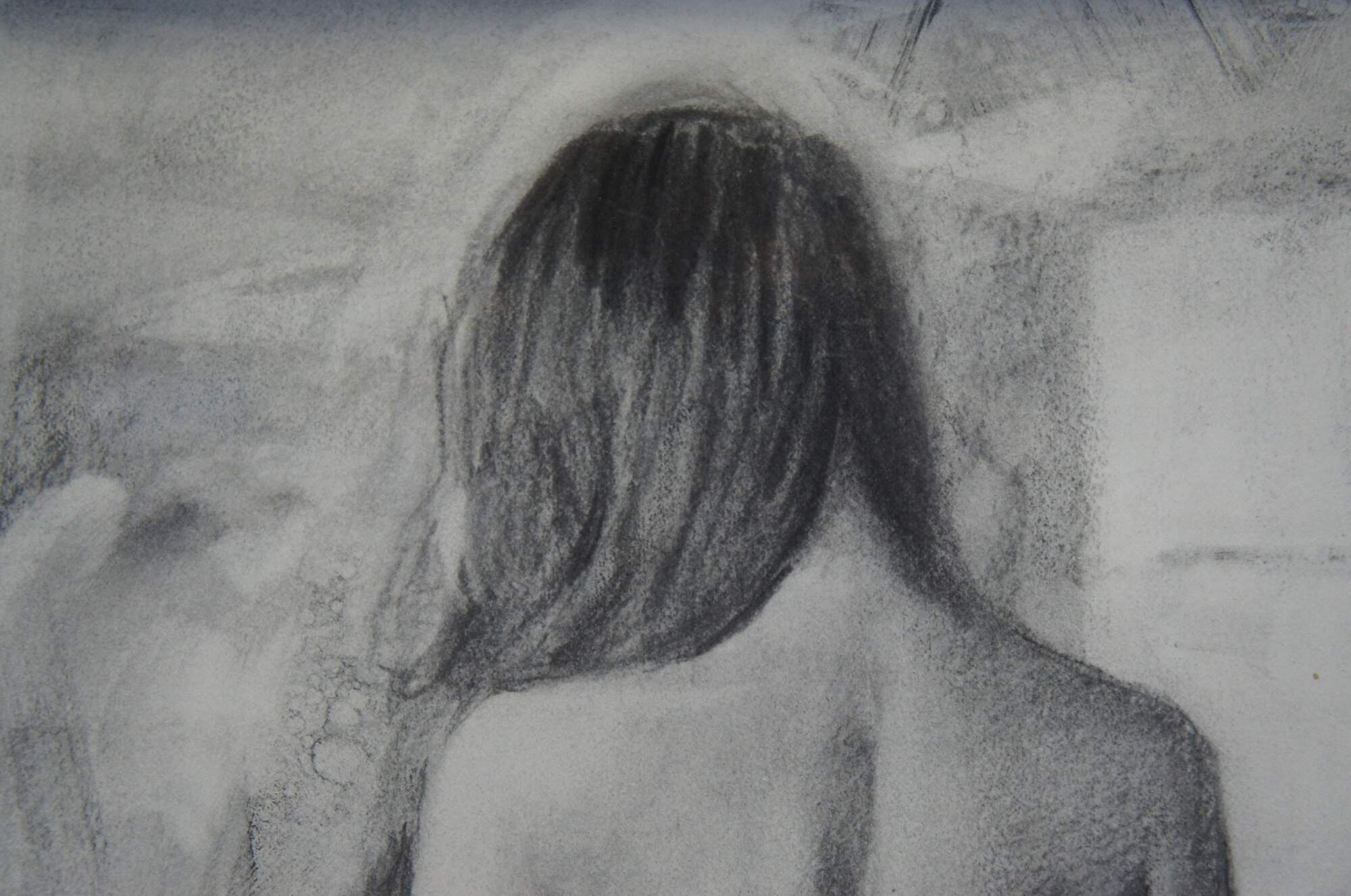 Vintage Jerry Del La Cruz original charcoal drawing on paper titled Kavin, At Home. Features a nude female figure undressing. Circa 1974.