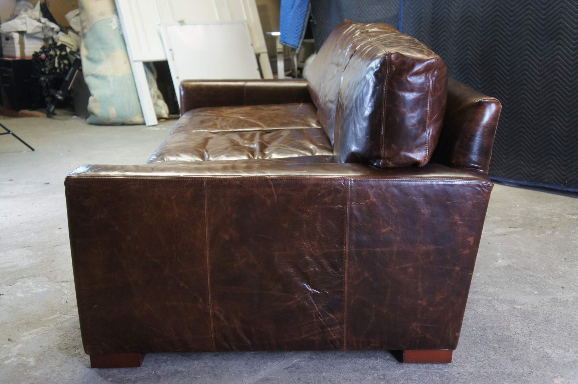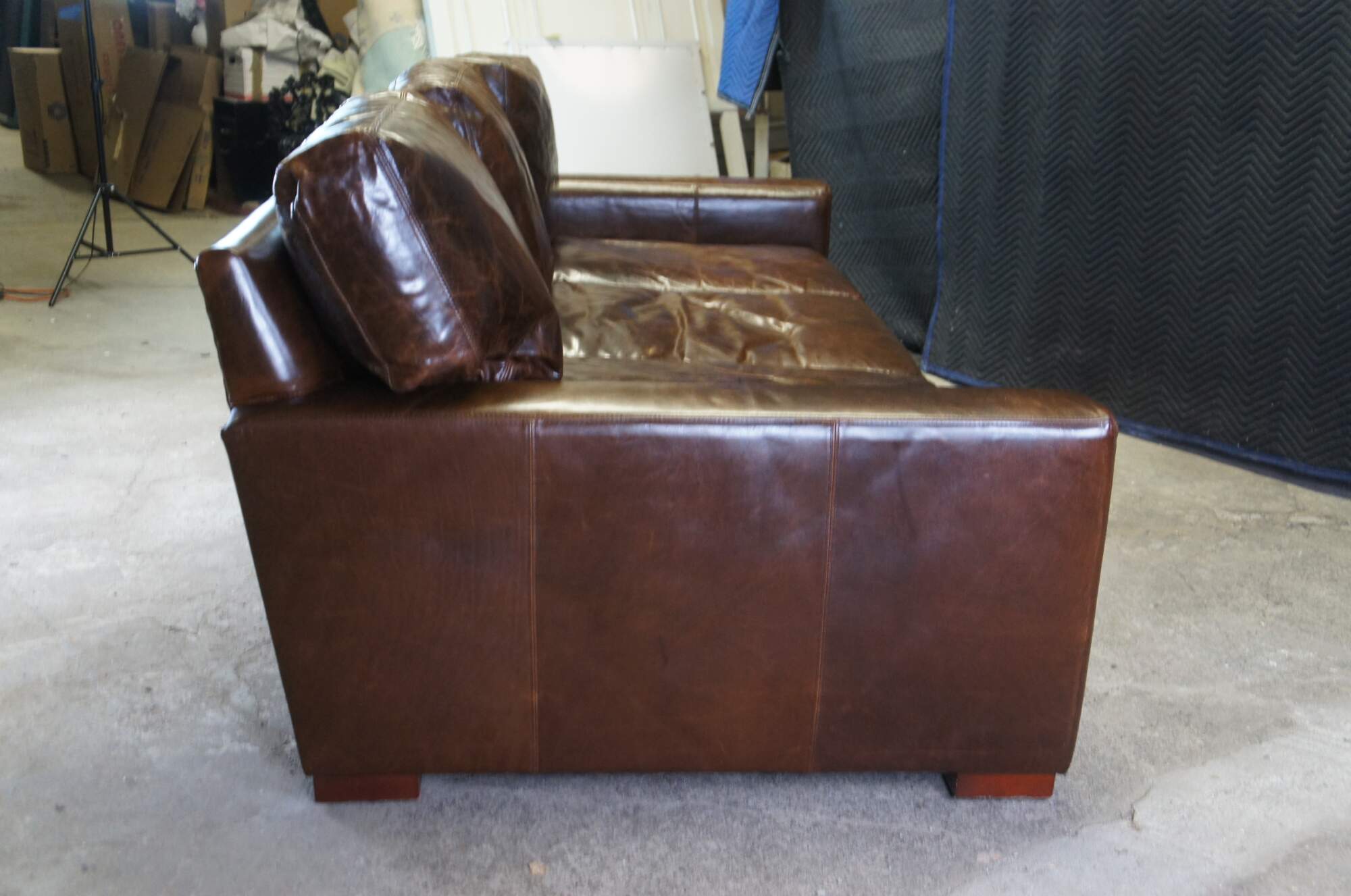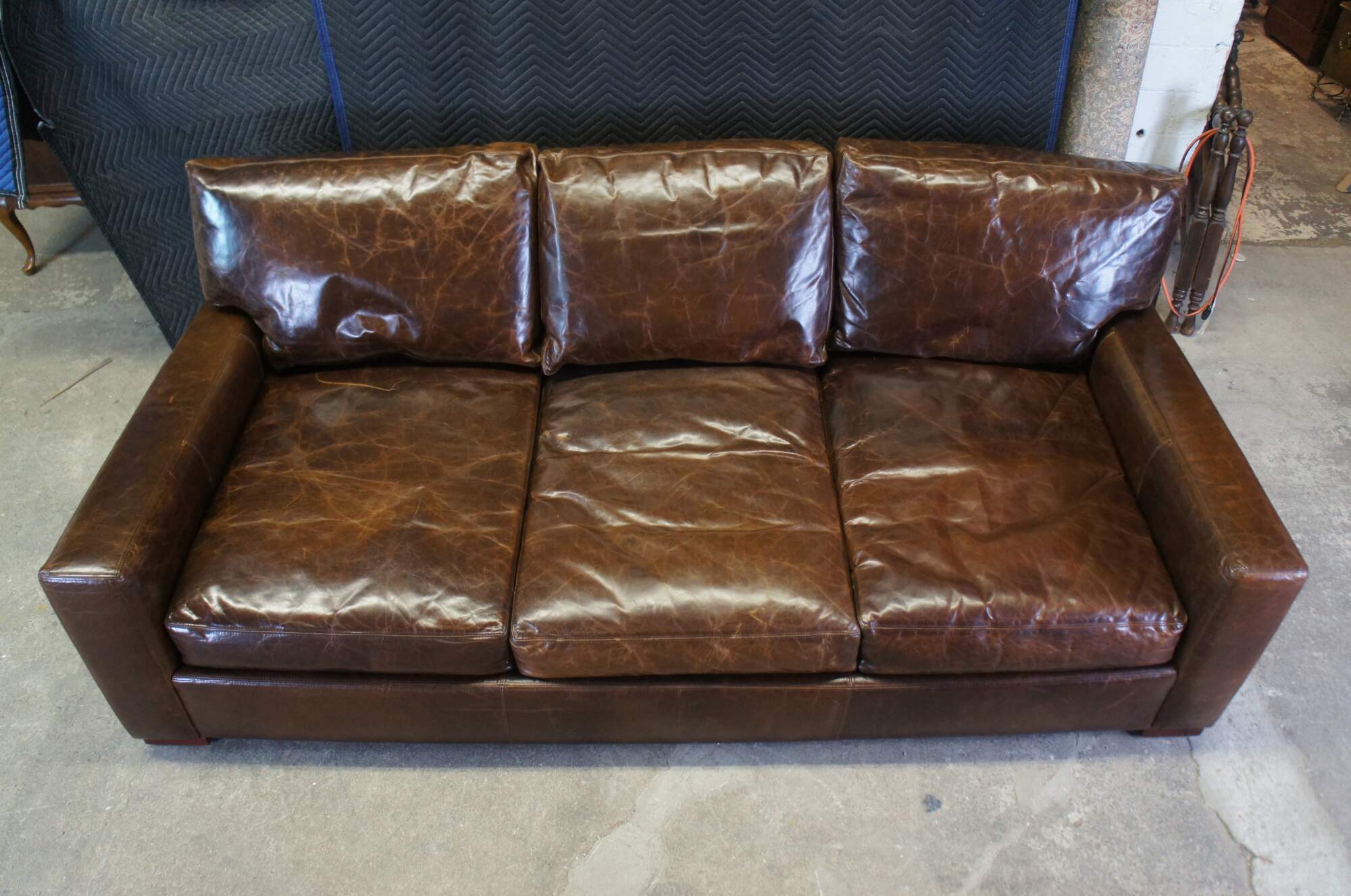 A luxurious 3 Seater sofa by Restoration Hardware. The Maxwell is upholstered in a supple cocoa brown leather for maximum comfort. Cutting a clean lined silhouette with ultra-deep proportions, this sofa features squared, track arms and a modernist, low-slung profile. Soft-to-the-touch leather and overstuffed down filled back and seat cushions complete this supreme piece of living room or den furniture.