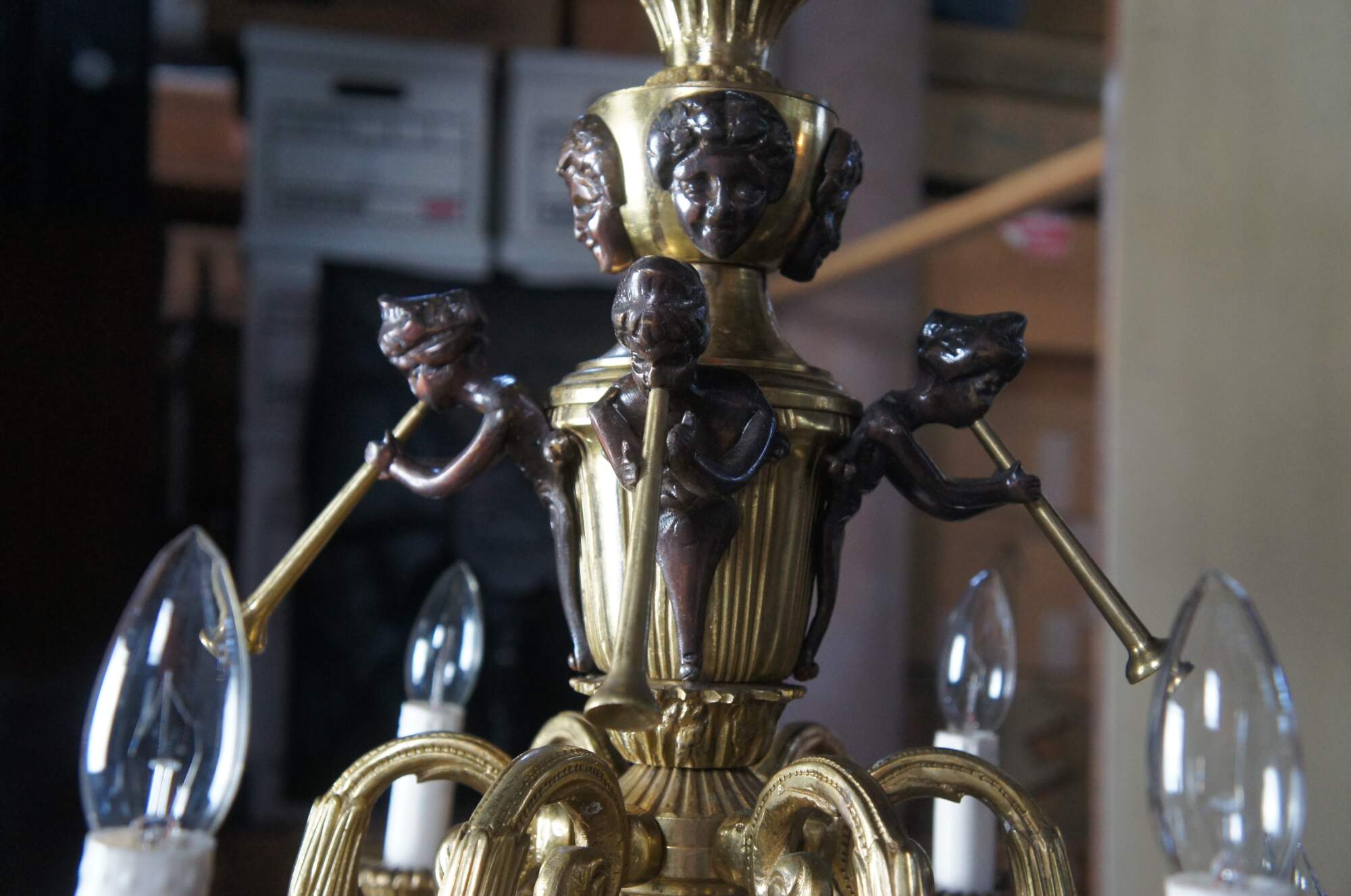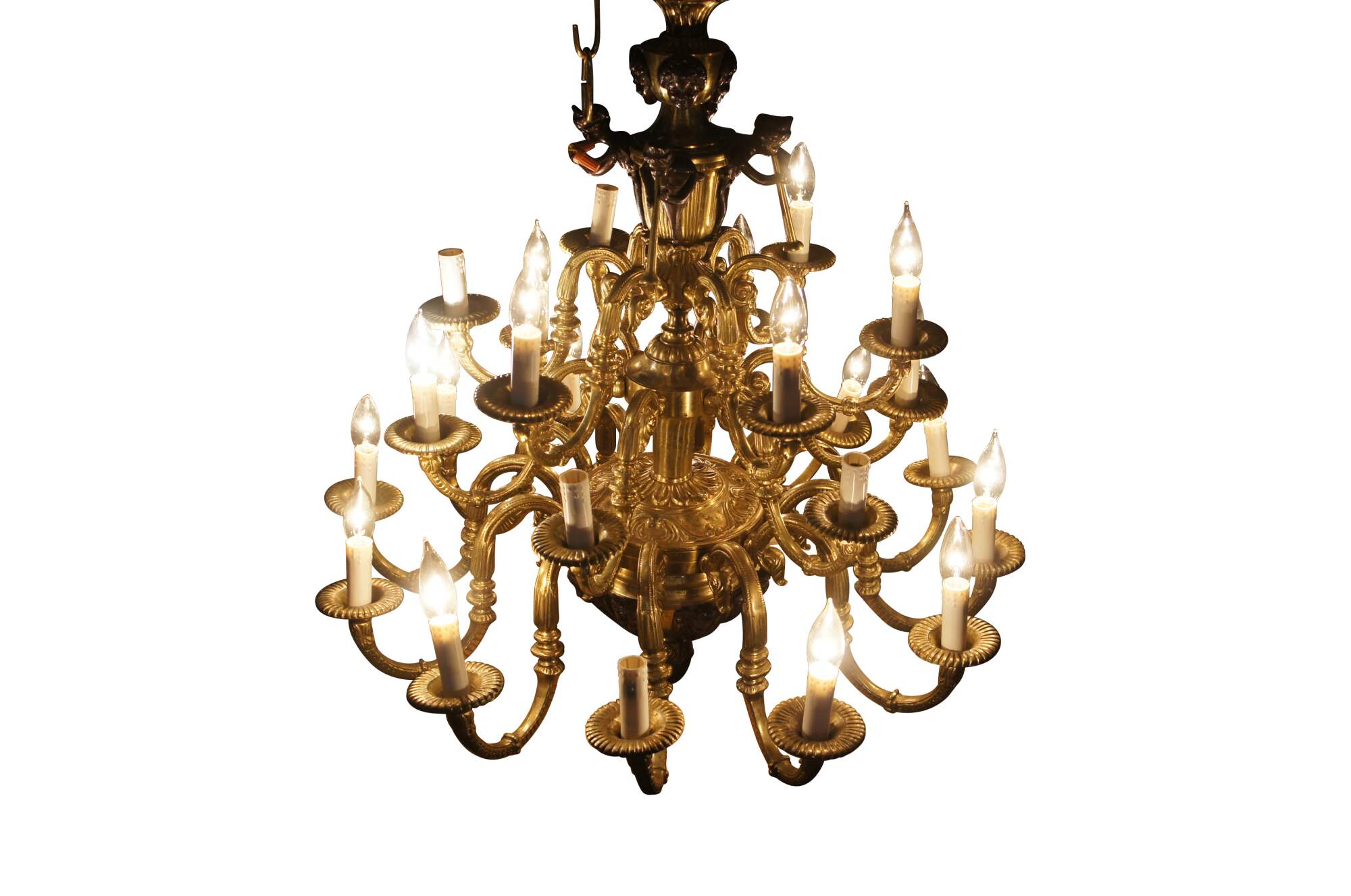 Impressive Louis XV / French Empire / Pierre Gouthière style gilt bronze twenty four light, three tier Cherub / angel / trumpet candlestick chandelier. Made of gilt bronze featuring Cherubs / Puttis / Angels playing trumpets, surrounded by three tier layer of serpentine candlestick lights, and large acorn drop finial.