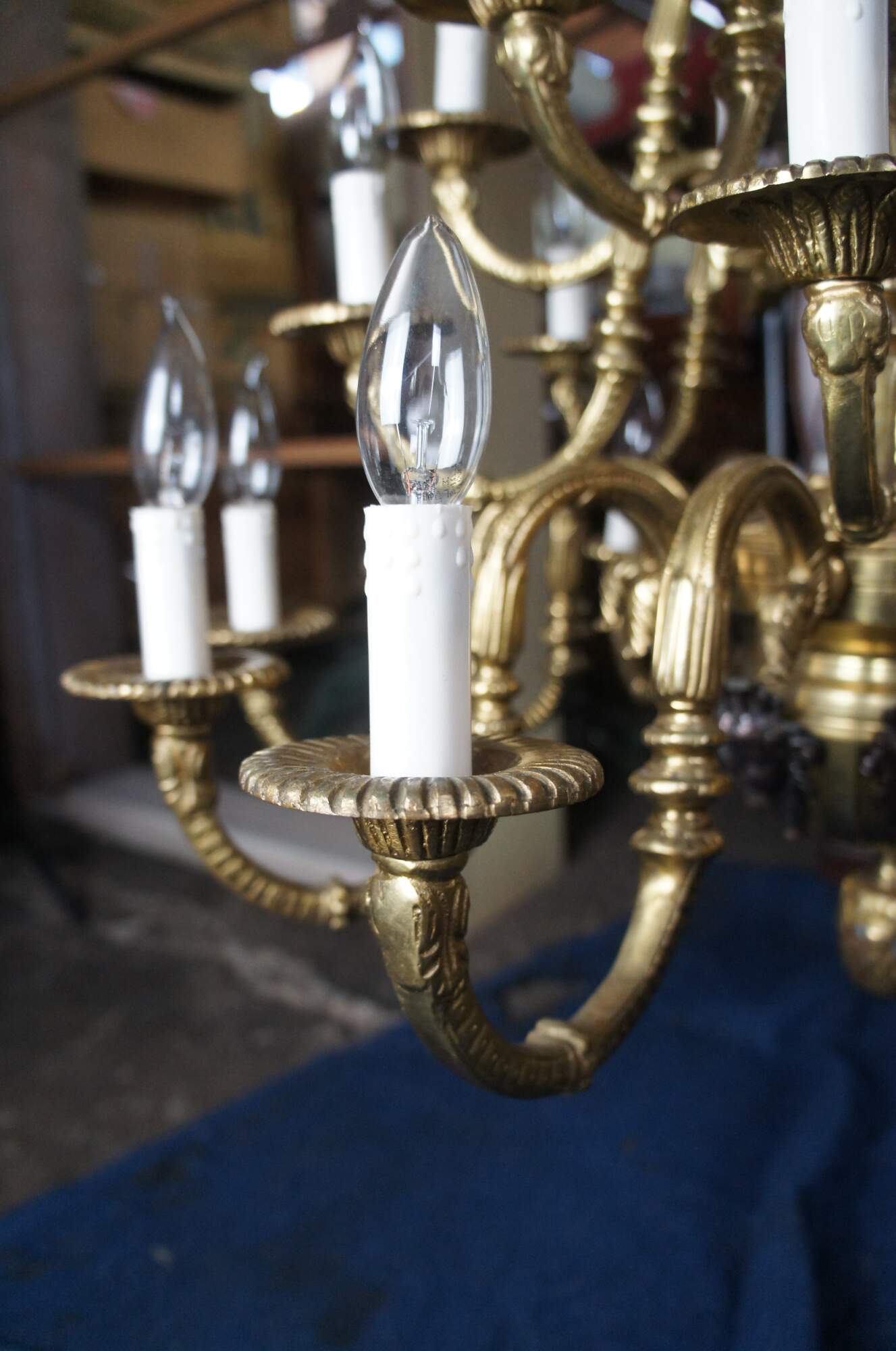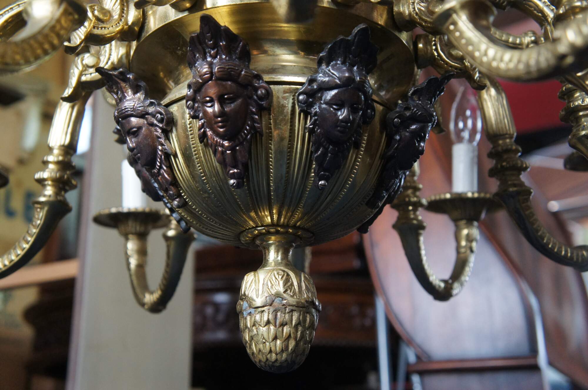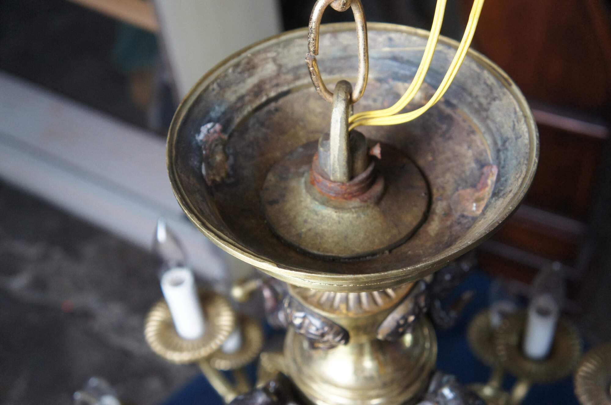 Good condition, very heavy, wear and distressing from age and use, a few of the arms need rewired, one horn was replaced.