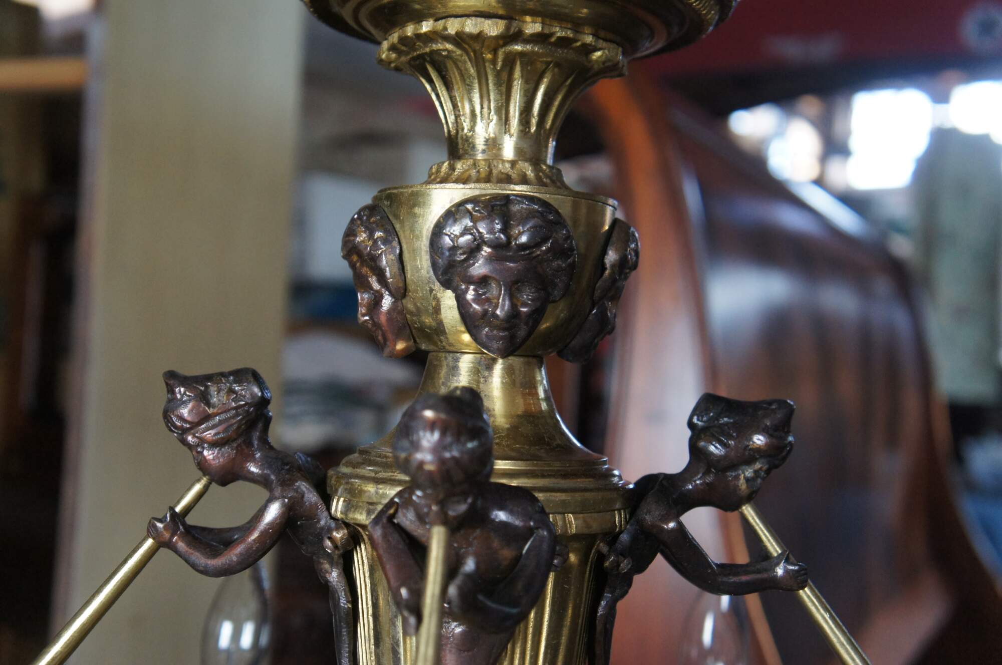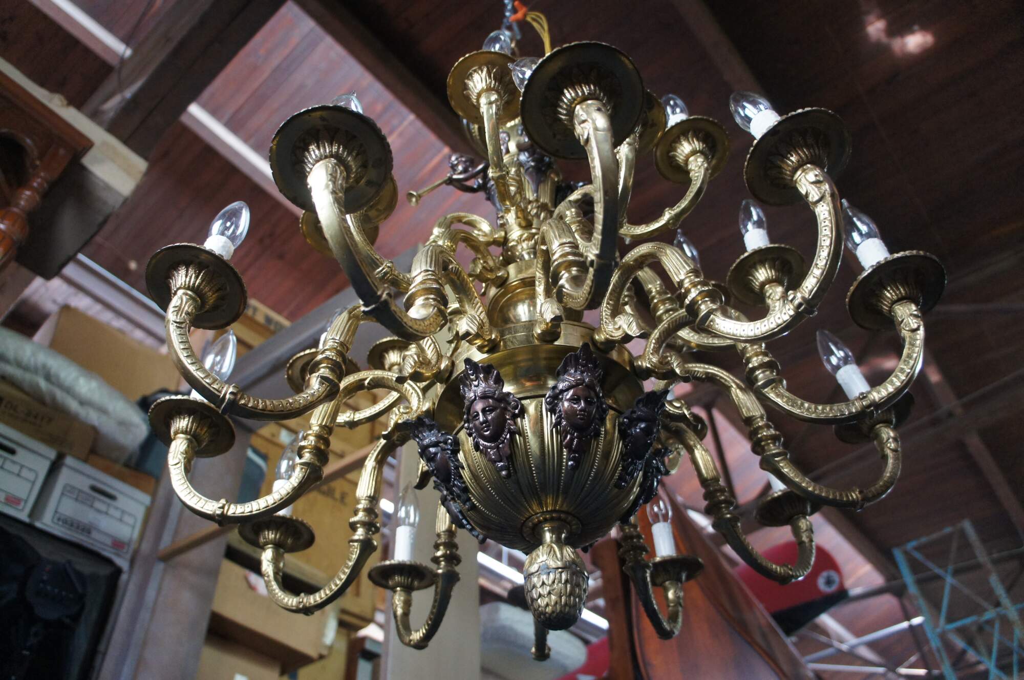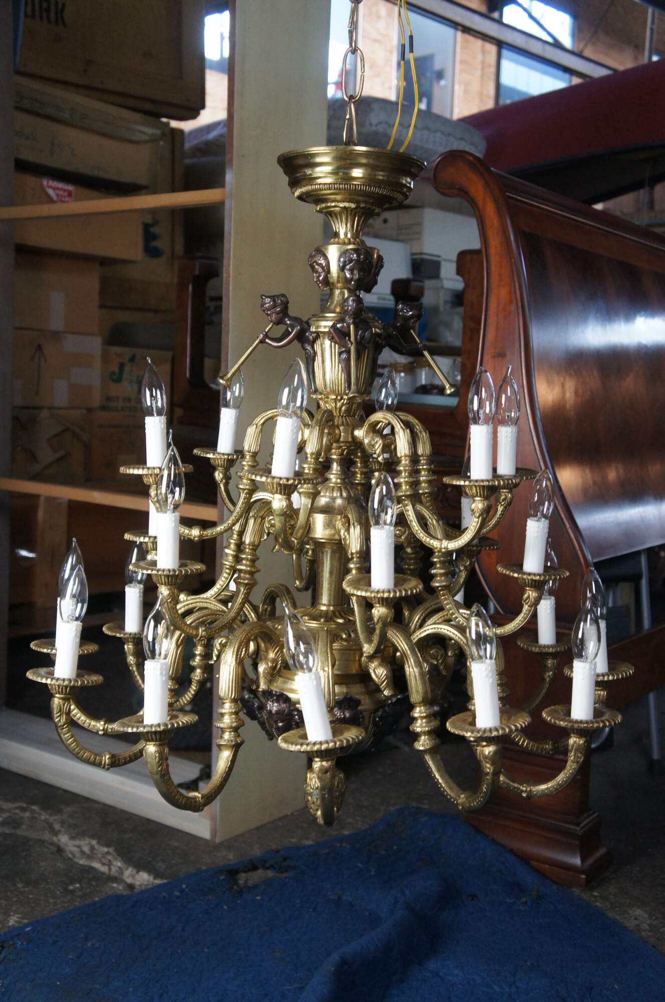 Good condition, very heavy, wear and distressing from age and use, a few of the arms need rewired, one horn was replaced.