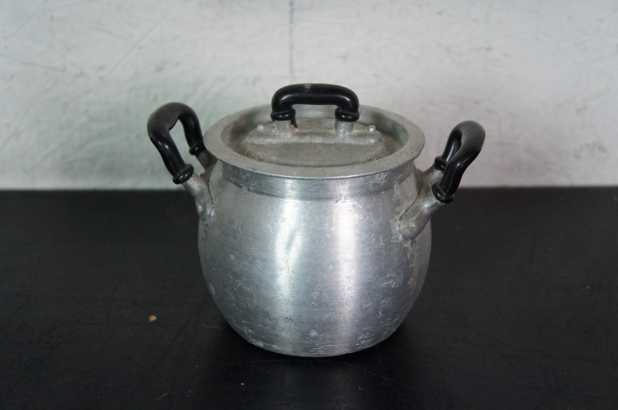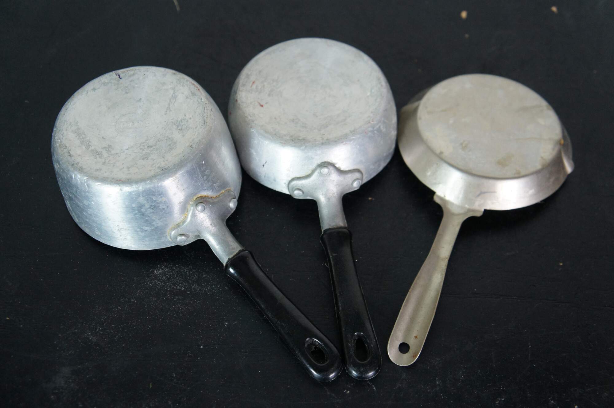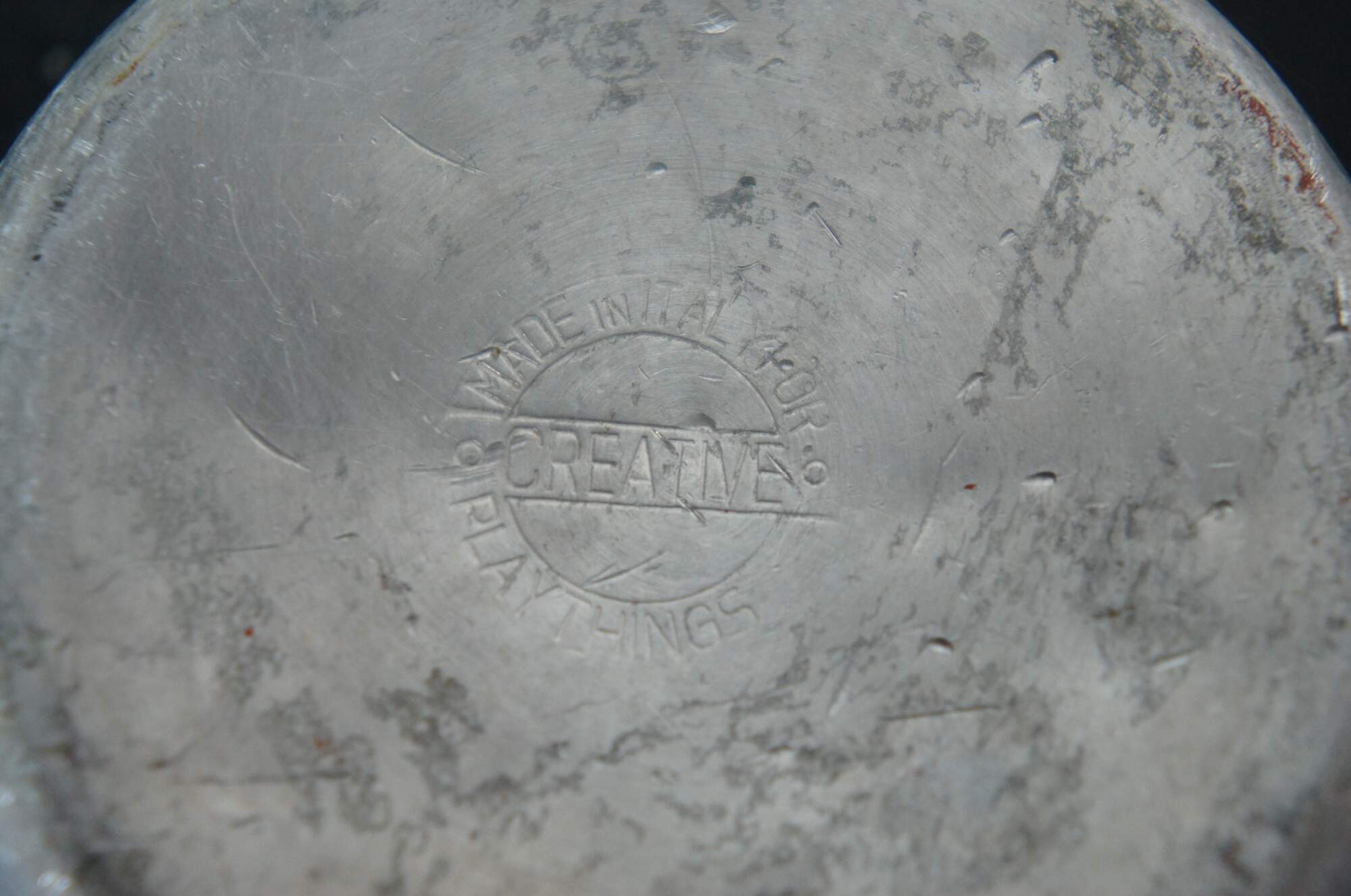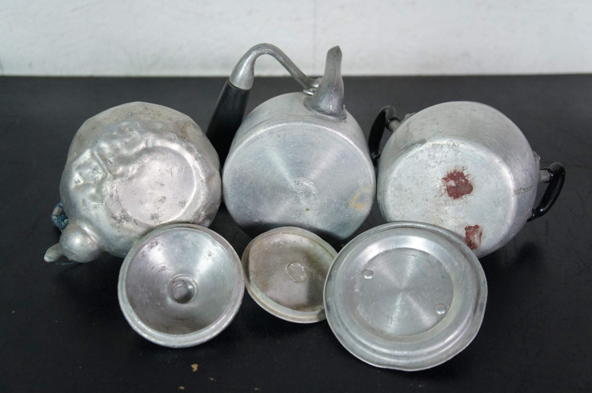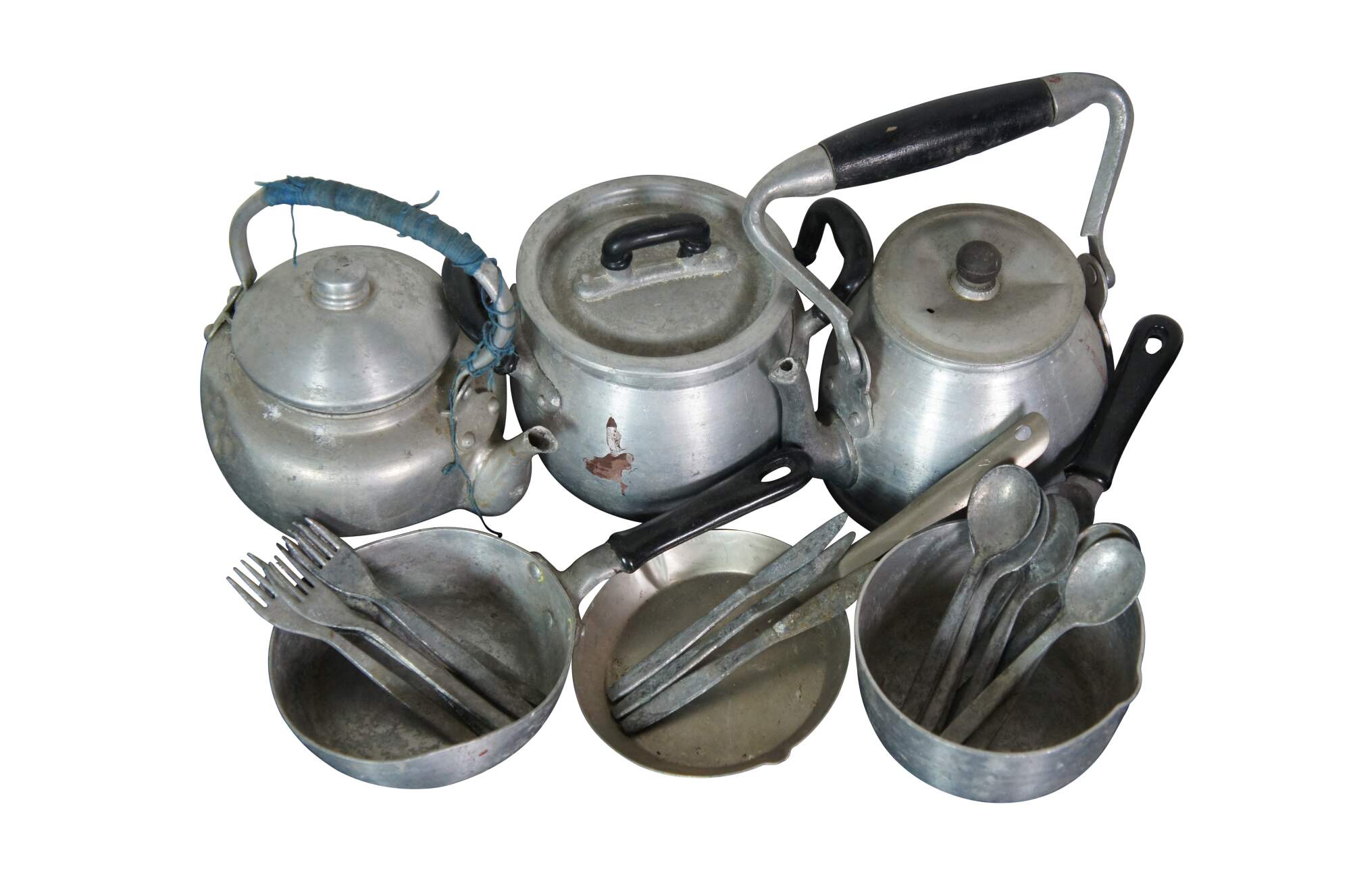 Mid 20th century 26 piece aluminum child's play set of cookware including two tea kettles, a lidded cauldron / cookie jar, sauce pan, 2 frying pans / skillets, 6 forks, 8 spoons, and 3 knives. Some by Sigg / Swiss Made, some by Crative Playthings / Made in Italy.