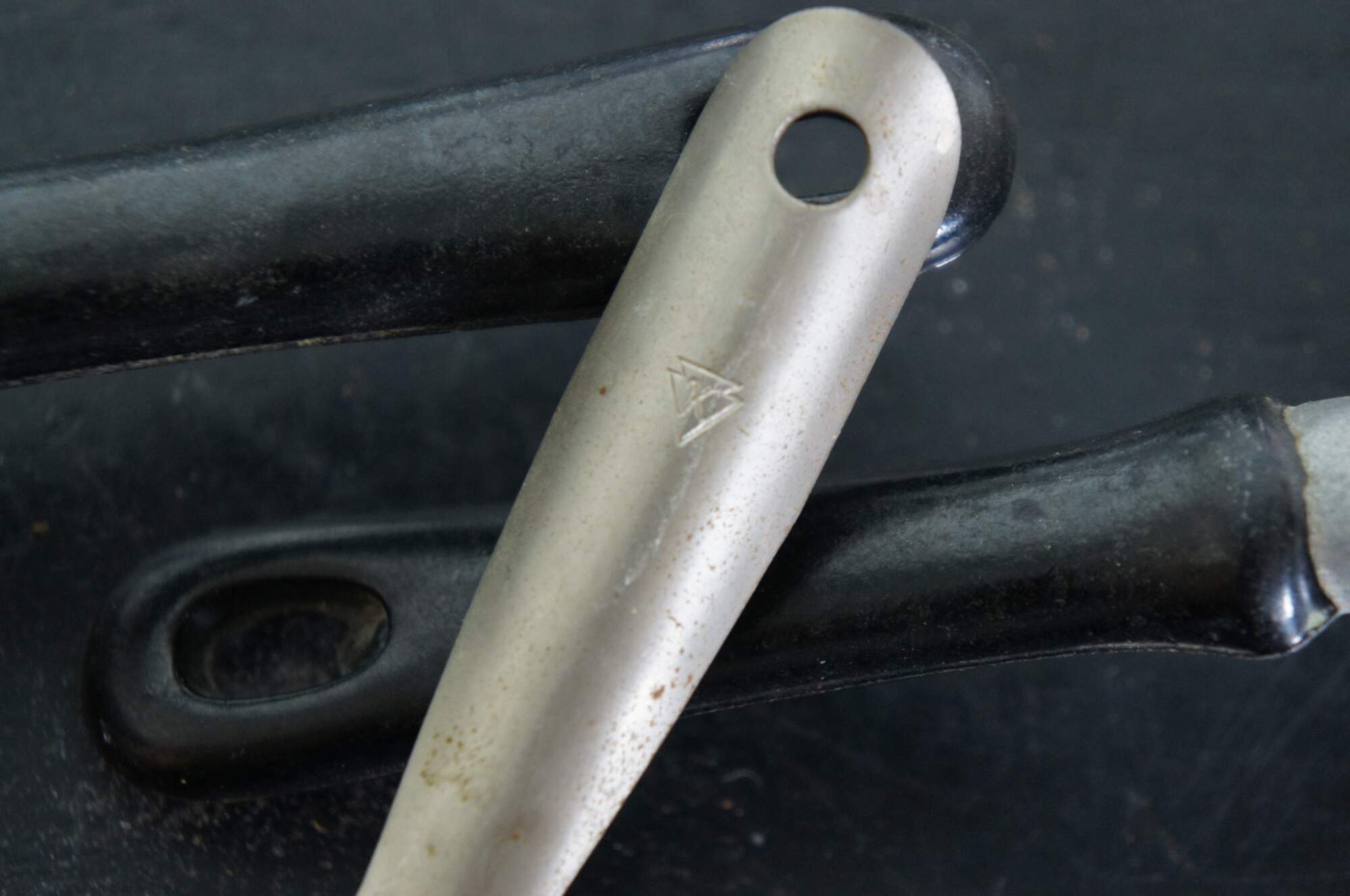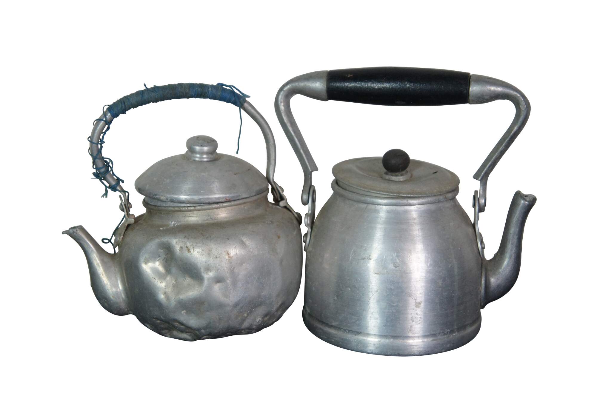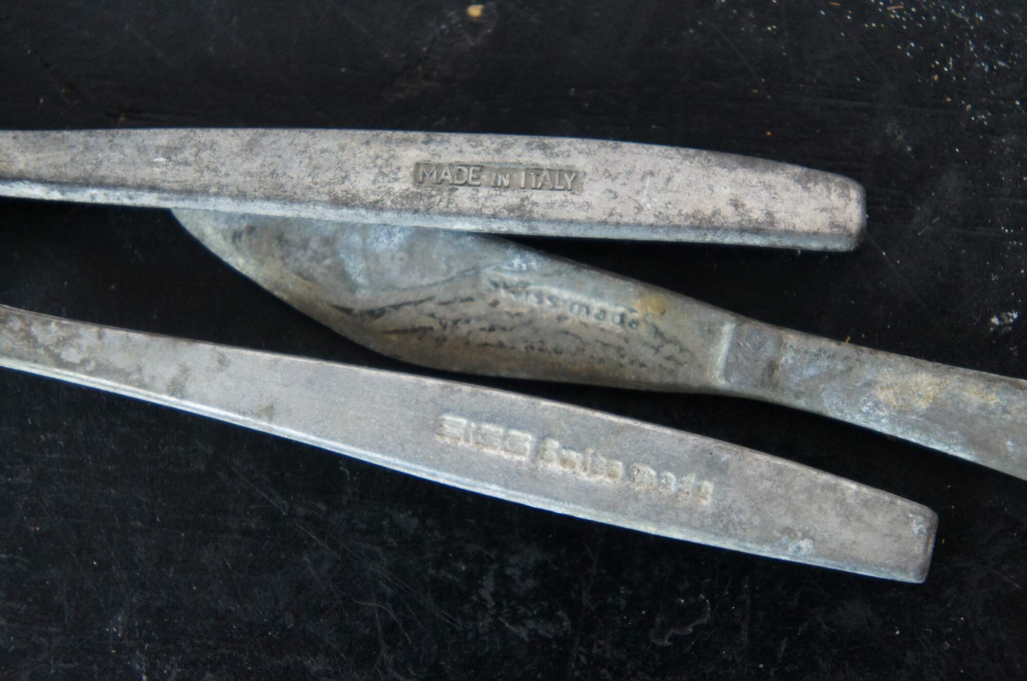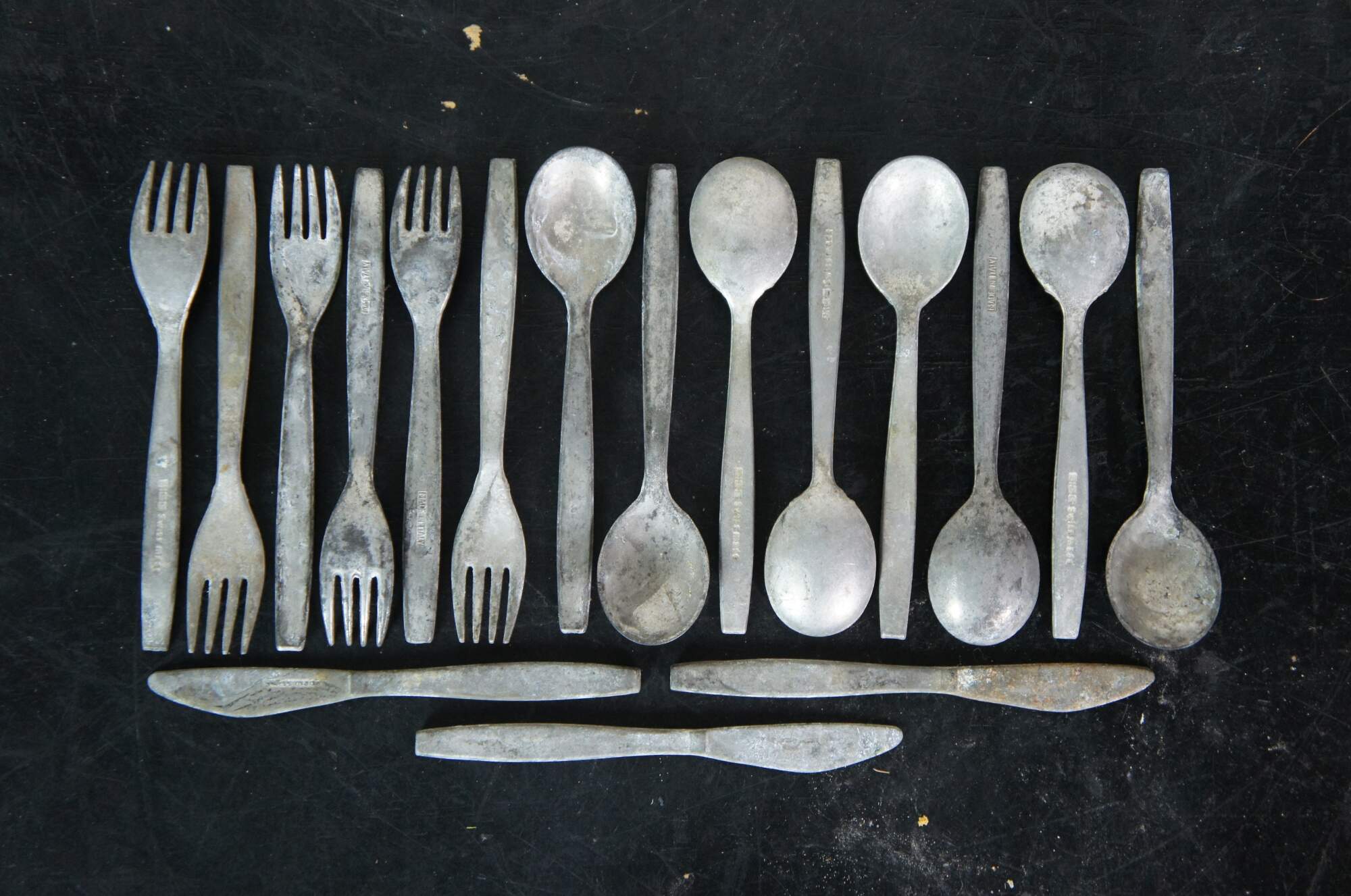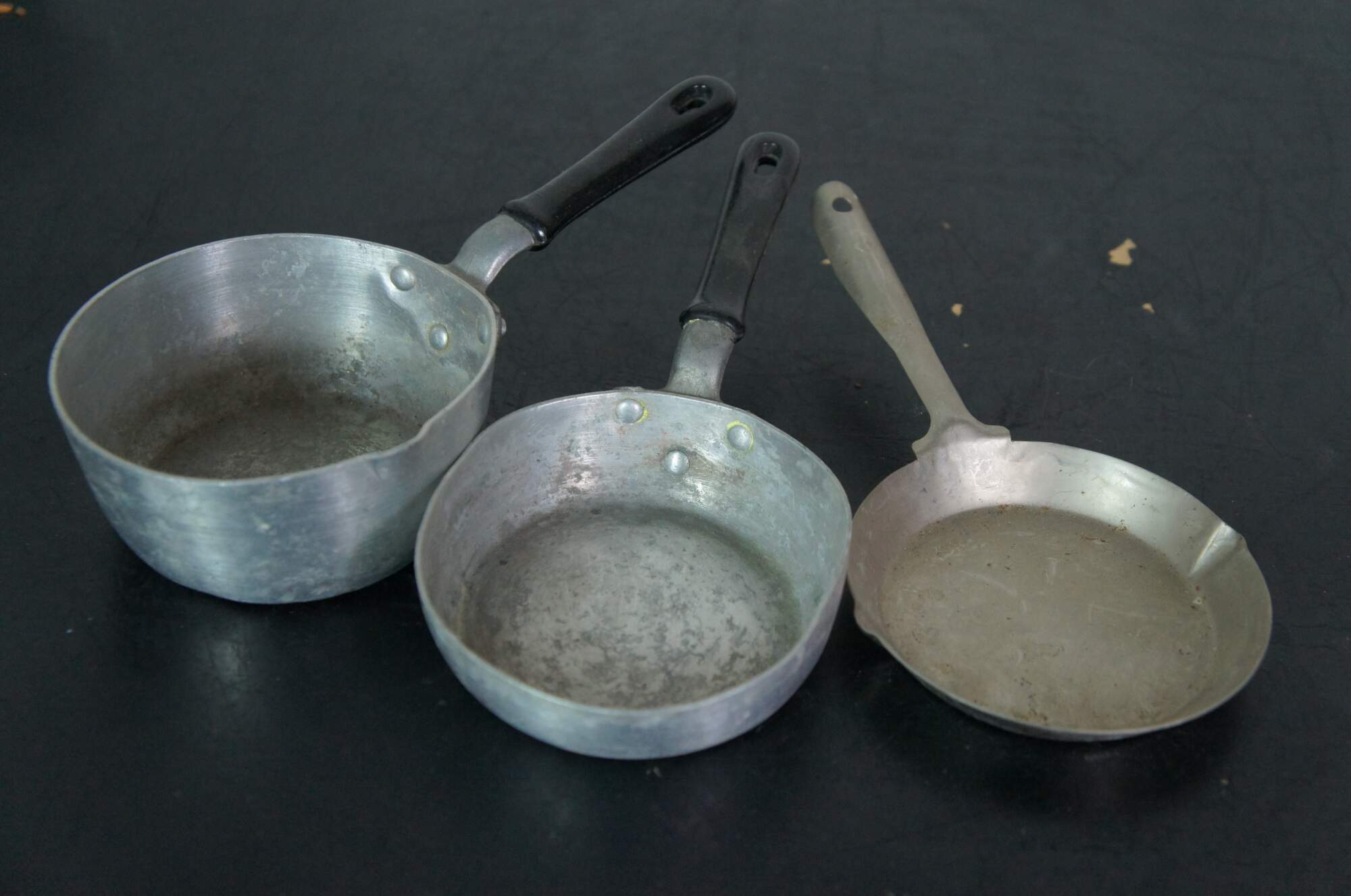 Mid 20th century 26 piece aluminum child's play set of cookware including two tea kettles, a lidded cauldron / cookie jar, sauce pan, 2 frying pans / skillets, 6 forks, 8 spoons, and 3 knives. Some by Sigg / Swiss Made, some by Crative Playthings / Made in Italy.