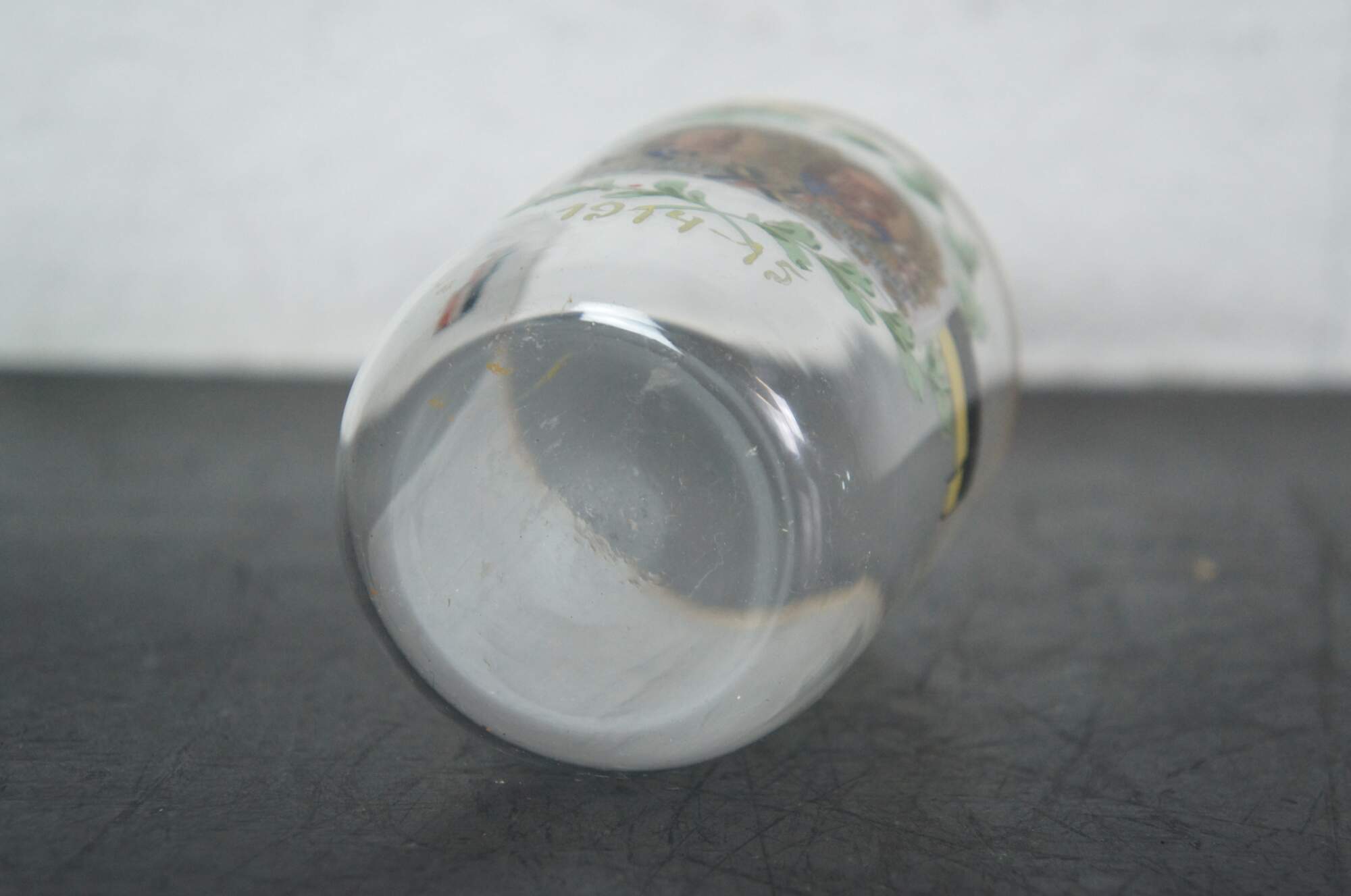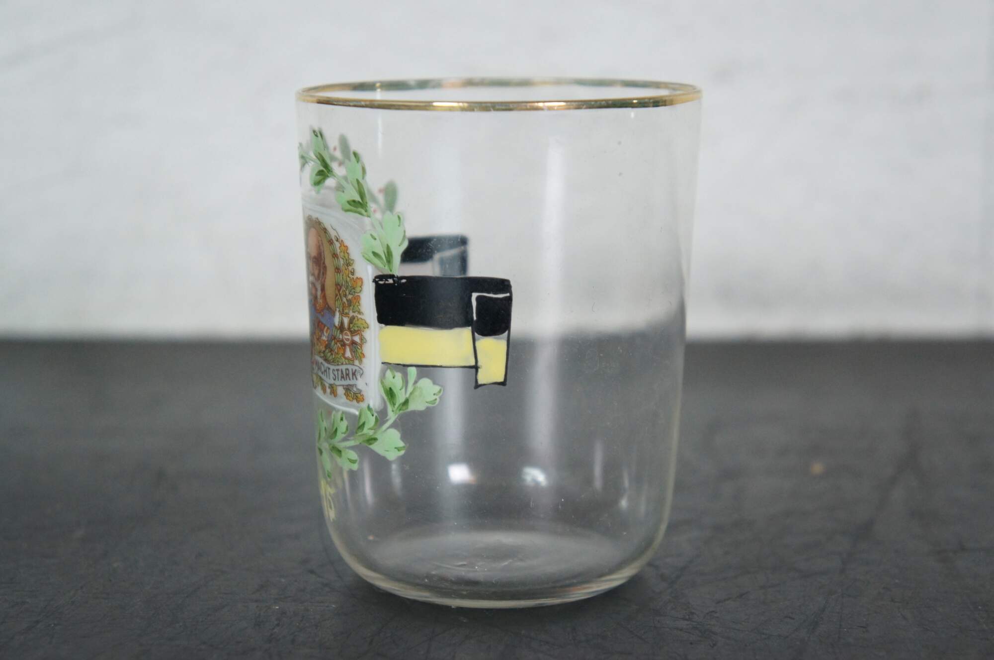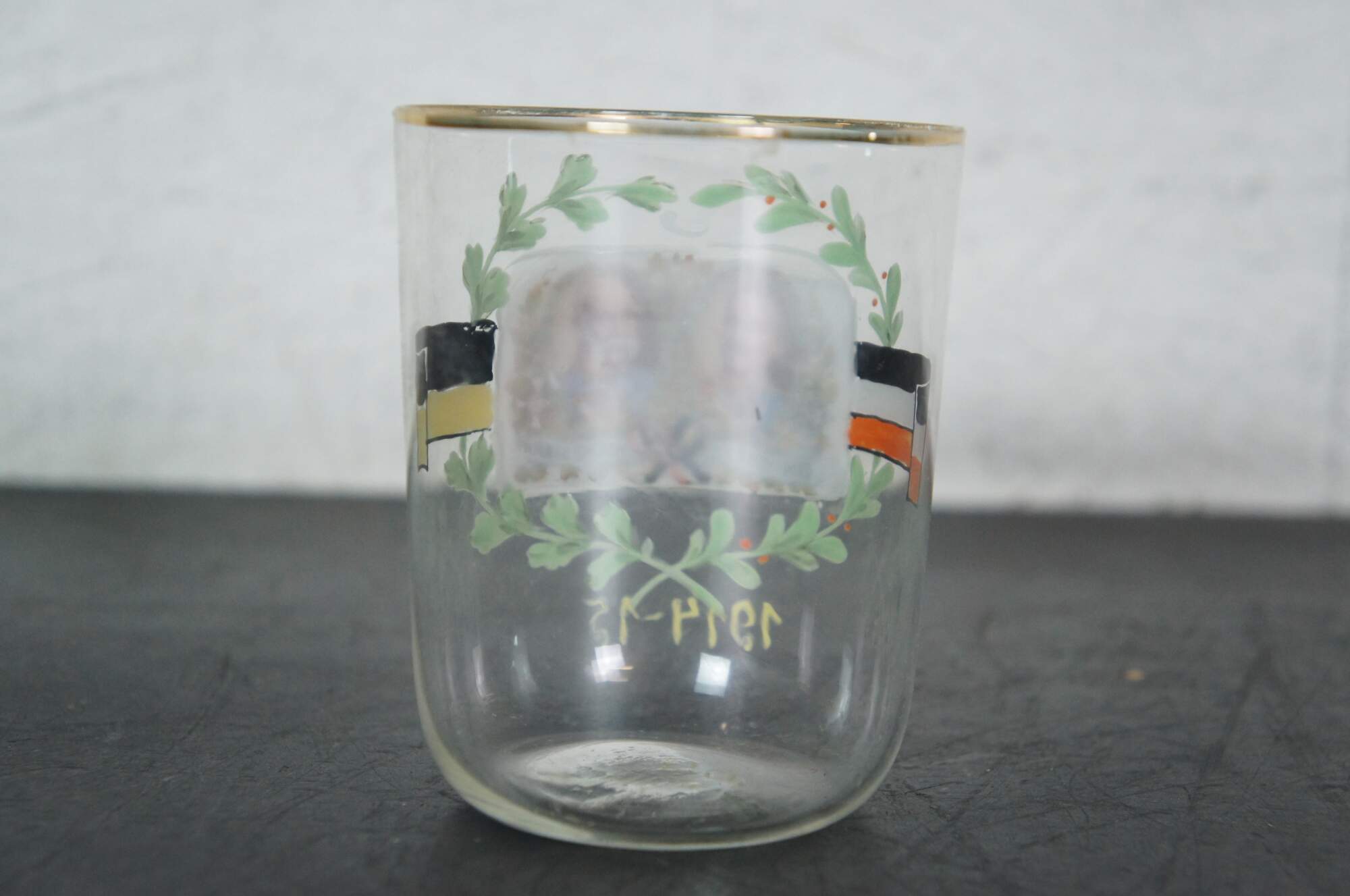Antique early 20th century patriotic commemorative glass cup and pin depicting the decades long alliance of Kaiser Wilhelm II of Germany and Emperor Franz Jospeh I of Autria-Hungary. The glass features a litho print depiction of the rulers and the motto "Eingkeit Macht Stark" (Unity makes strength), surrounded by a hand painted wreath, country flags and the date 1914-15. The brass pin features a pair of flags containing portraits of the rulers over a wreath and smal plaque reading "1870 Sedan 1910." "The Battle of Sedan, was a decisive defeat of the French army on September 1, 1870, during the Franco-German War, causing the surrender of Napoleon III and the fall of the Bonaparte dynasty and the Second French Empire." (Source: Brittanica)
