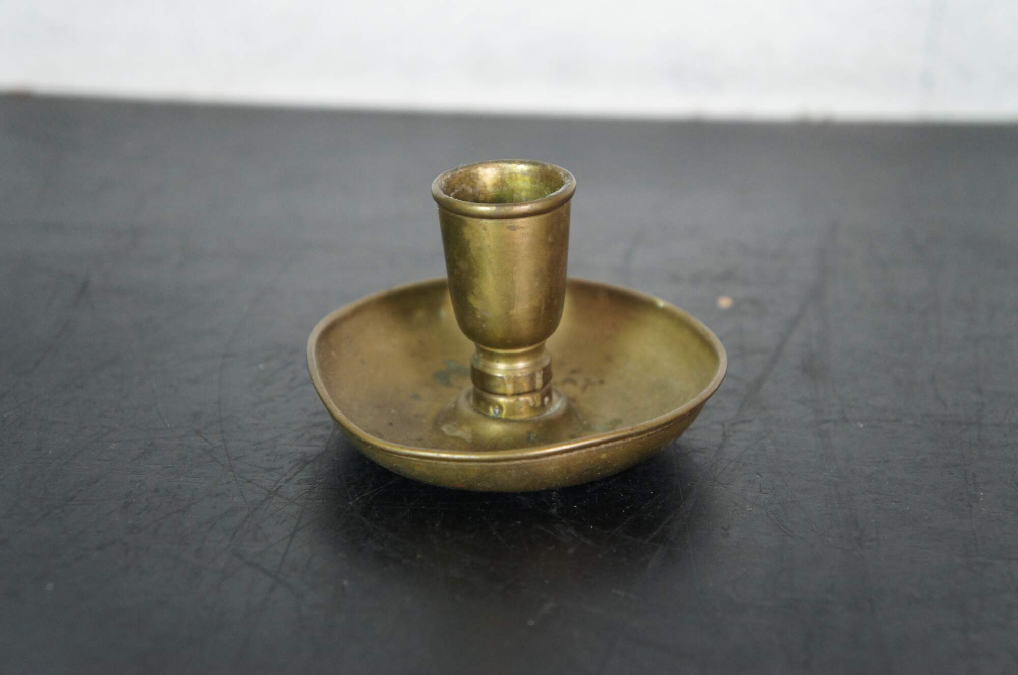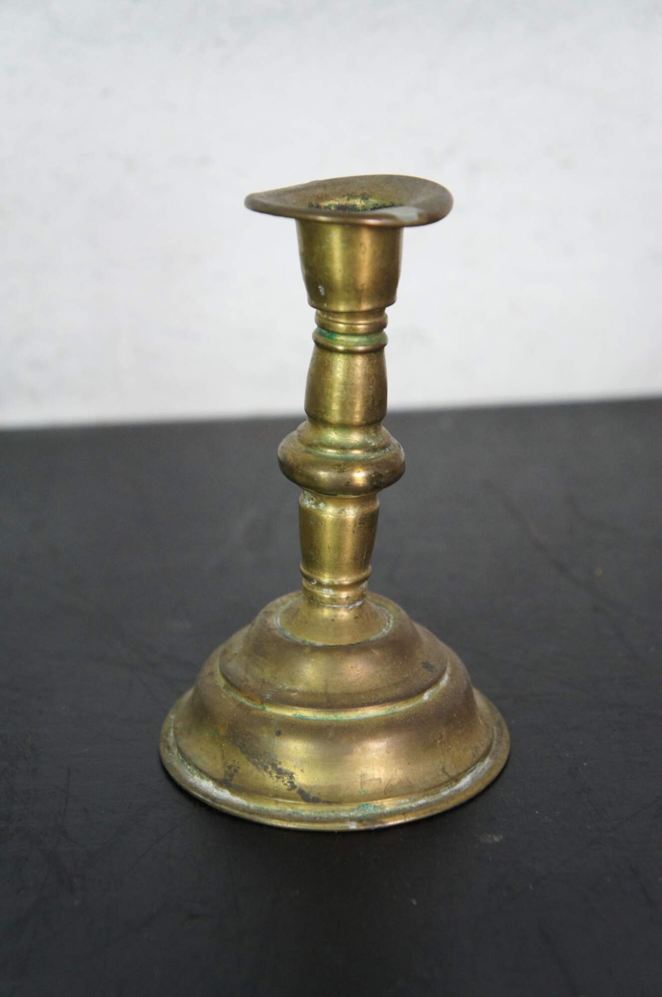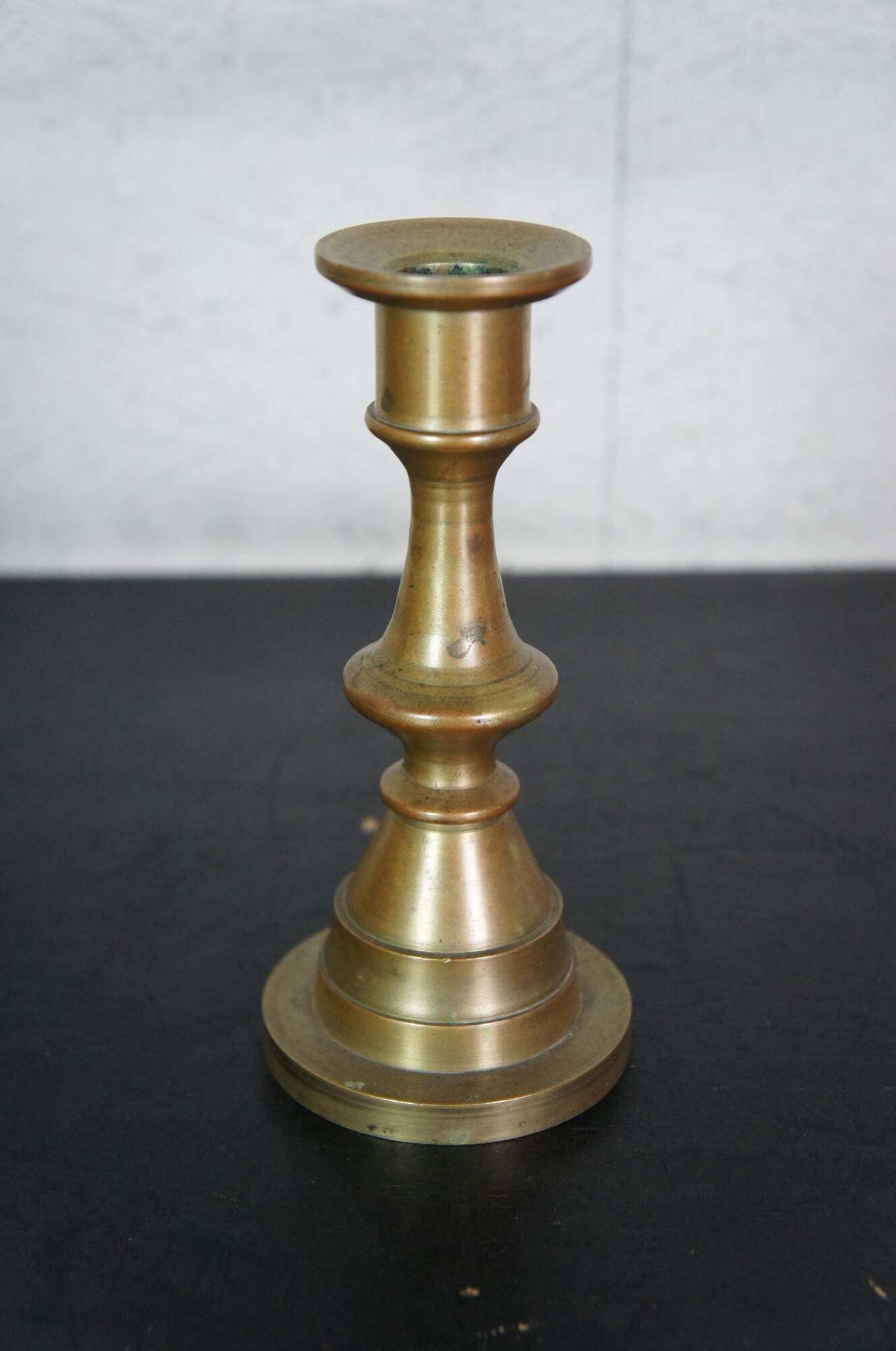 Lot of seven antique and vintage 20th century brass candlesticks in assorted styles. Including one Civil war / officer / campaign doughnut style traveling camp candlestick.