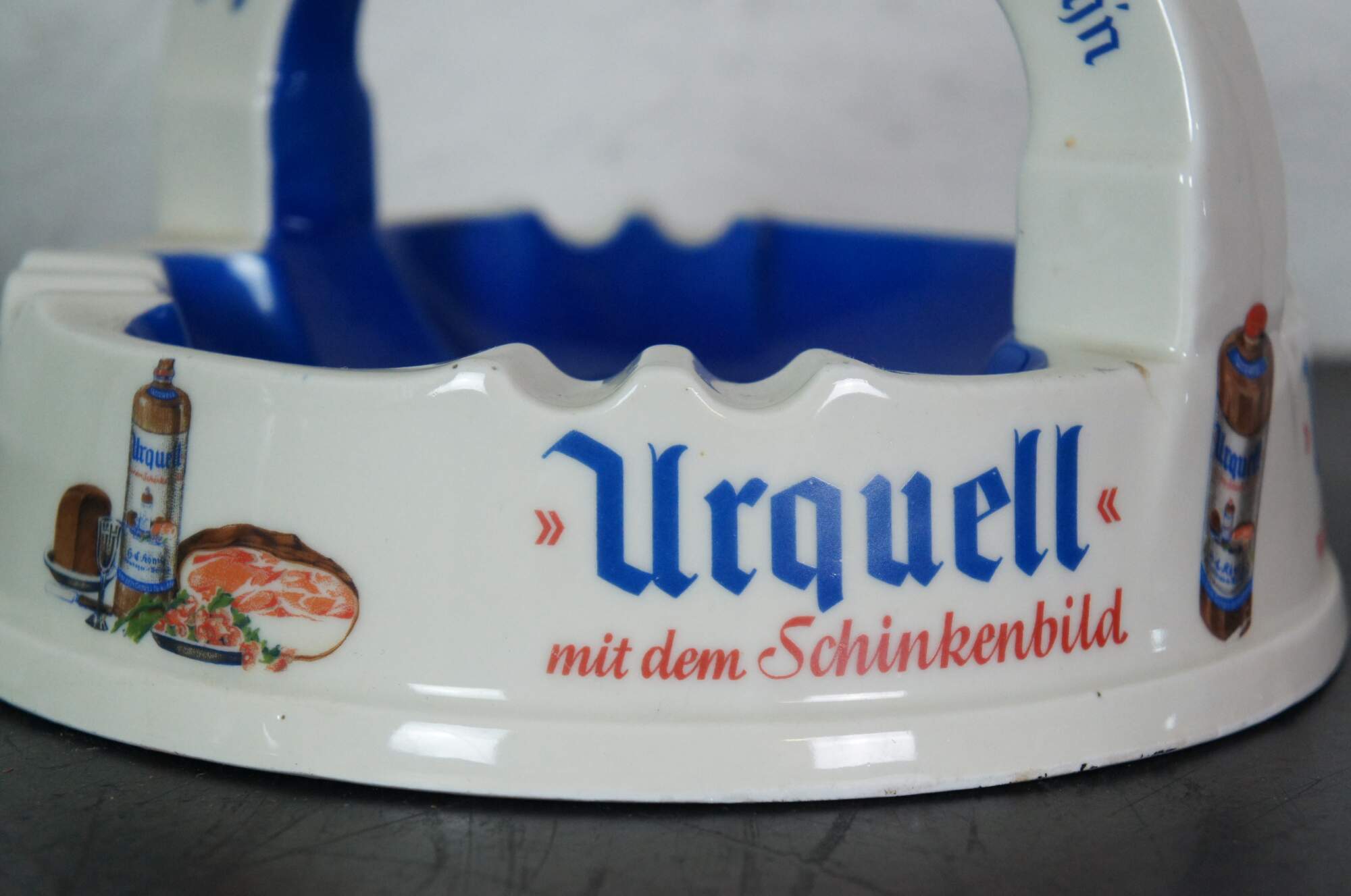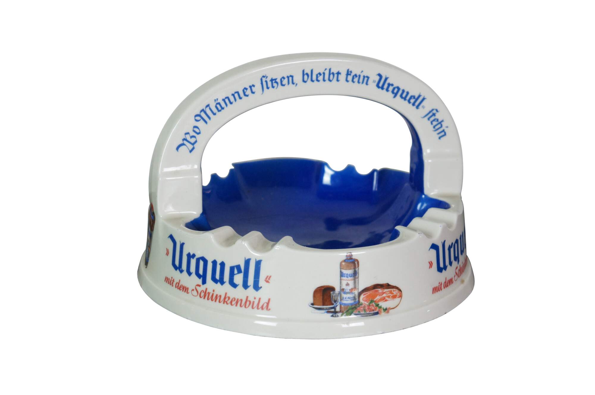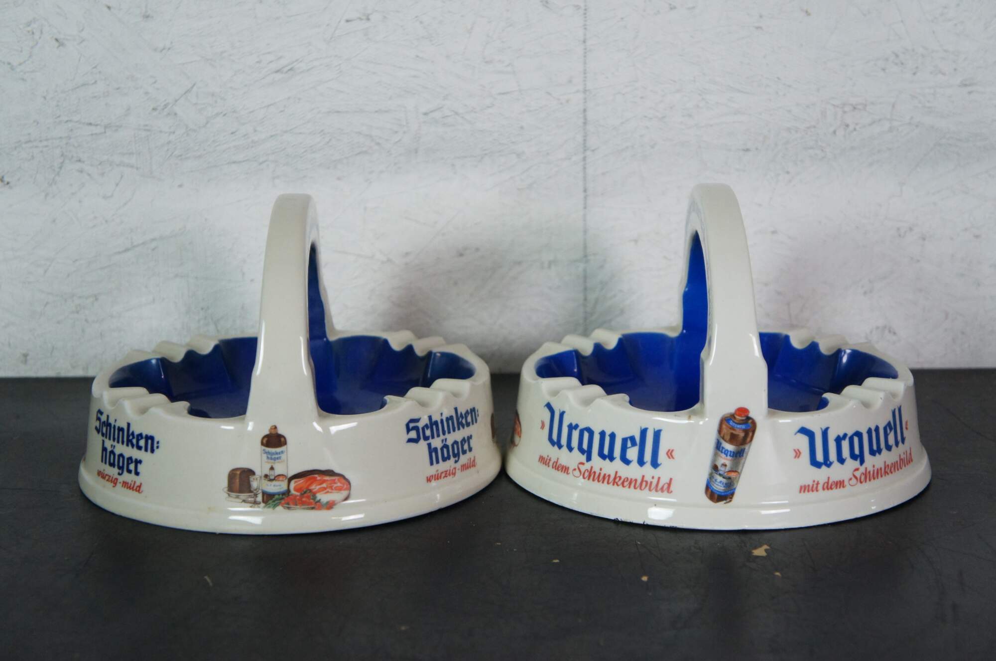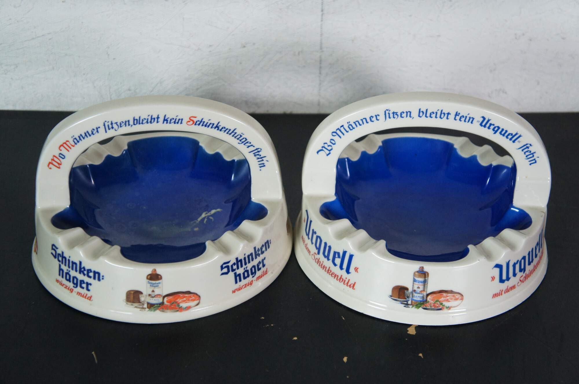 Pair of mid to late 20th century large porcelain German bar / restaurant ashtrays advertising Urquell and Schinken Hager beers. Made by Porzellanfabrik Altenkunstadt Karl Nehmzow.