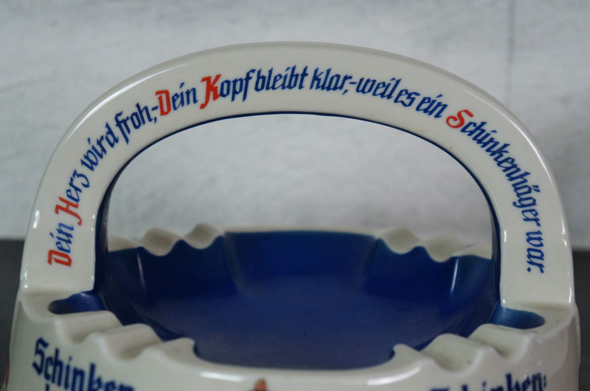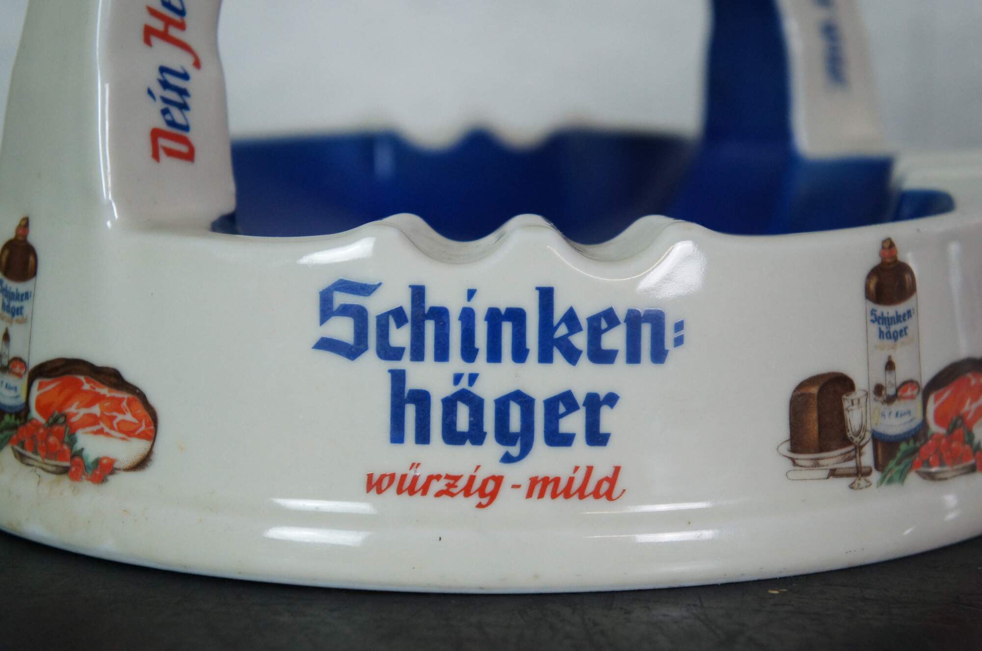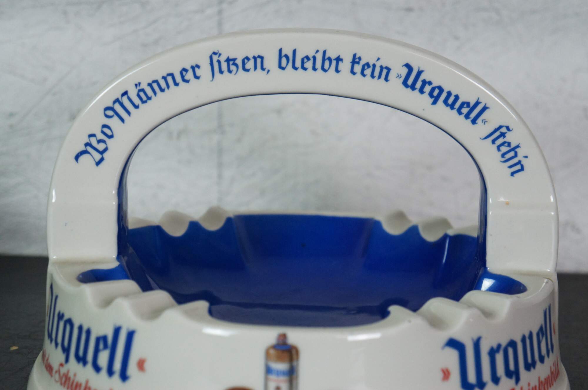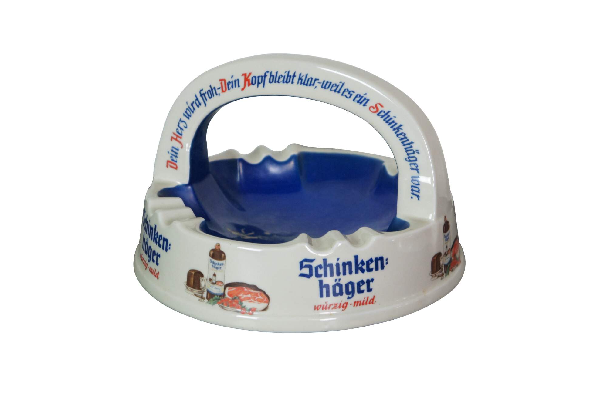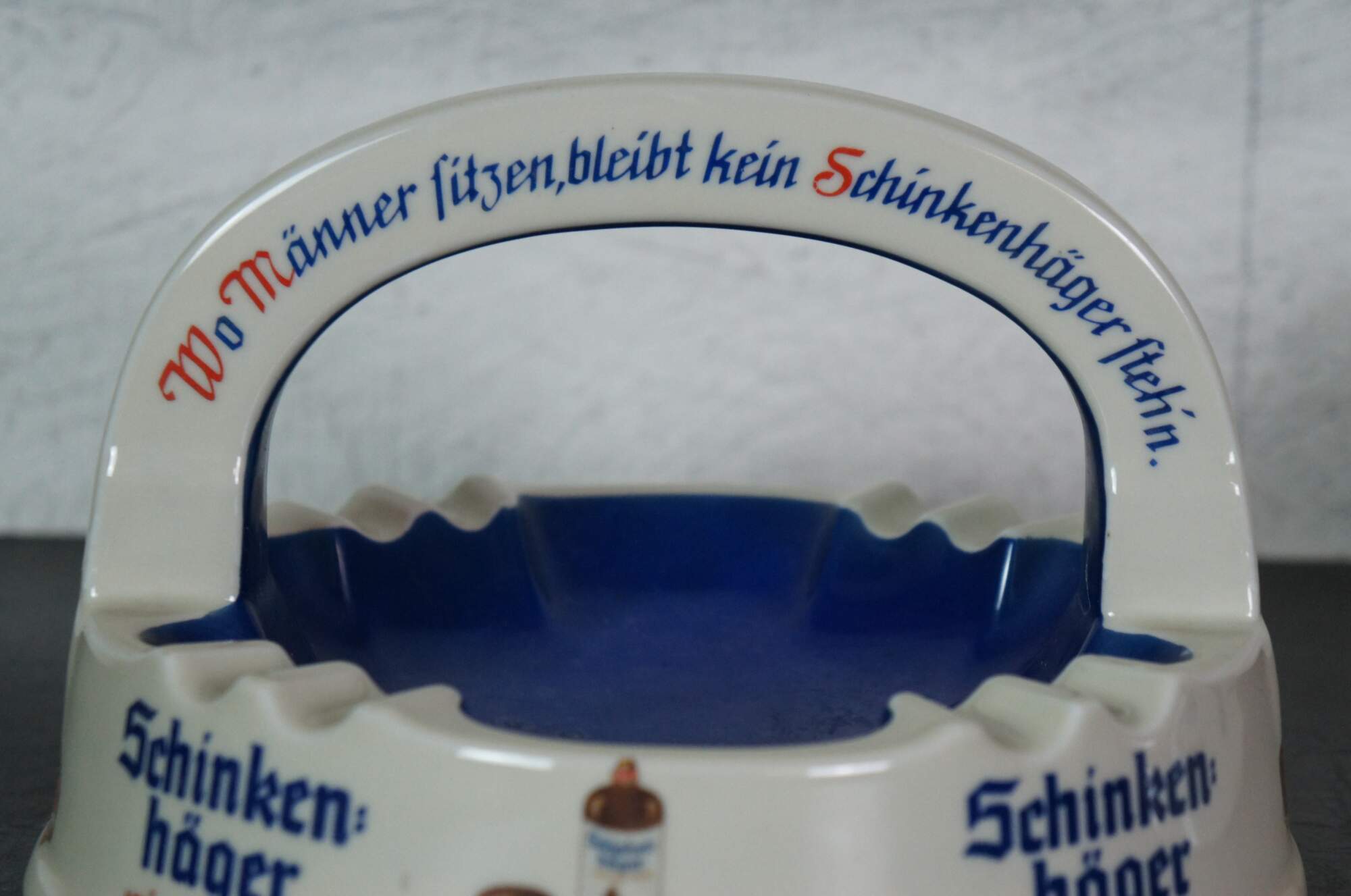 Pair of mid to late 20th century large porcelain German bar / restaurant ashtrays advertising Urquell and Schinken Hager beers. Made by Porzellanfabrik Altenkunstadt Karl Nehmzow.