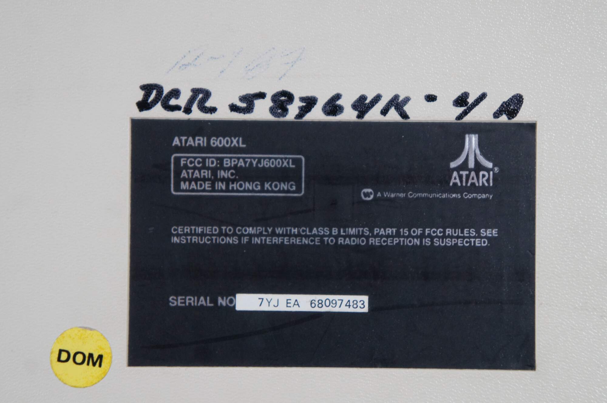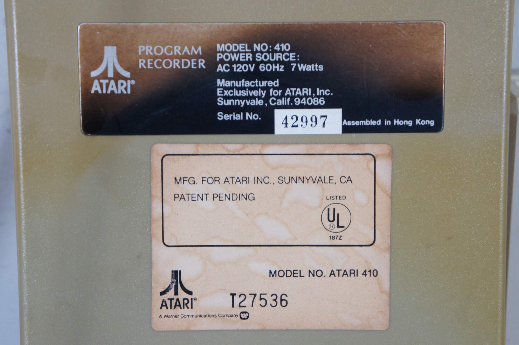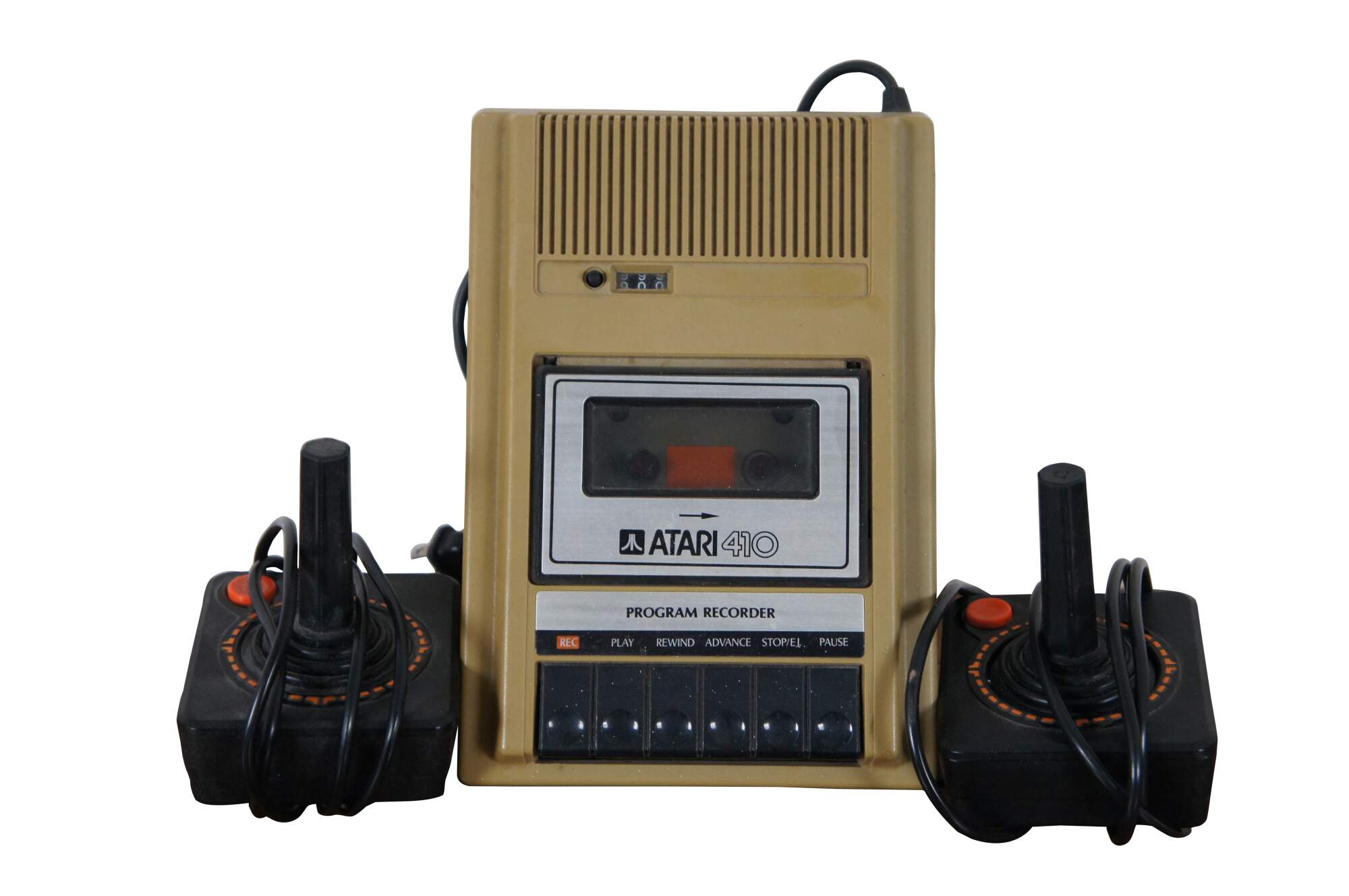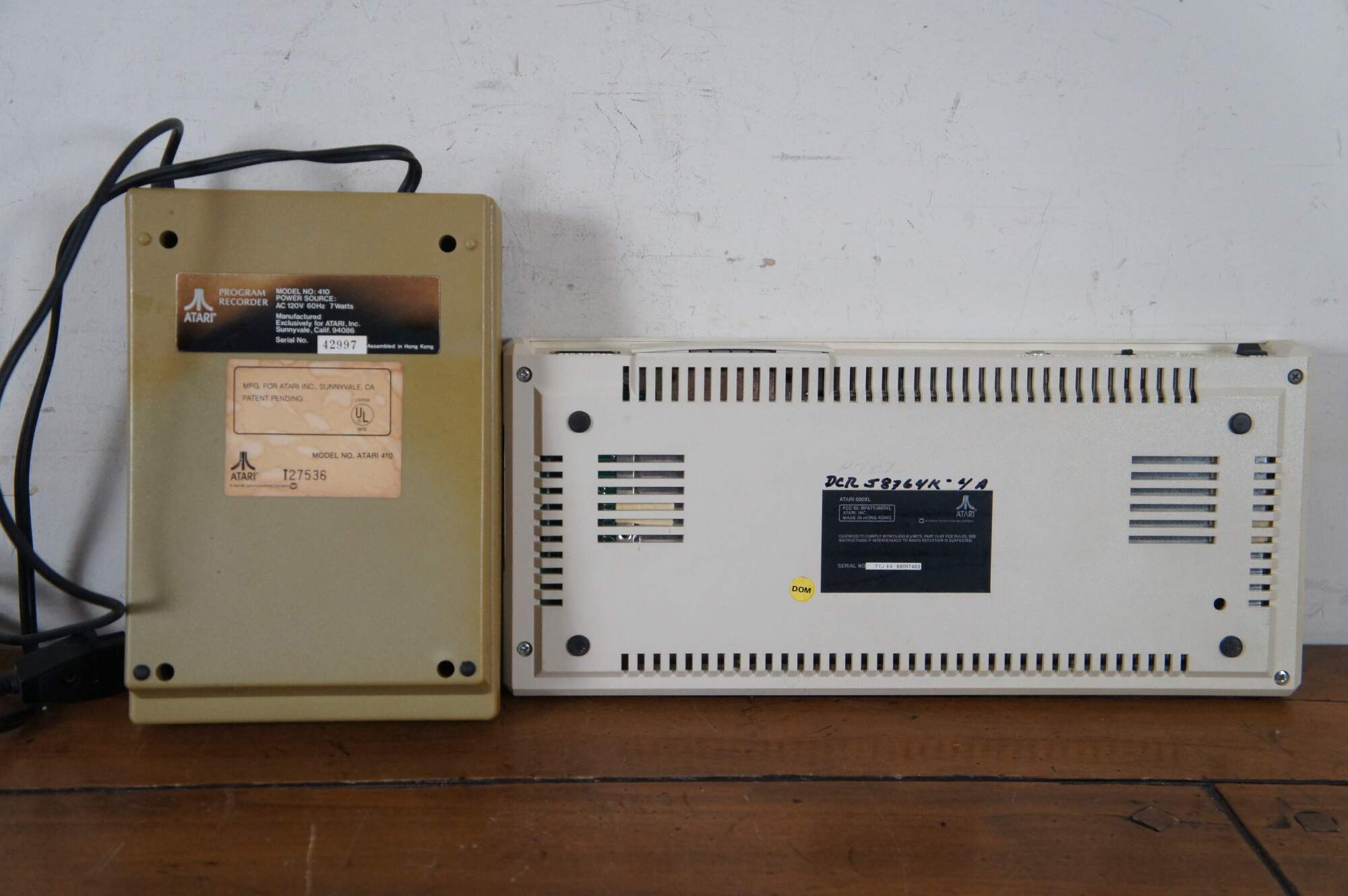 Atari 600XL personal computer, Serial Number 7YJ EA 68097483. Also included: Atari Model 410 Program Recorder, Serial Number 42997 (also marked T27536), 2 joystick controllers, and Part No. CO 61982 Power Supply.