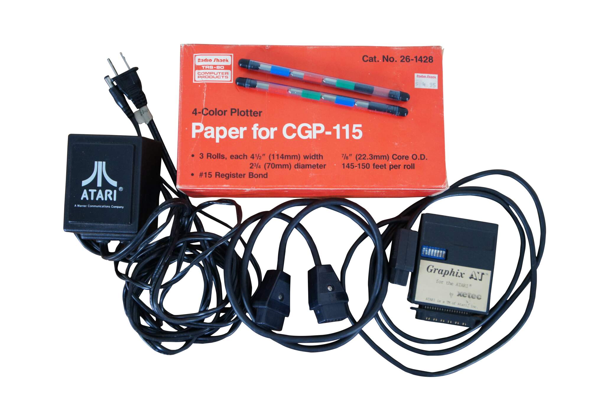 Atari 1020 color printer, Serial Number 9Z6FB38741333, circa 1983. Set also includes original box, Owner’s Guide, Part Number C017945 Power Supply, Xetec Graphix AT printer interface, Graphix AT Instruction Manual, peripheral cable, 2 four color printer pens, and 3 spare rolls of 4-Color Plotter Paper in box.