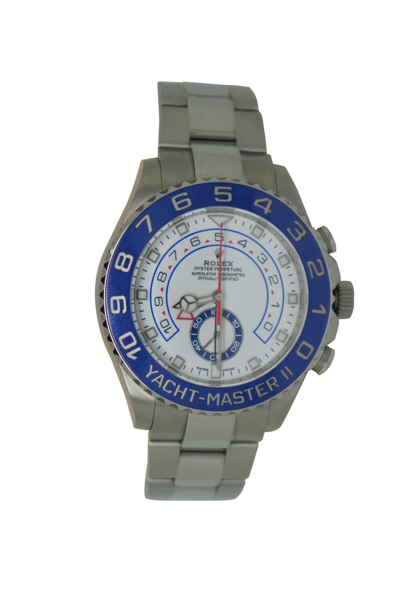 The Yacht-Master II comes with a nautical function that is a programmable countdown that works in tandem with mechanical memory and on-the-fly synchronization. The stainless steel 44 mm case is assembled with a screw-down case back and a winding crown. This timepiece is powered by the self-winding 4161 calibre which has a programmable countdown and a 72-hour power reserve. Comes with Box, Papers and watch card