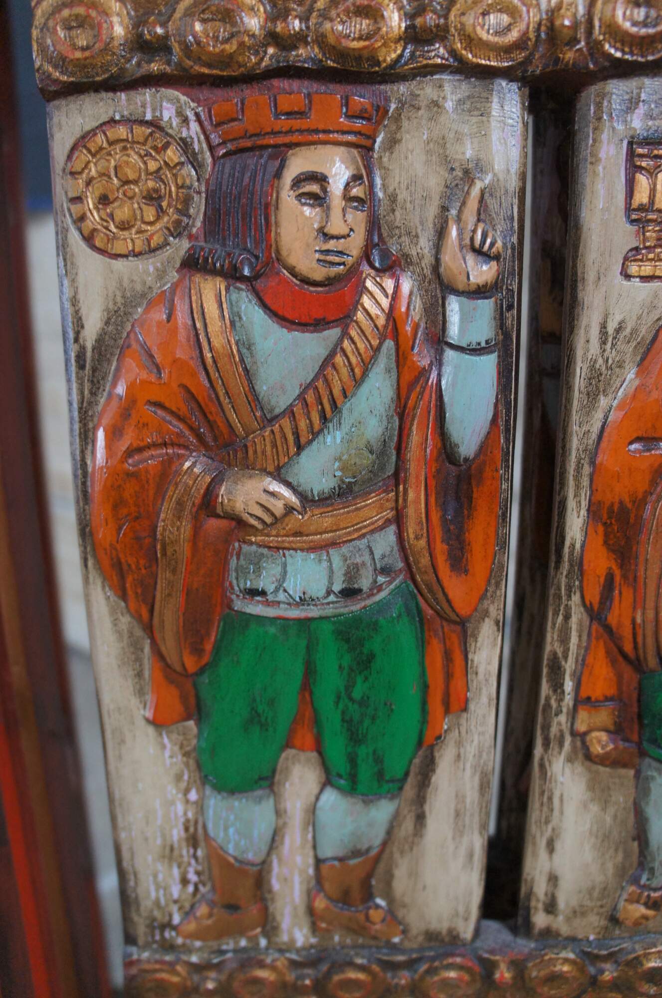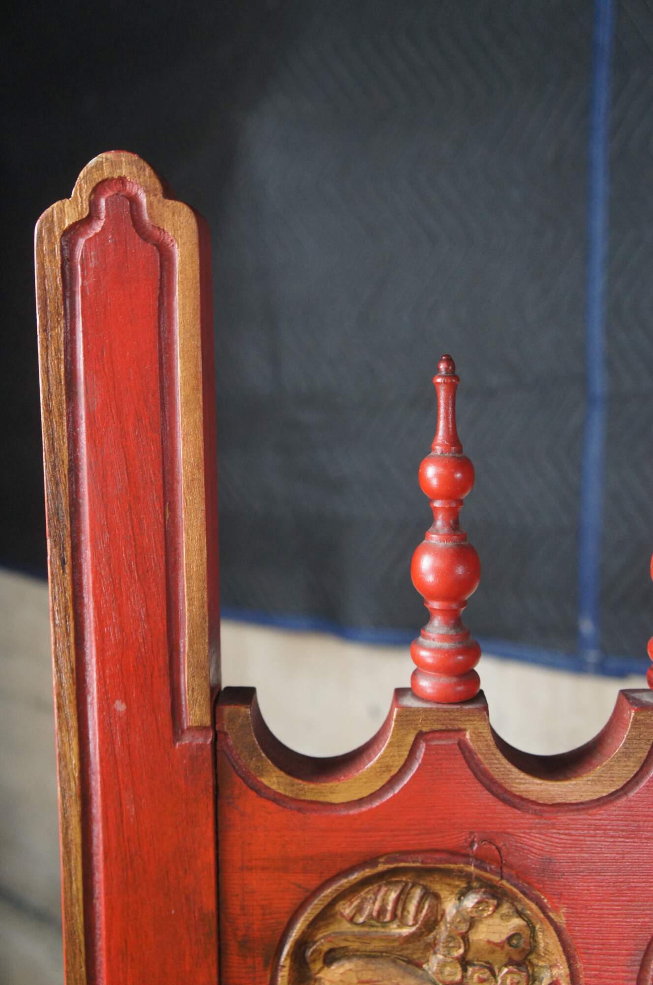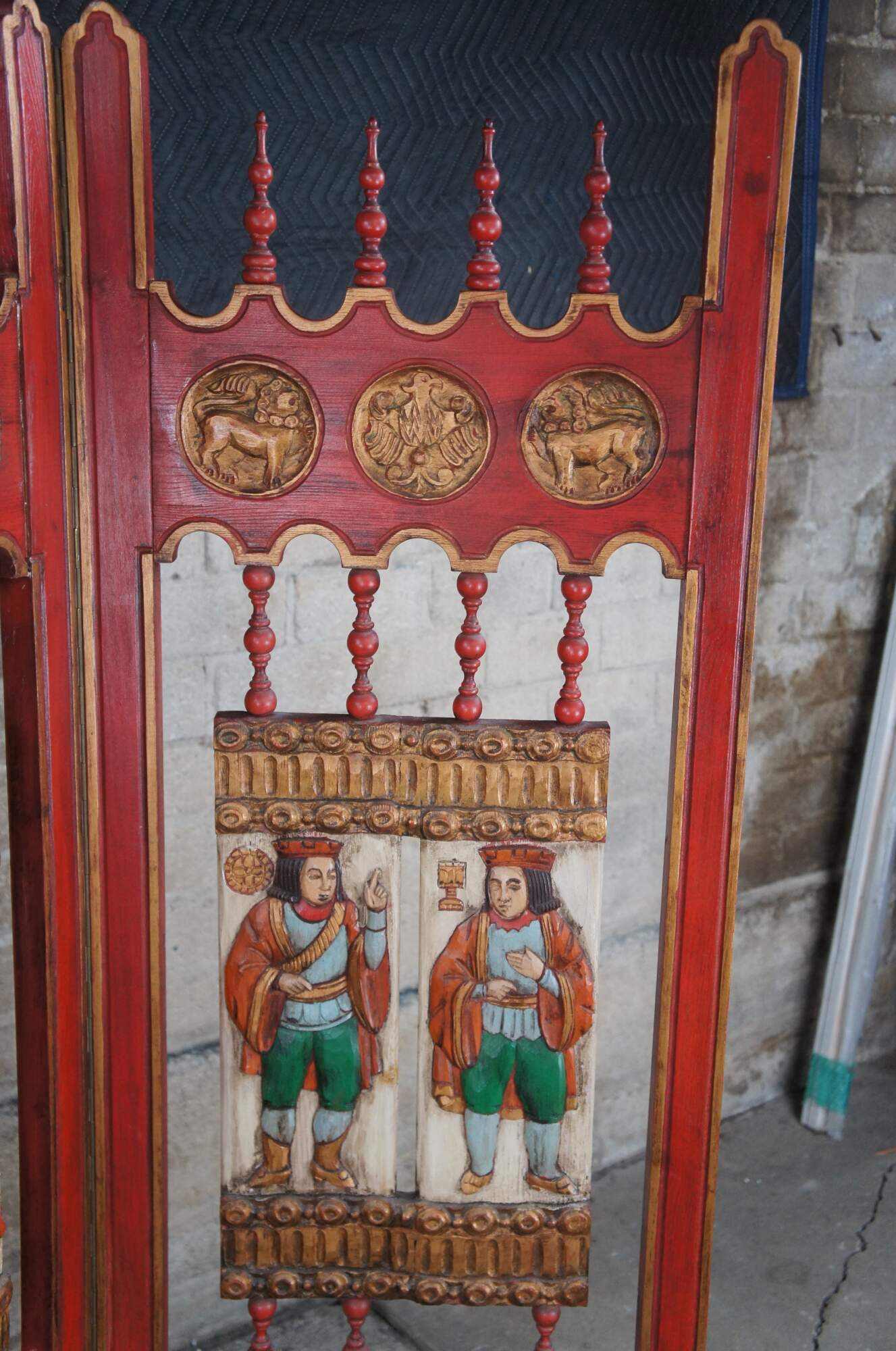 Vintage gothic / medieval four panel room divider screen. Made of red painted oak featuring reticulated turned spindle design with figural kings and noblemen plaques at the center, flanked by gold eagle and lion medallions.