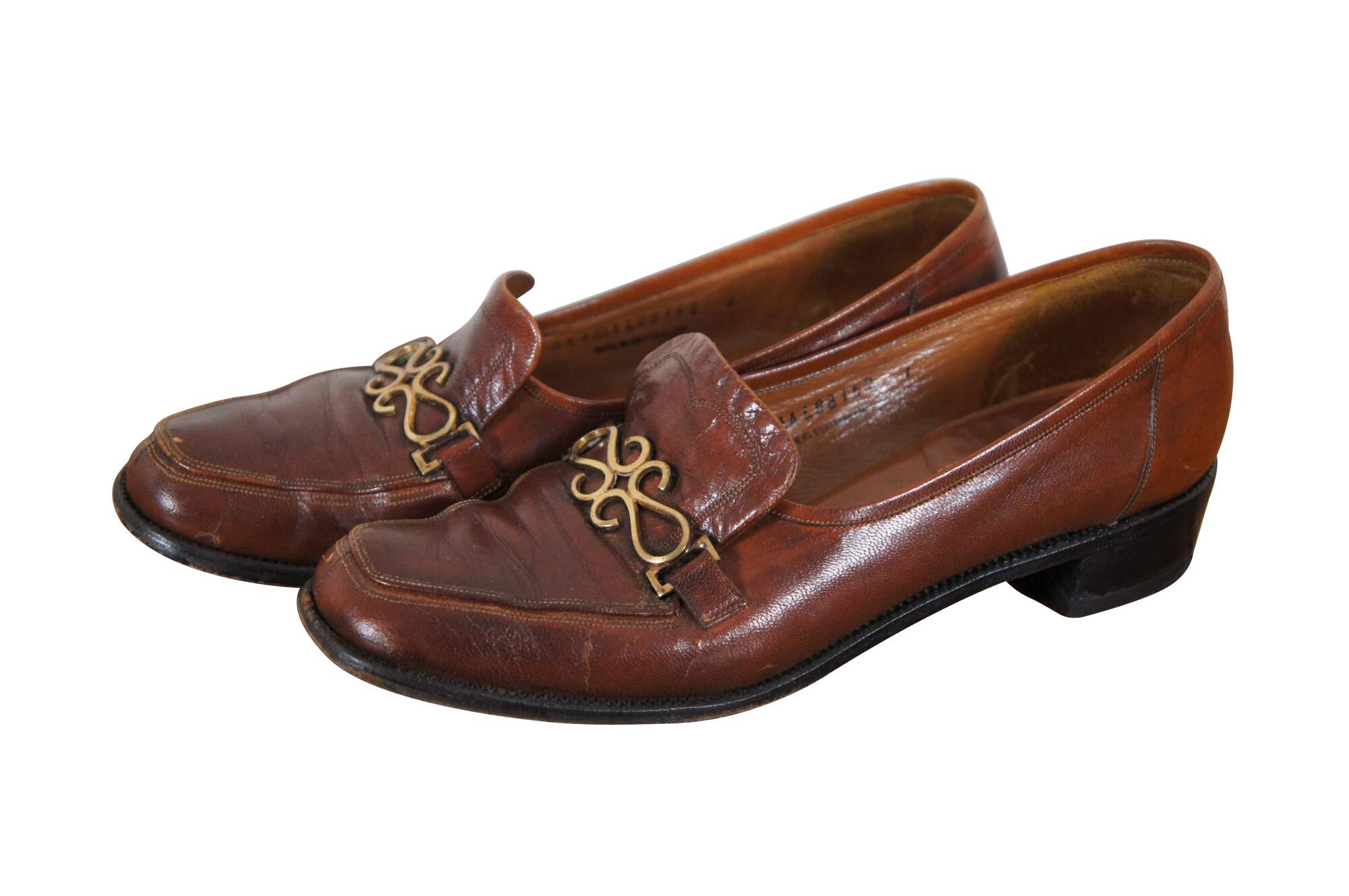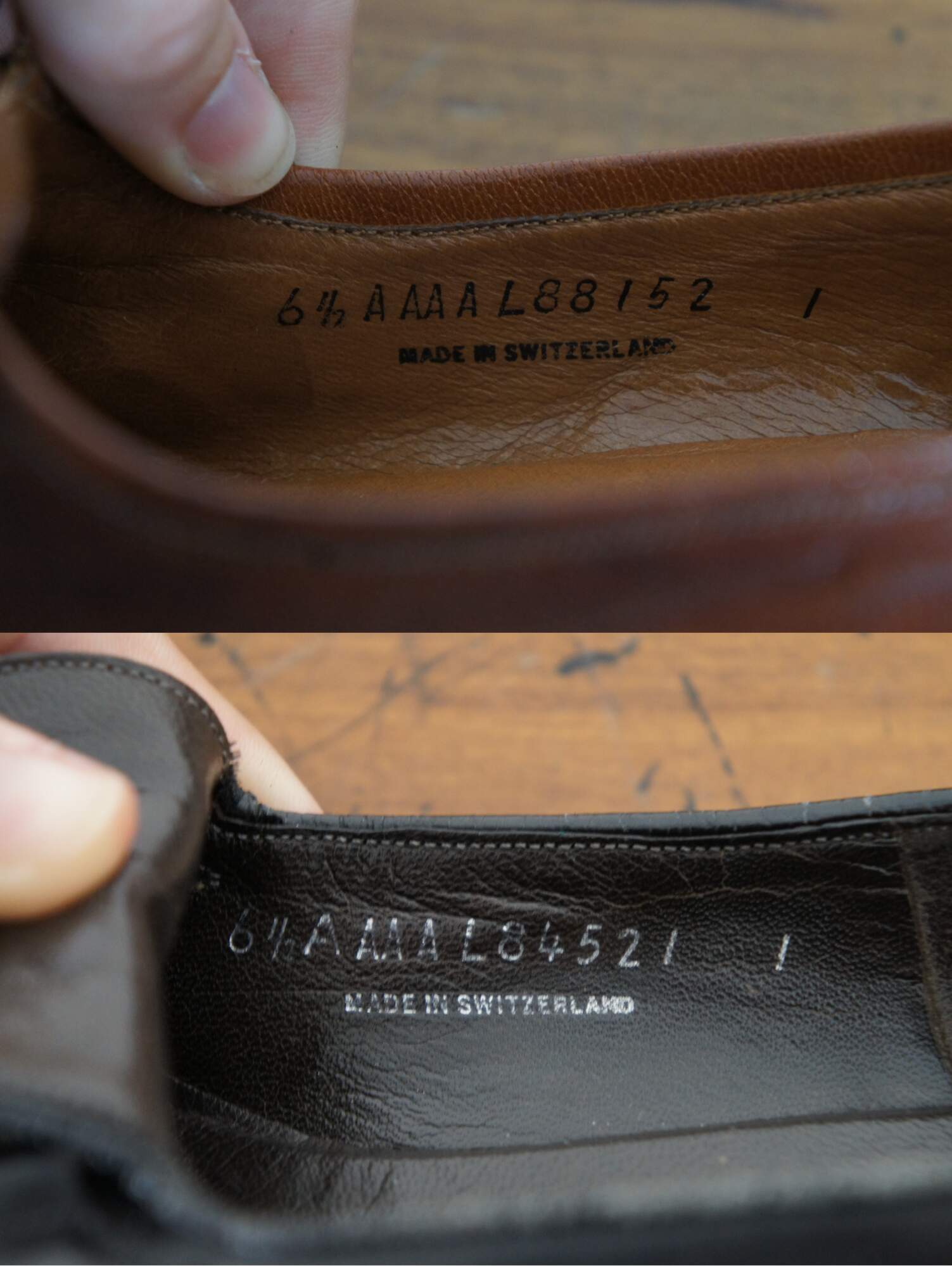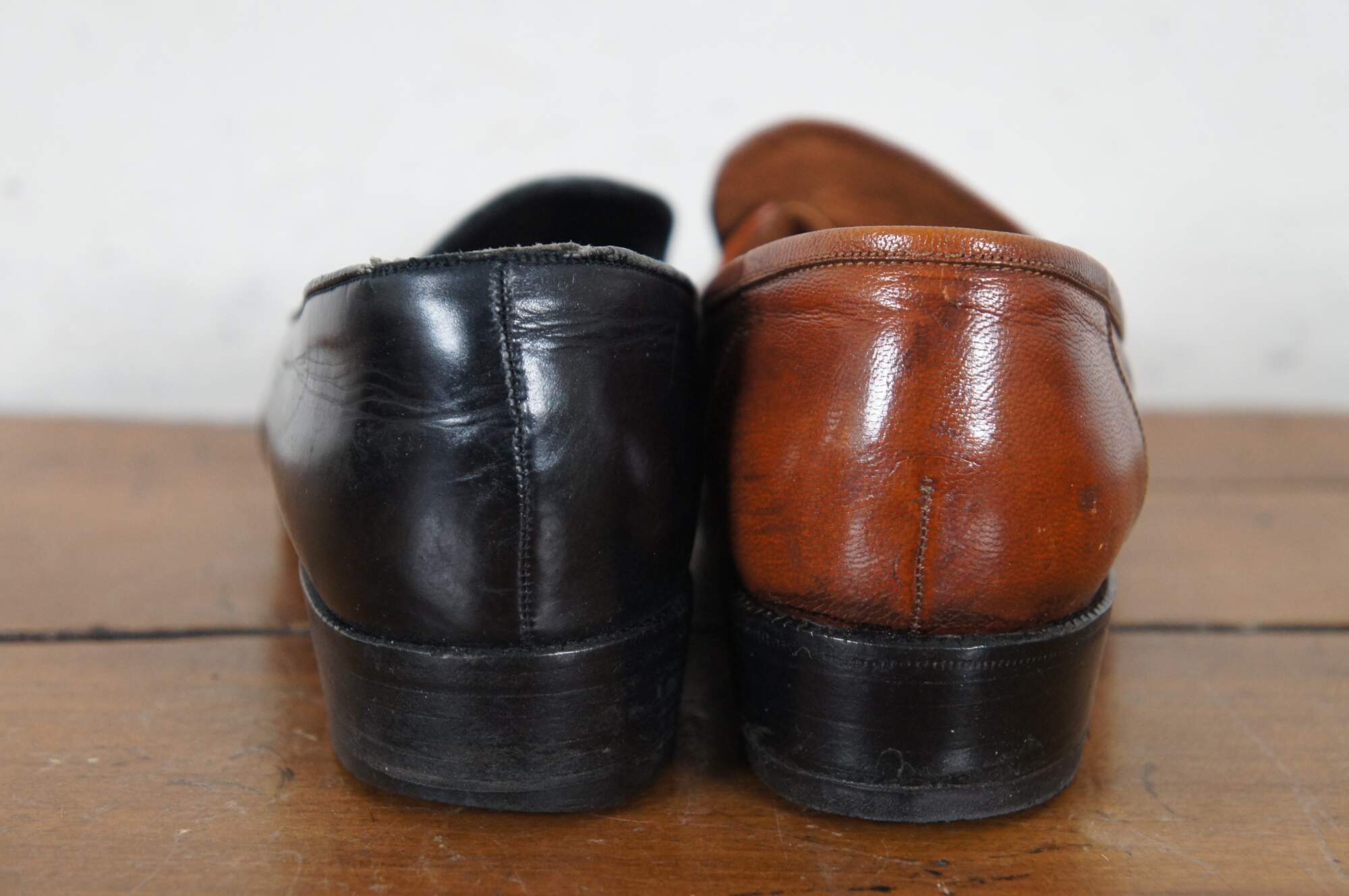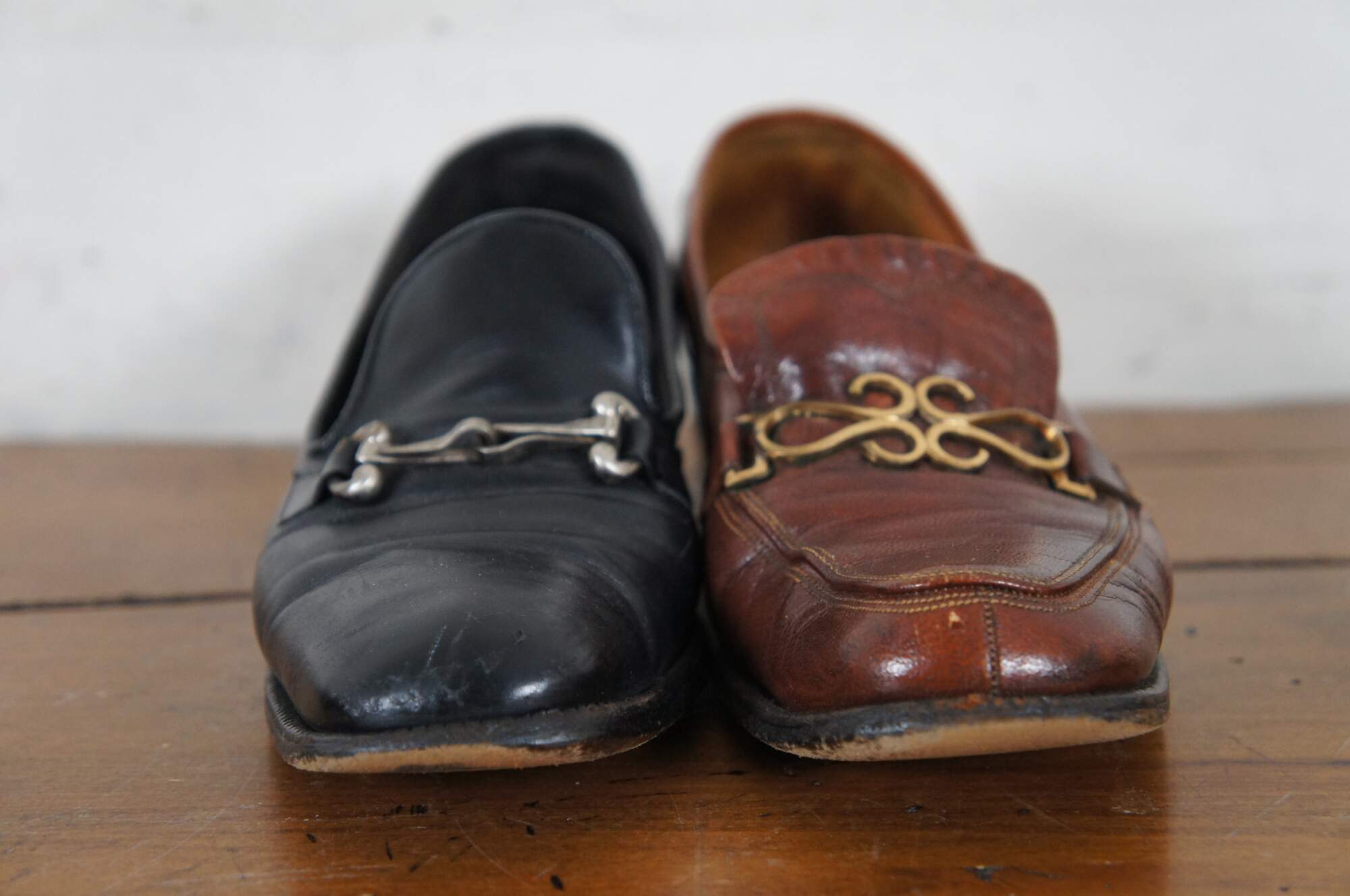 Two pairs of Fenton Last Saks Fifth Avenue loafers in black and brown leather with buckle accents. Made in Switzerland.
