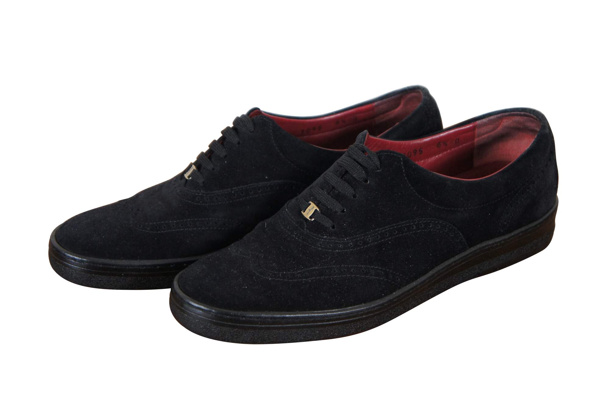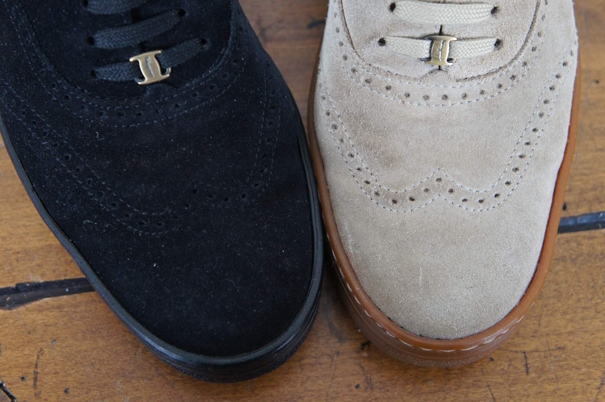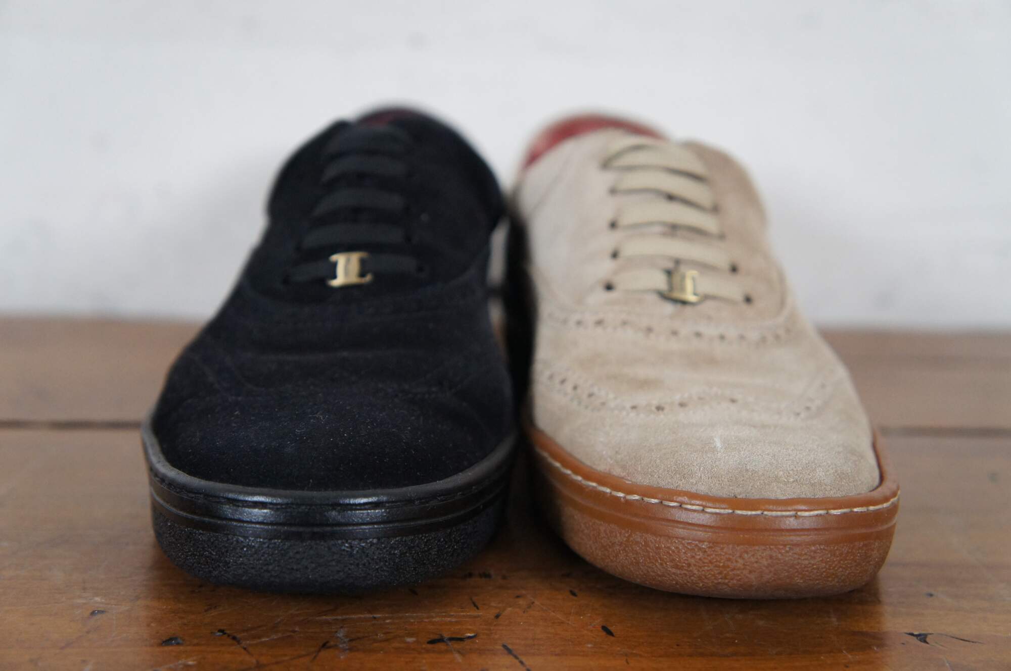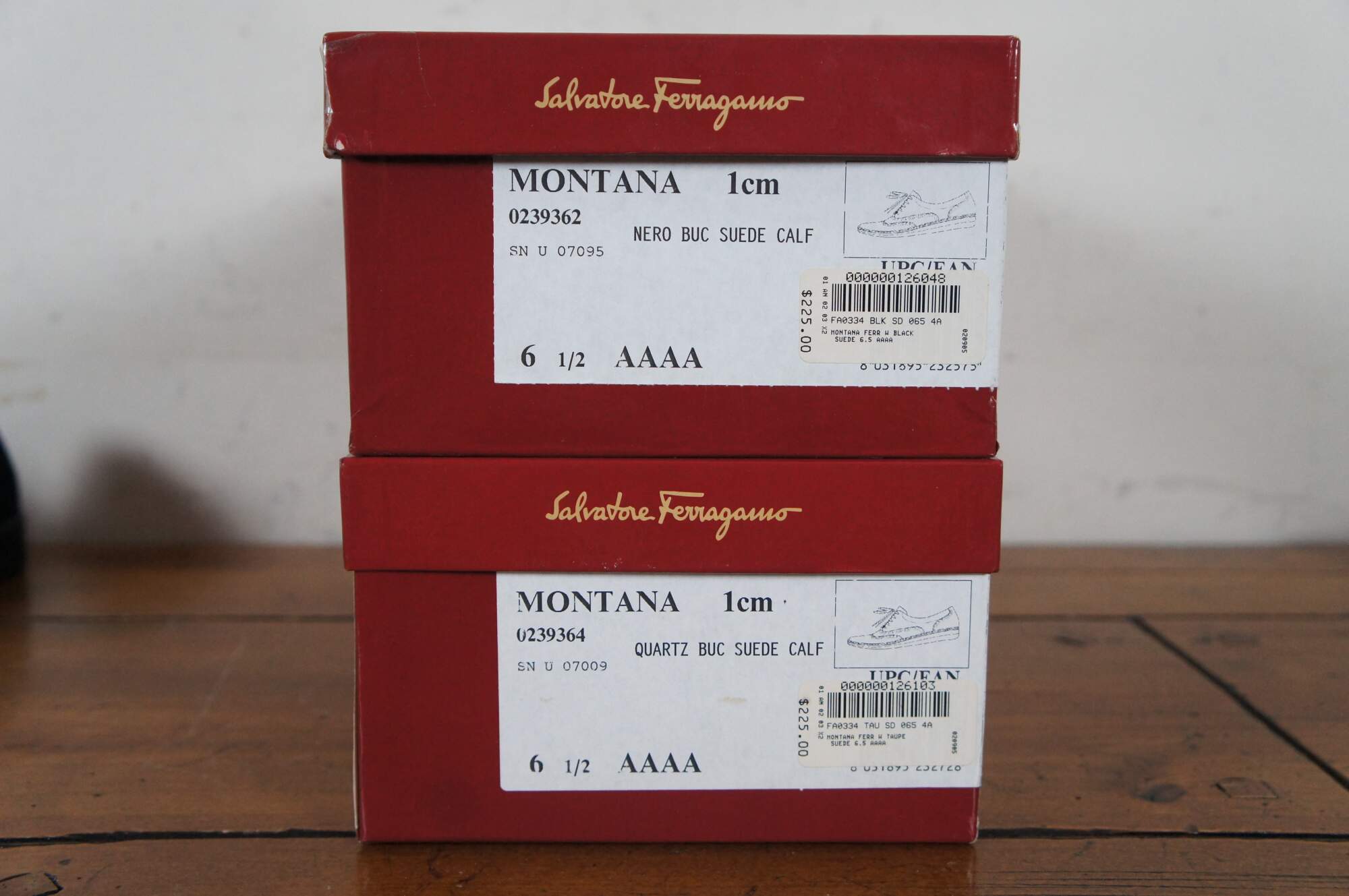 Two vintage pairs of Salvatore Ferragamo Montana tennis shoes in brouge design with suede buc calf leather. In black nero and taupe quartz / tan. Size 6.5 AAAA. Made in Italy. MSRP $225 each. Wingtip, Oxford.