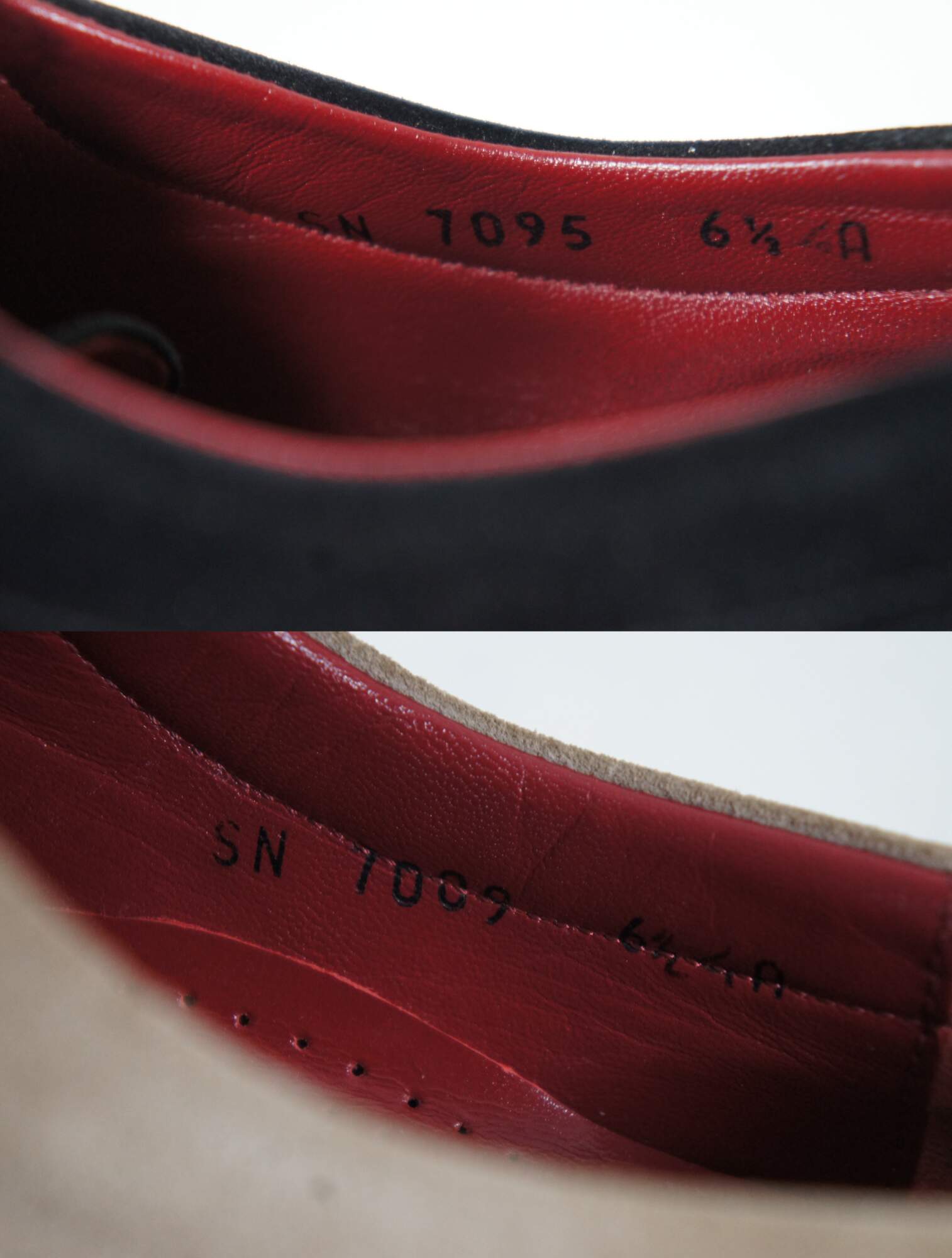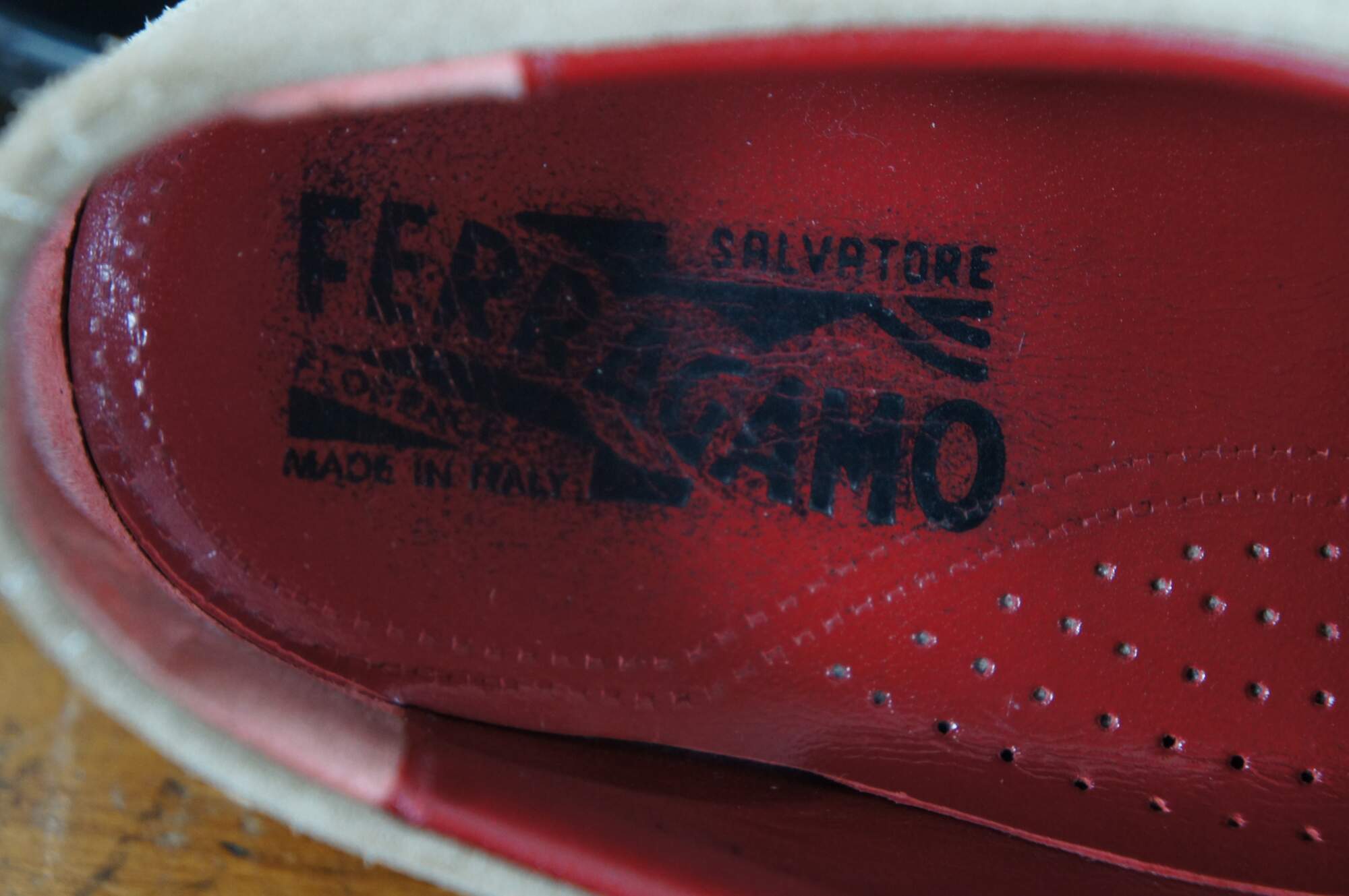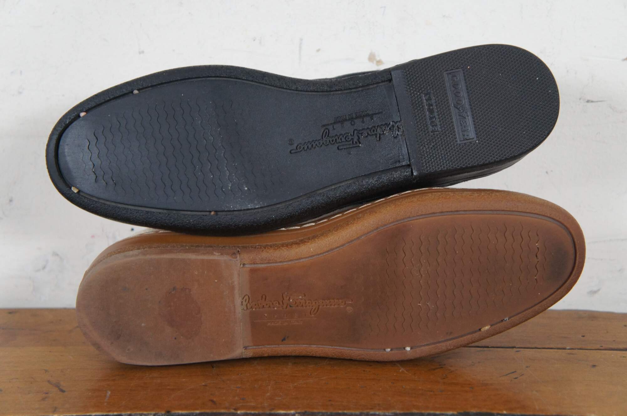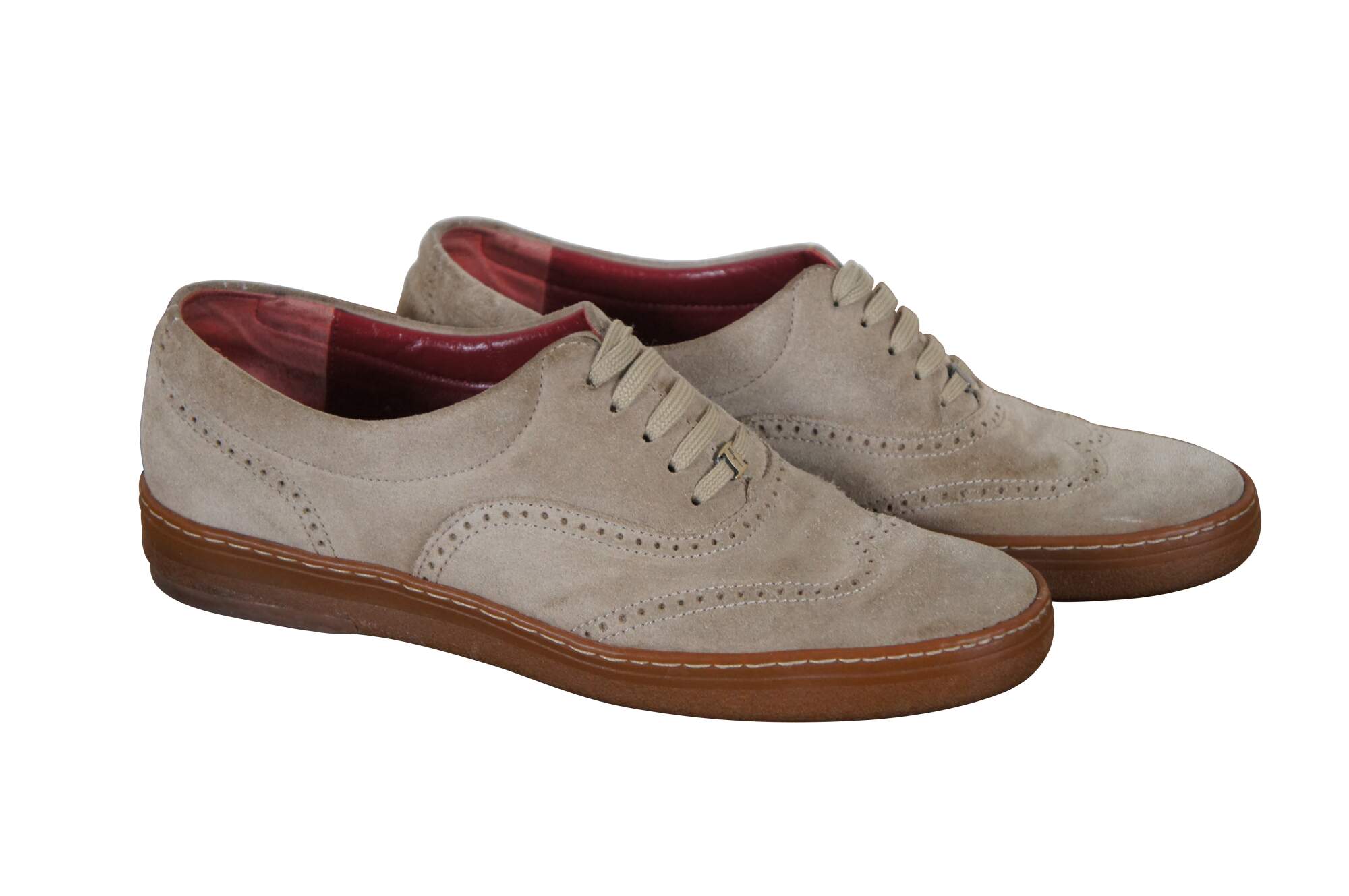 Two vintage pairs of Salvatore Ferragamo Montana tennis shoes in brouge design with suede buc calf leather. In black nero and taupe quartz / tan. Size 6.5 AAAA. Made in Italy. MSRP $225 each. Wingtip, Oxford.